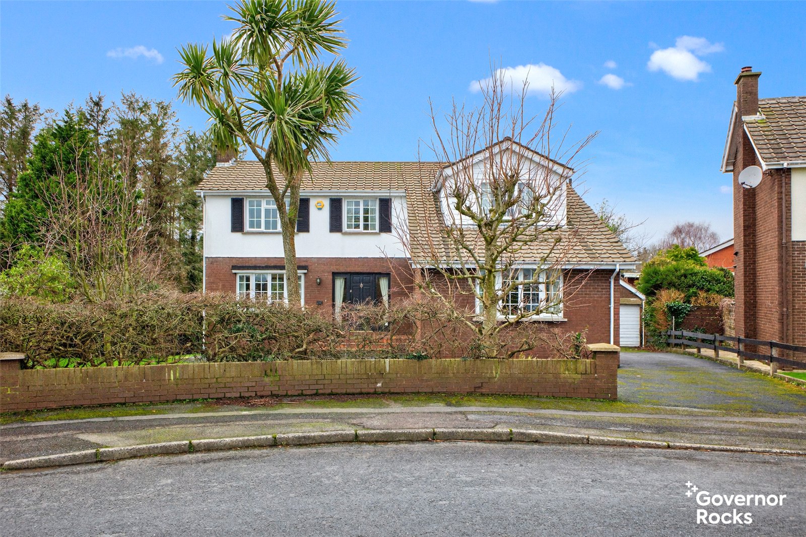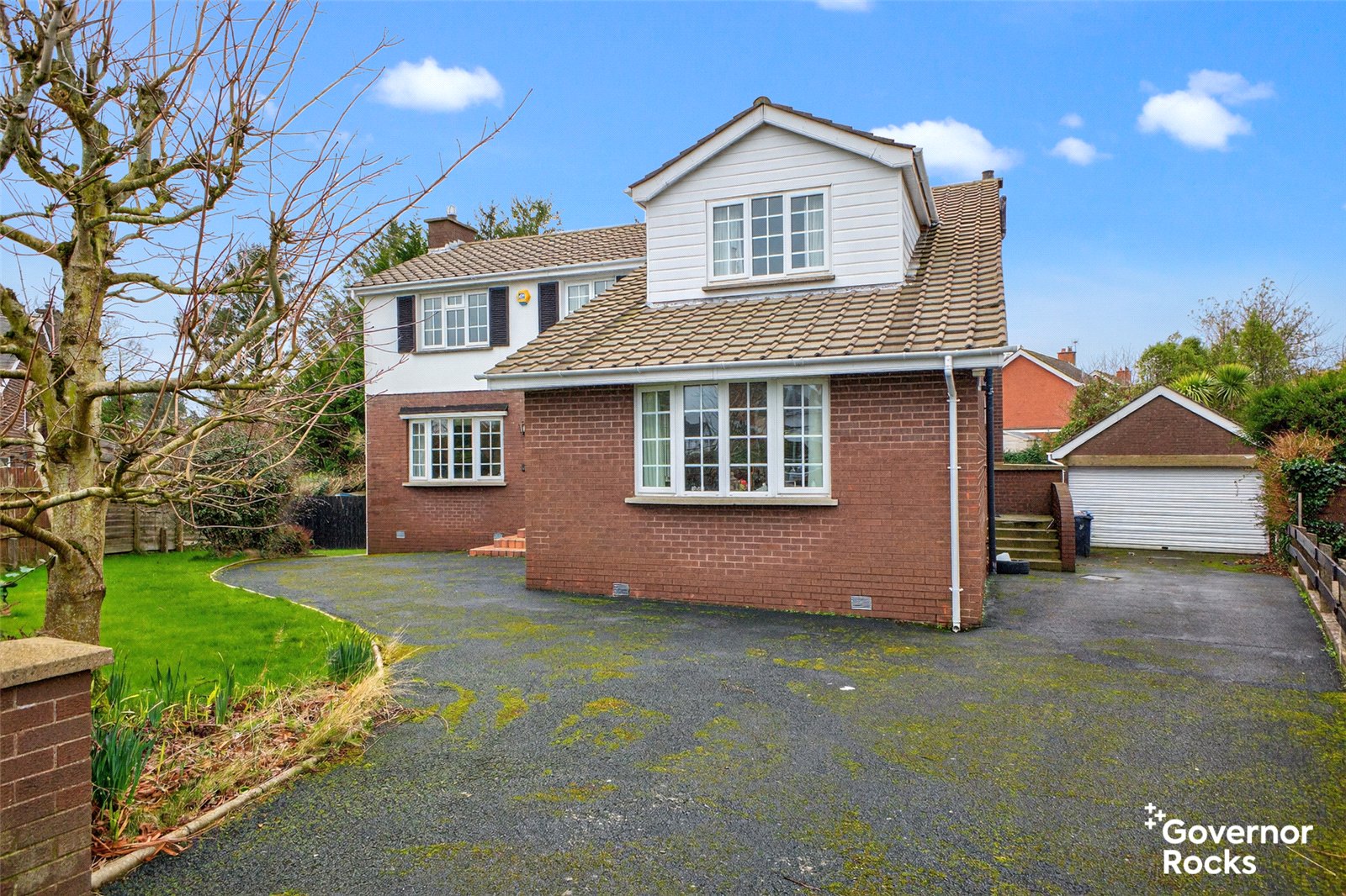 Externally, the property is approached via a large tarmac driveway providing ample parking for several vehicles and leading to a substantial detached garage. The front garden is mainly laid in lawn and enhanced by mature shrubs, while the fully enclosed rear garden is also laid in lawn, offering a safe and private space for children to play and outdoor enjoyment. The unique backdrop onto the golf course further enhances the sense of privacy and openness.