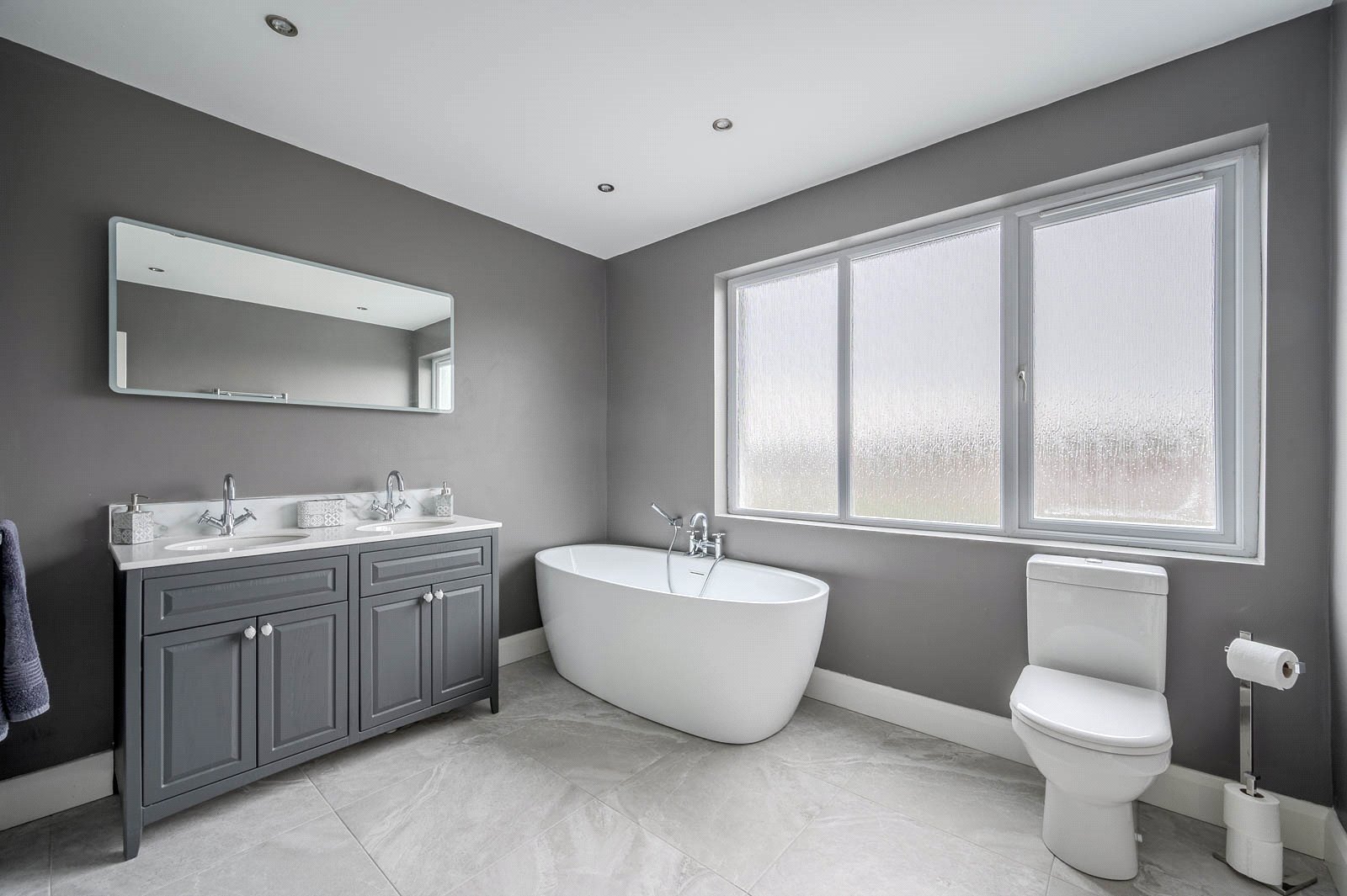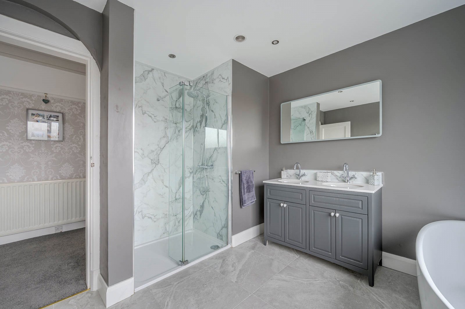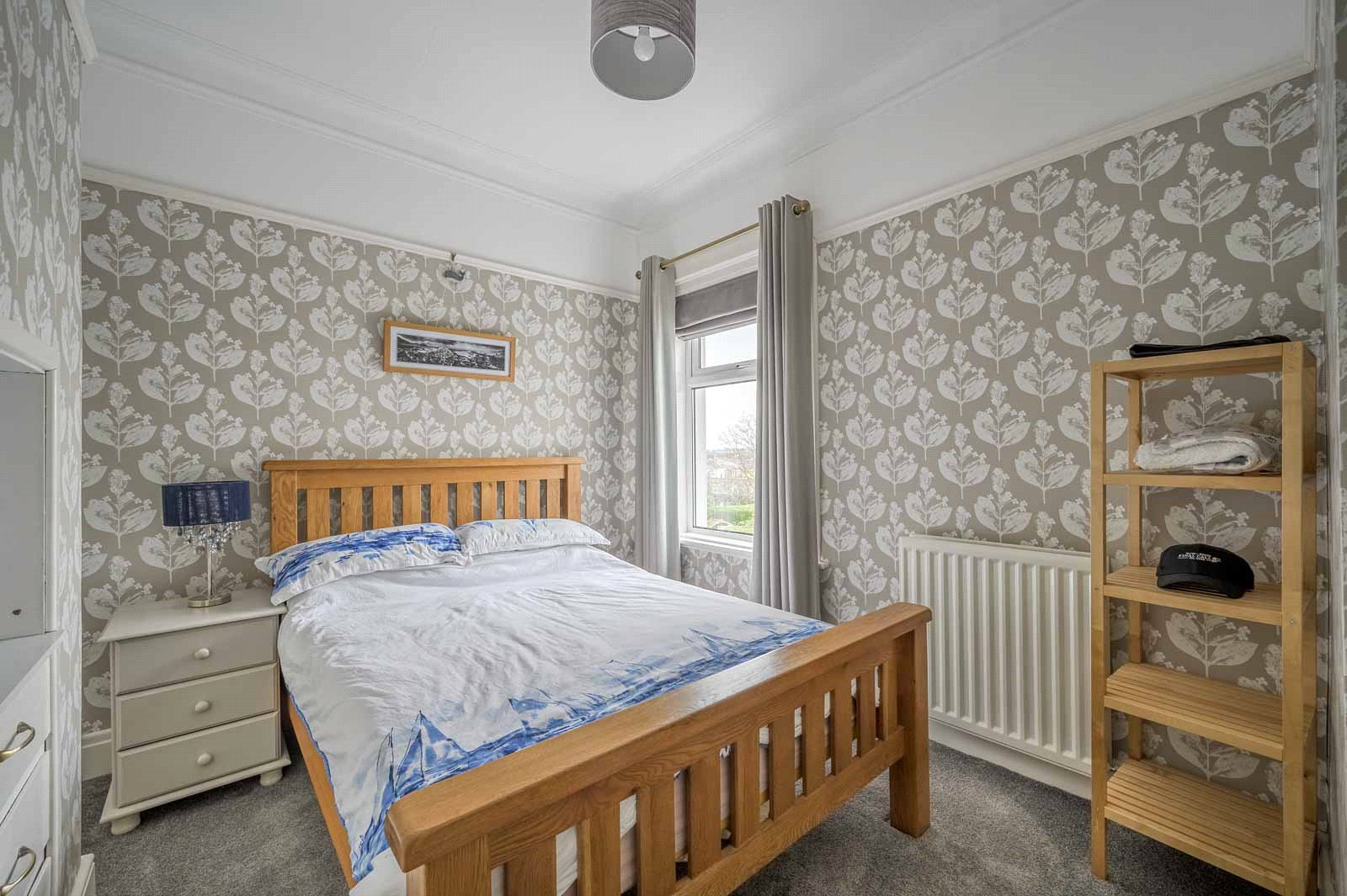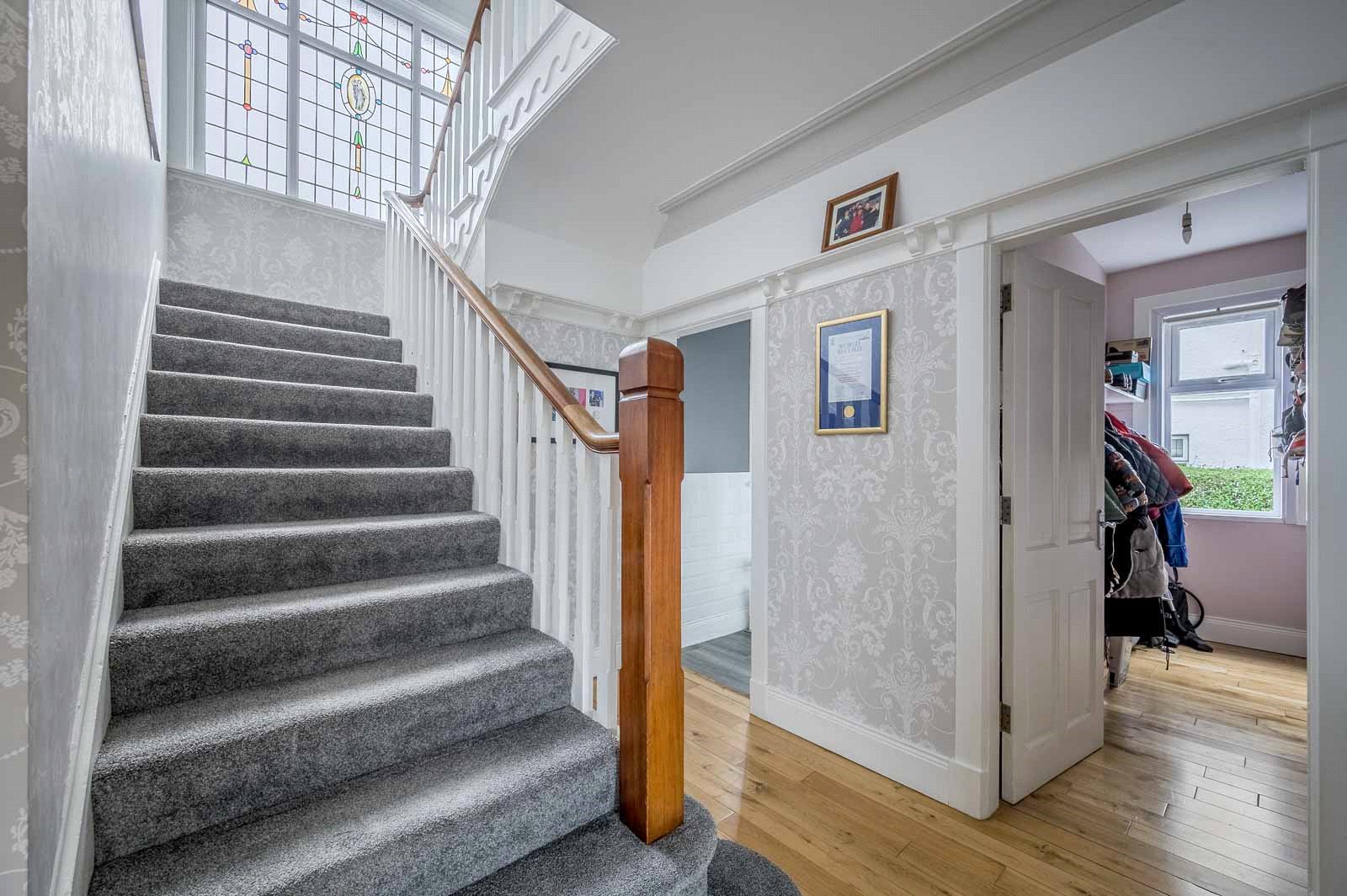 Ascending the feature switch-back staircase, illuminated by a charming original stained glass window that has been sensitively modernised with double glazing, the first floor reveals five well-proportioned bedrooms. Two of these are particularly generous double rooms, ideal for growing families or guest accommodation. A spacious family bathroom serves the upper level, while an additional shower room on the ground floor ensures convenience during busy mornings.