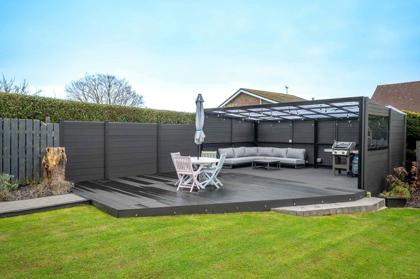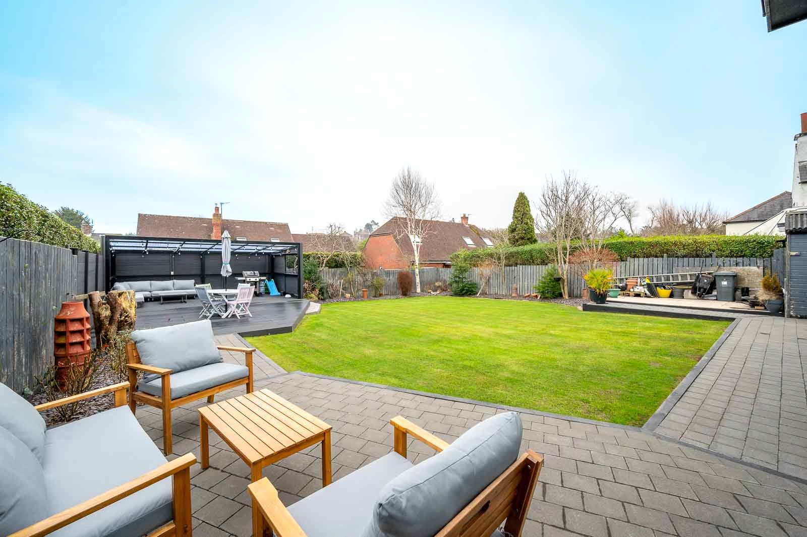 Externally, the south-east facing rear garden is a true highlight, enjoying sunlight throughout the day. Thoughtfully landscaped, it features a variety of seating areas, including patio and decking spaces, all set around a lush green lawn and mature planting. This private outdoor haven is perfectly suited for family enjoyment, al fresco dining, and summer entertaining.