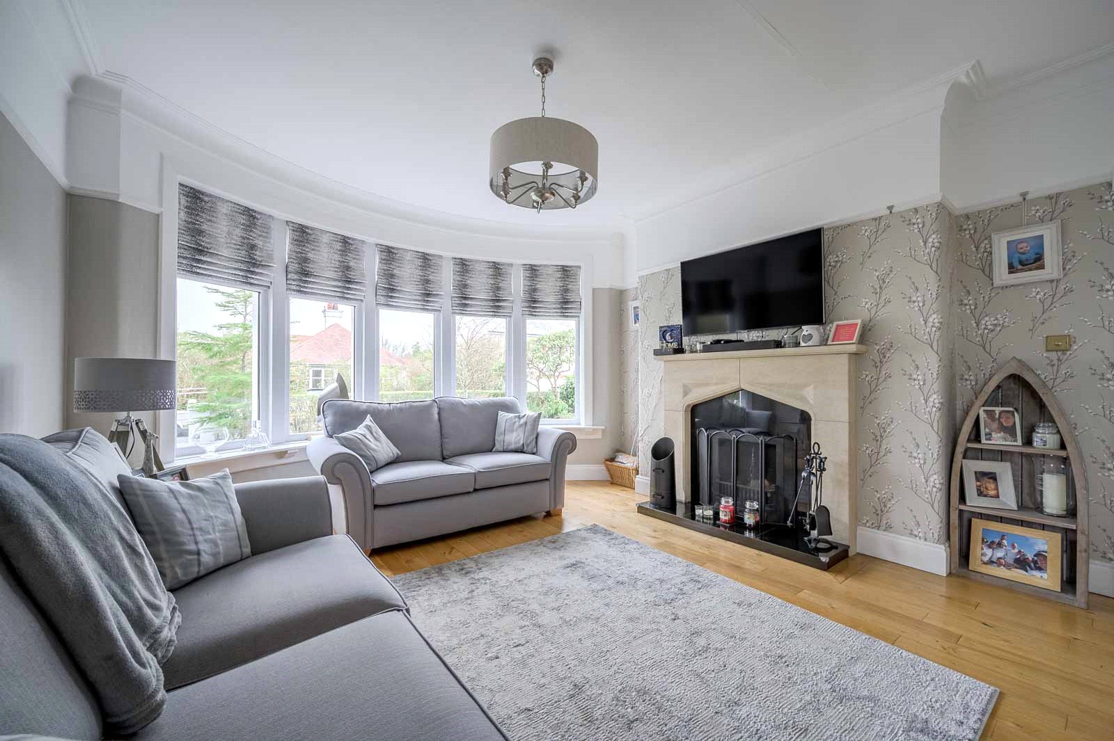 Stepping through the striking front entrance, you are welcomed into a bright and spacious reception hall where natural light pours in, setting the tone for the rest of the home. To the right, a formal lounge with a curved bay window and feature open fire offers a refined yet comfortable setting, while to the left, a second drawing room with dual aspect windows provides additional versatile living space, perfect for entertaining or relaxation.