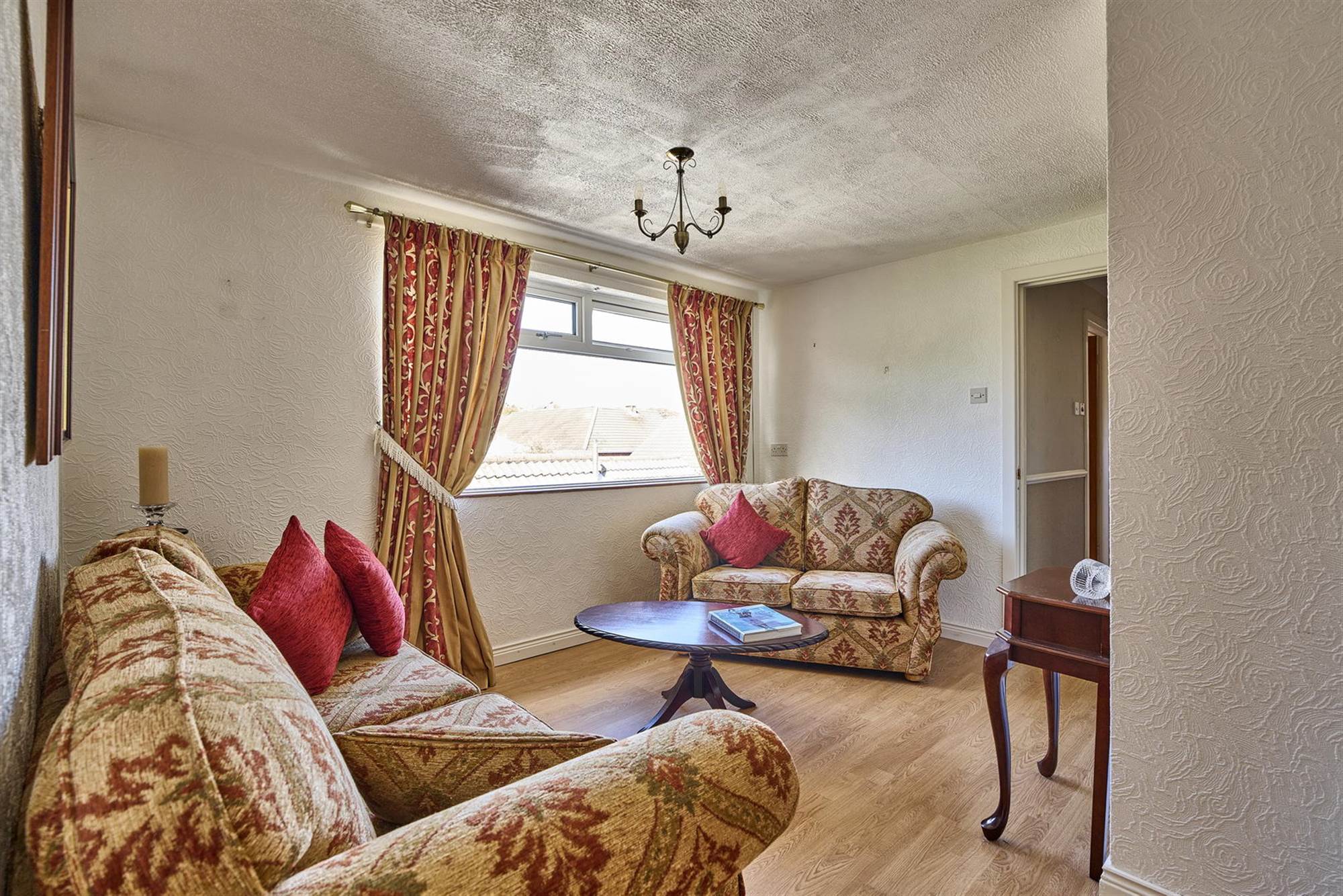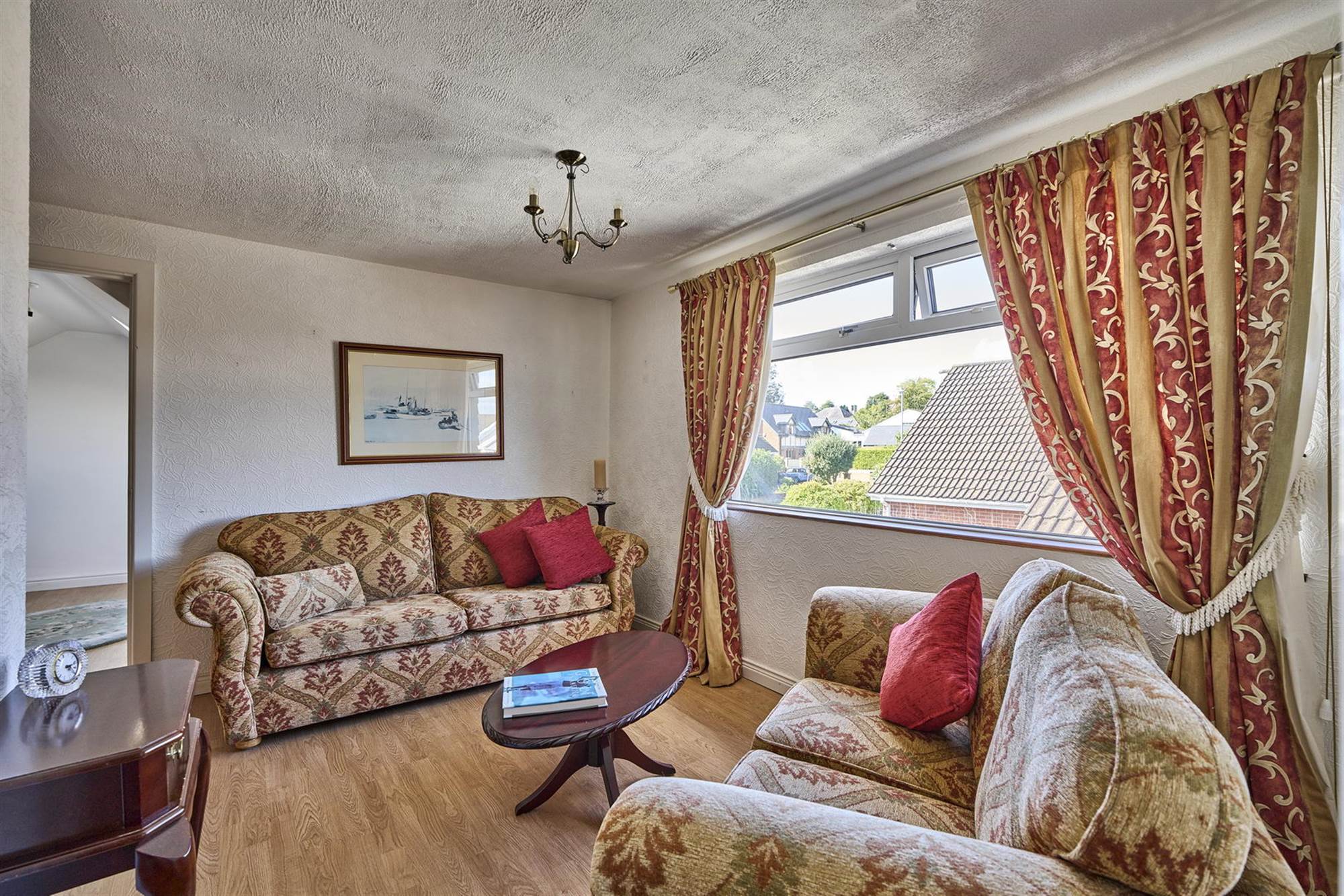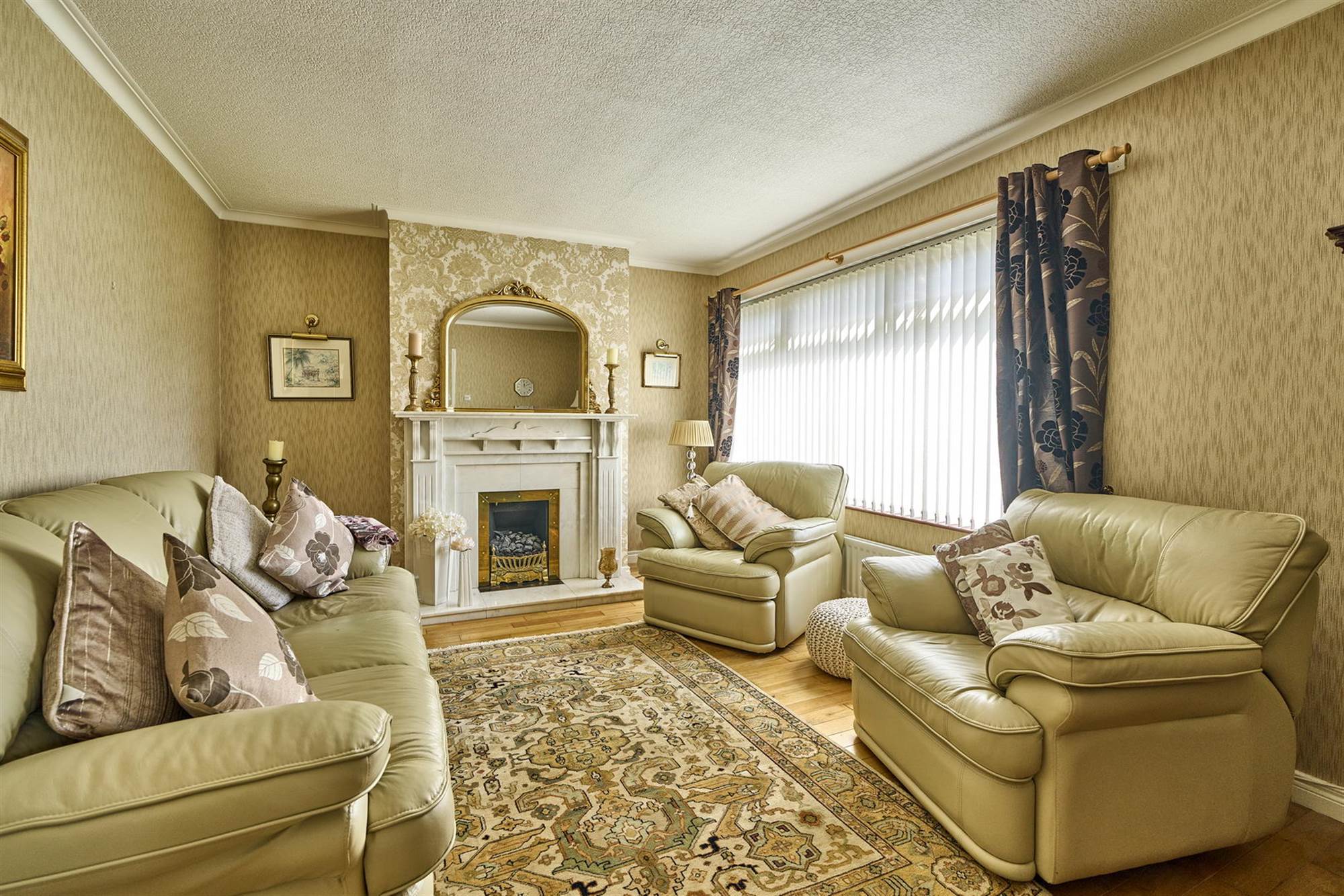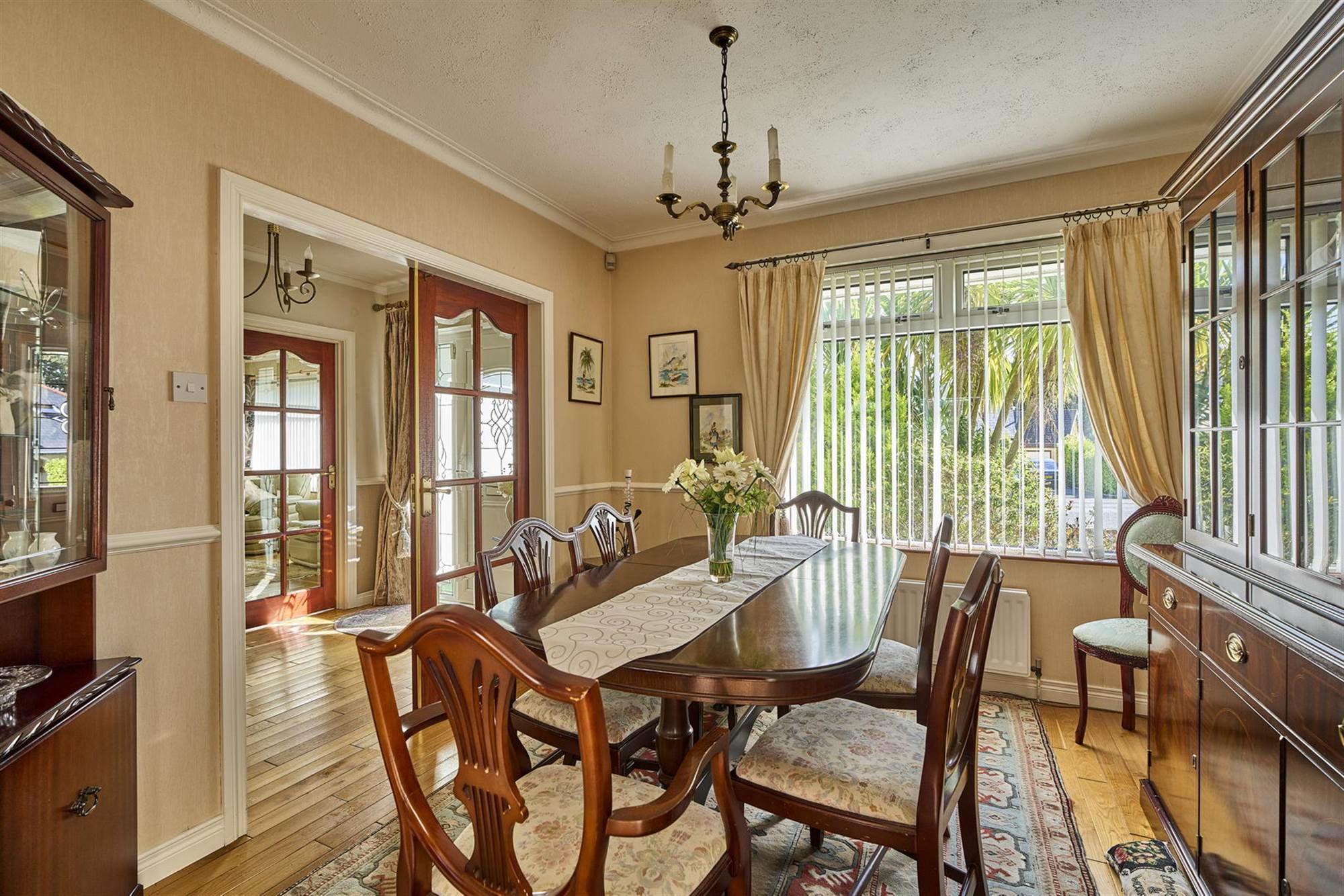 Solid wood floors, feature marble fireplace with inset electric fire, cornice ceiling. From hall double doors with bevelled glass to: