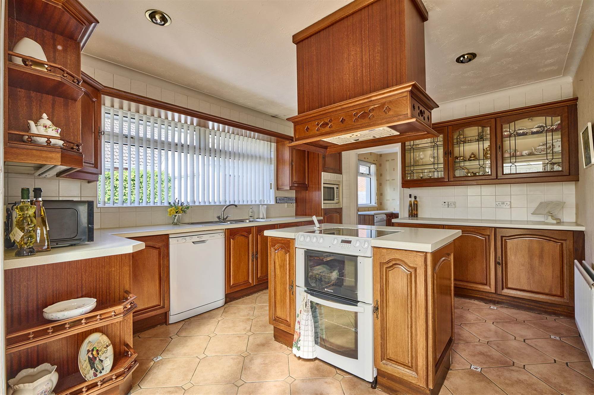 Range of high and low level cupboards, one and a half bowl stainless steel sink unit with drainer and mixer tap, plumbed for dishwasher, centre island with space for cooker, extractor fan. Ceramic tiled floor, part tiled walls, space for microwave. Double glazed sliding door to: