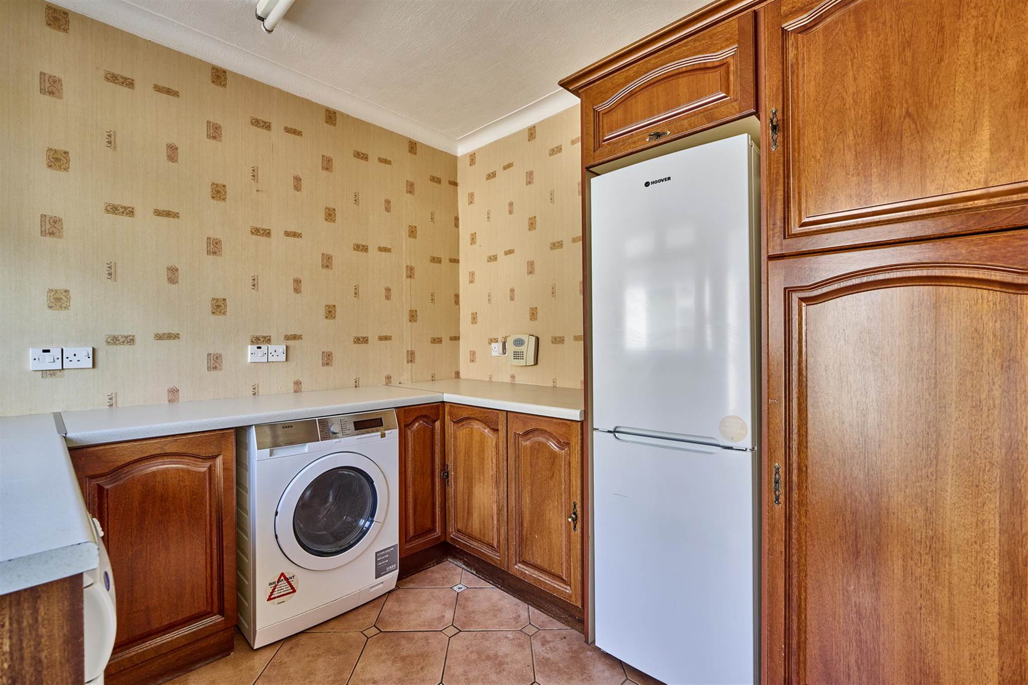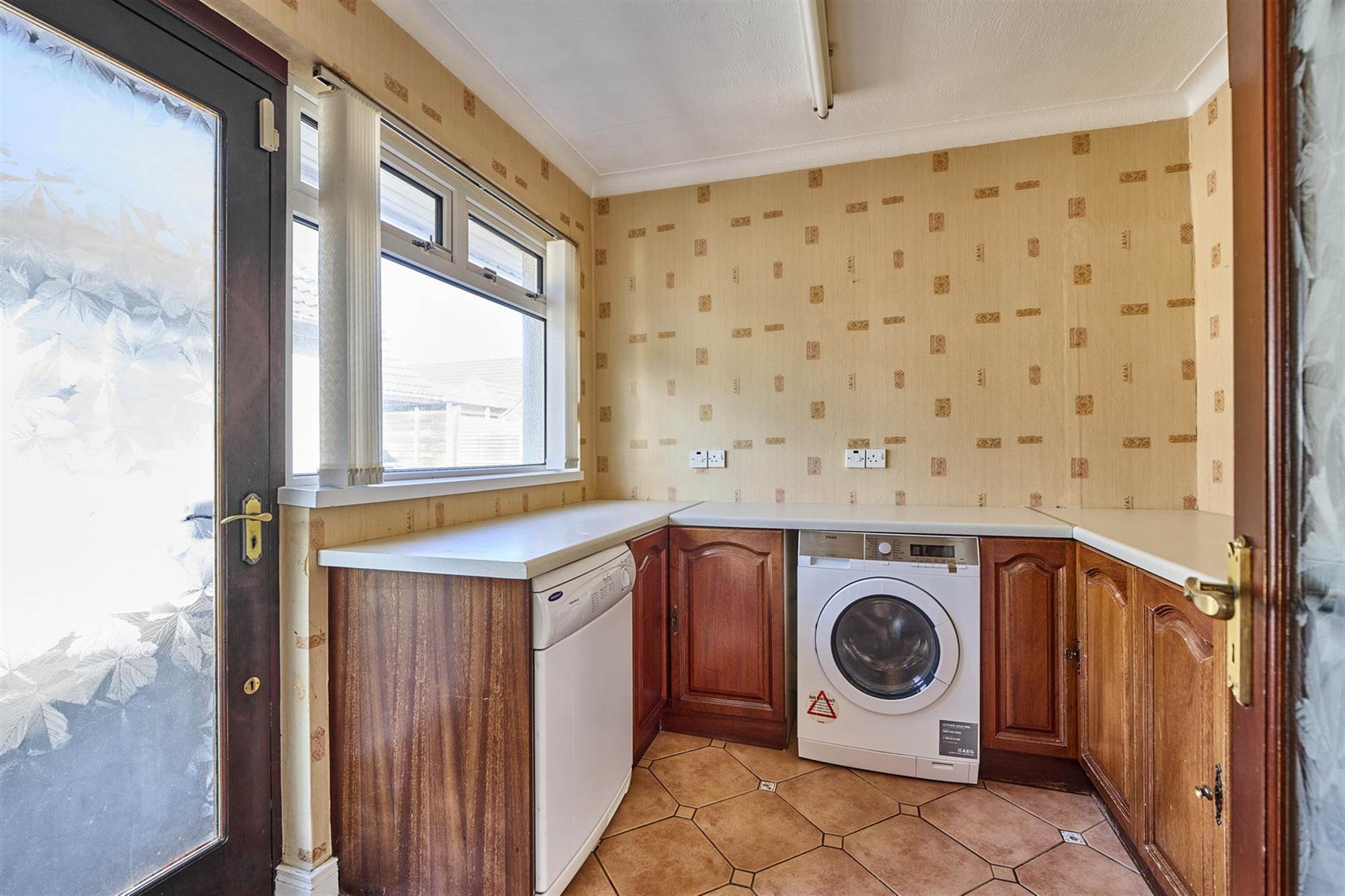 Range of low level cupboards, plumbed for washing machine, space for fridge/freezer, space for tumble dryer. Door to back garden.