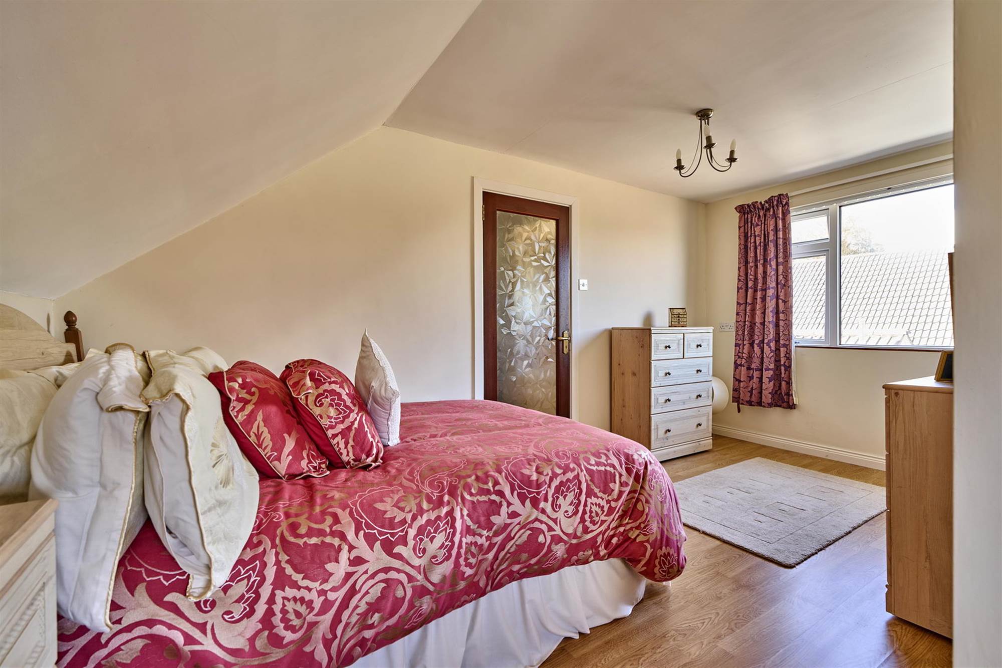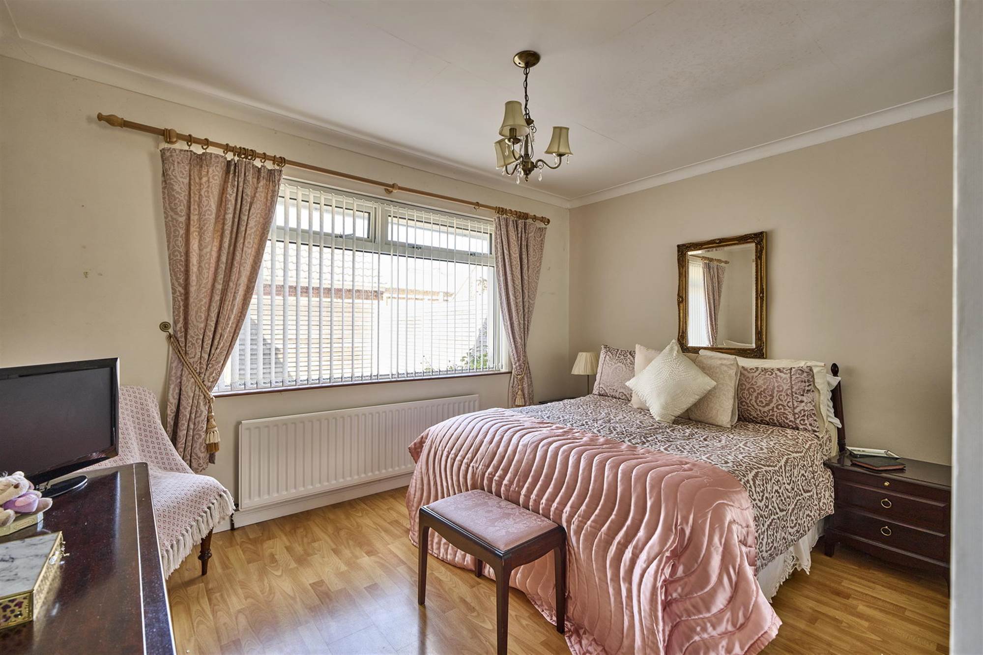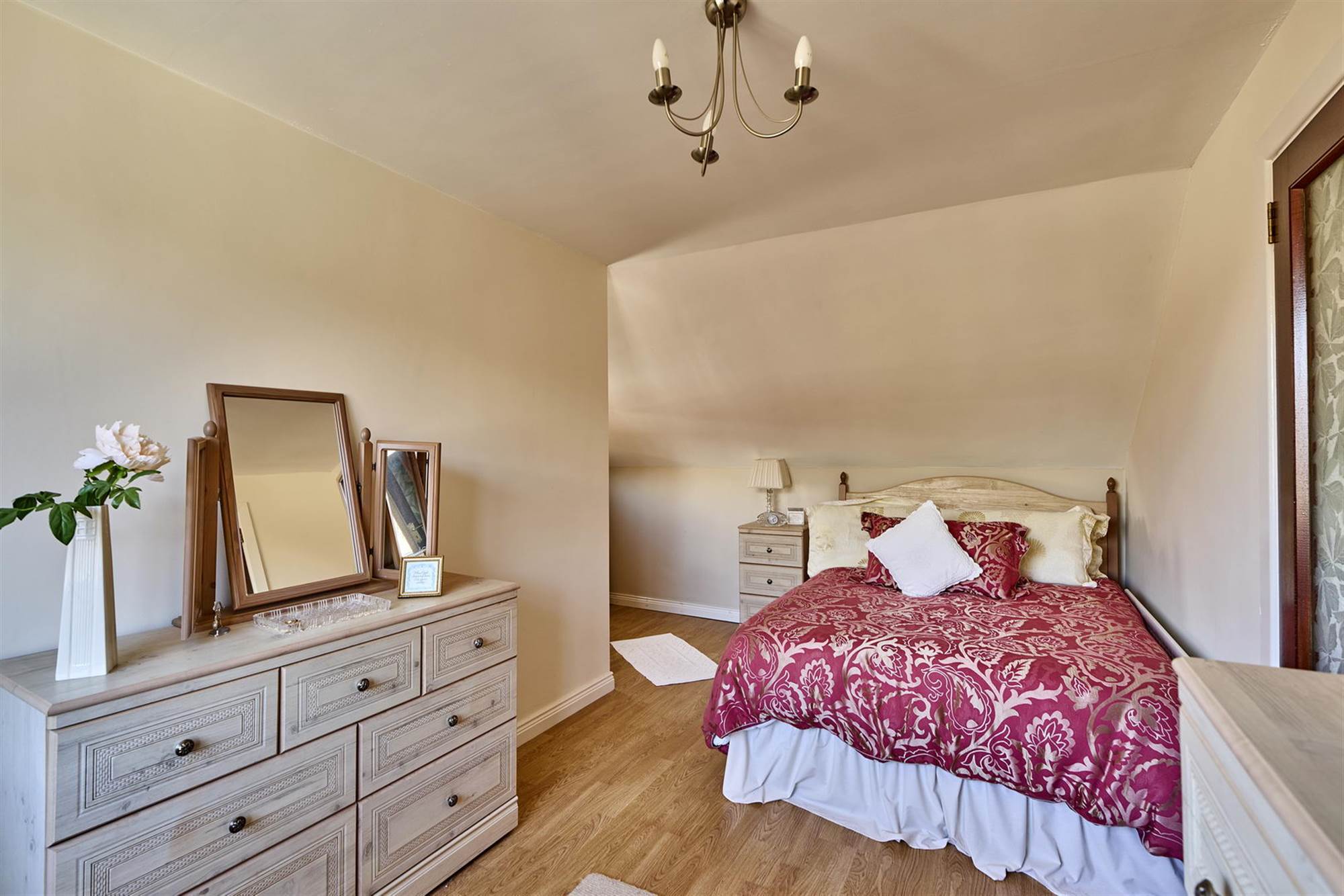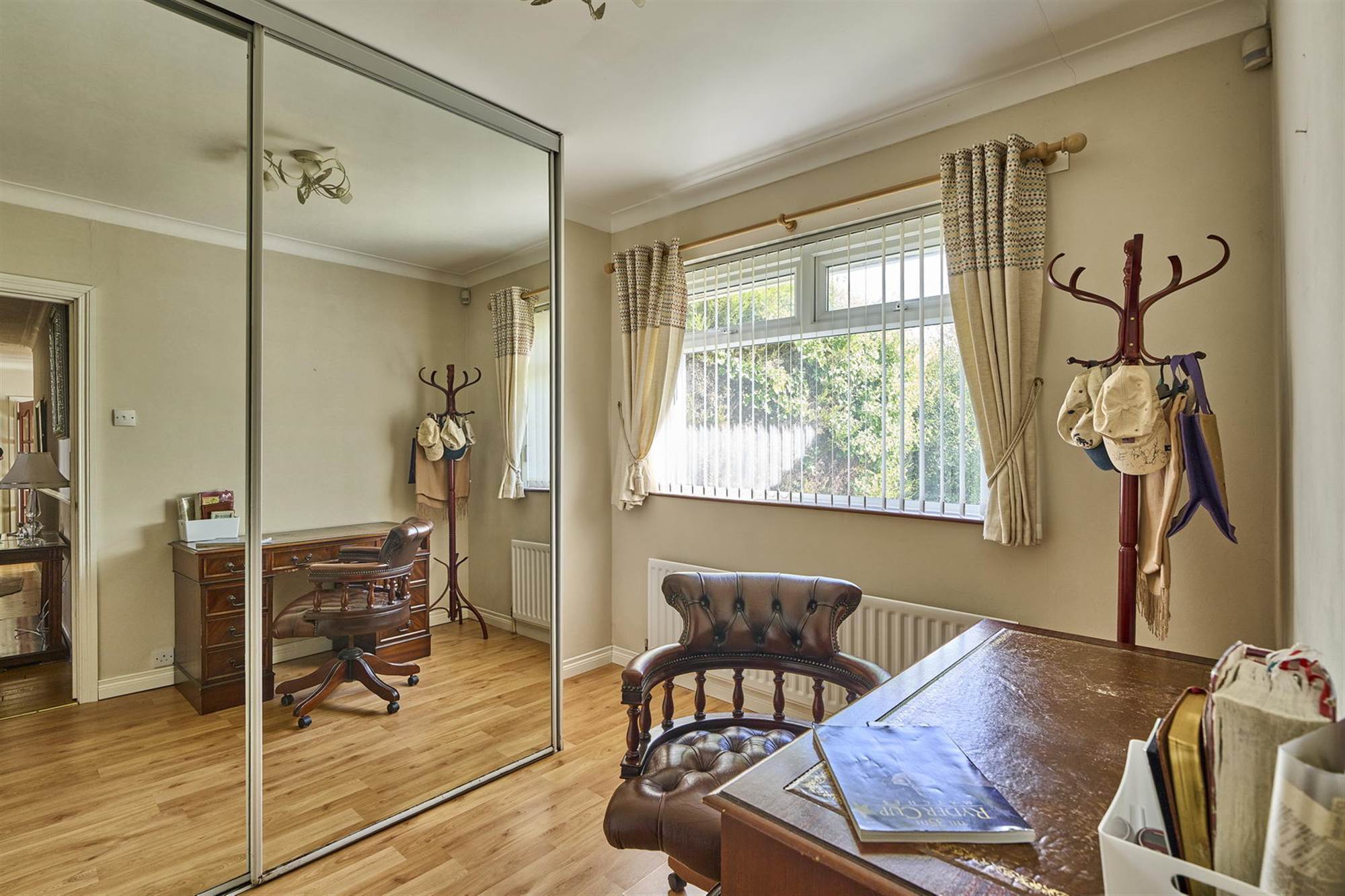 Built-in robes with sliding mirrored doors, laminate wood effect floor.