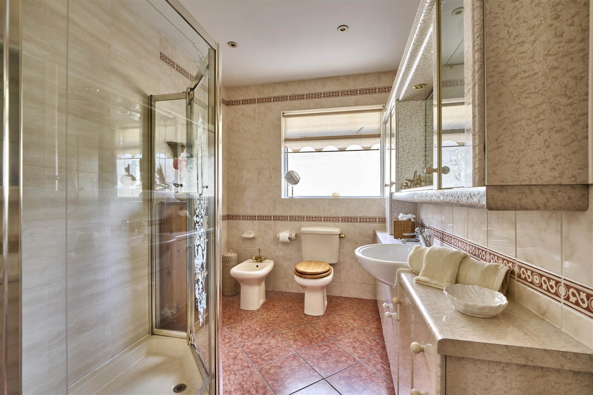 Corner shower enclosure with mains thermostatic shower, bidet, low flush wc, vanity wash hand basin, tiled walls, ceramic tiled floor.