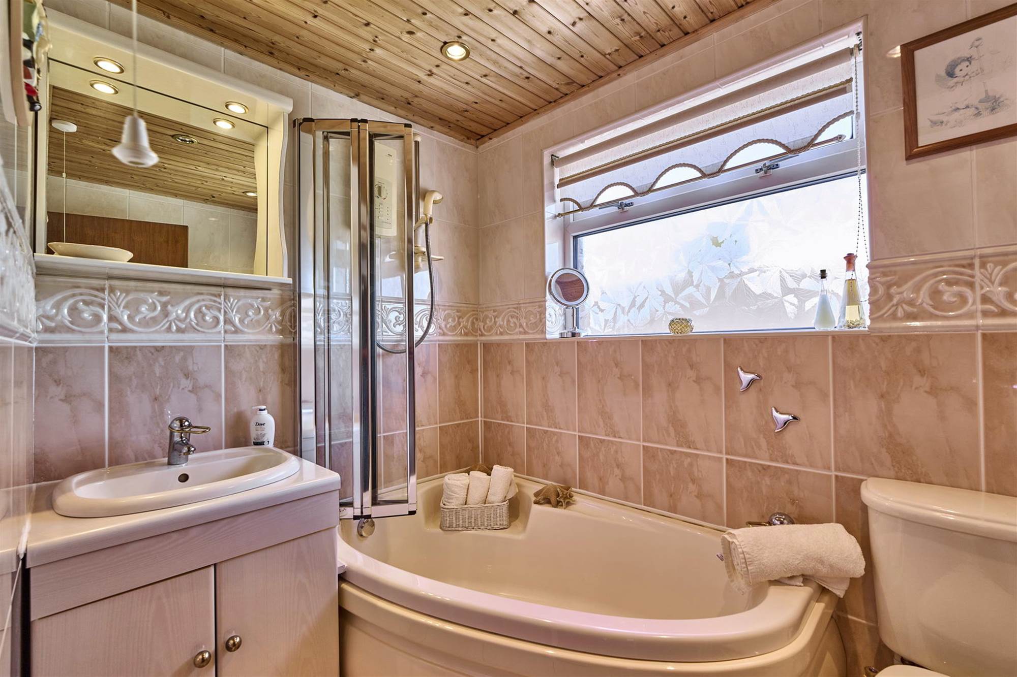 Corner panelled bath with electric shower over, low flush wc, vanity wash hand basin, tiled walls, tongue and groove ceiling with recessed lighting. Ceramic tiled floor.