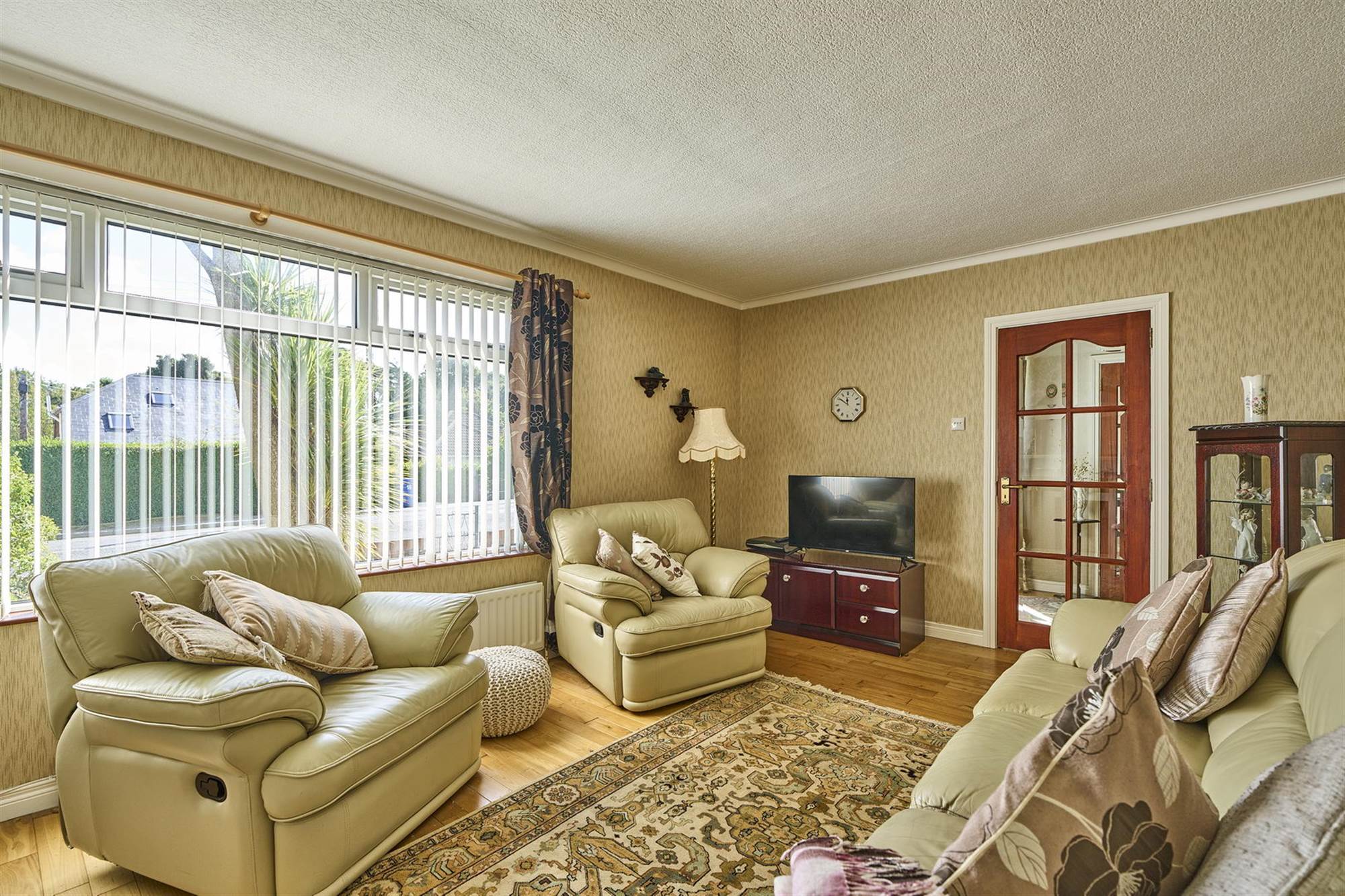 Glazed uPVC door with glazed side lights, solid wood floors, cornice ceiling, dado rail. Hotpress with hot water cylinder. From hall, glazed door to:
