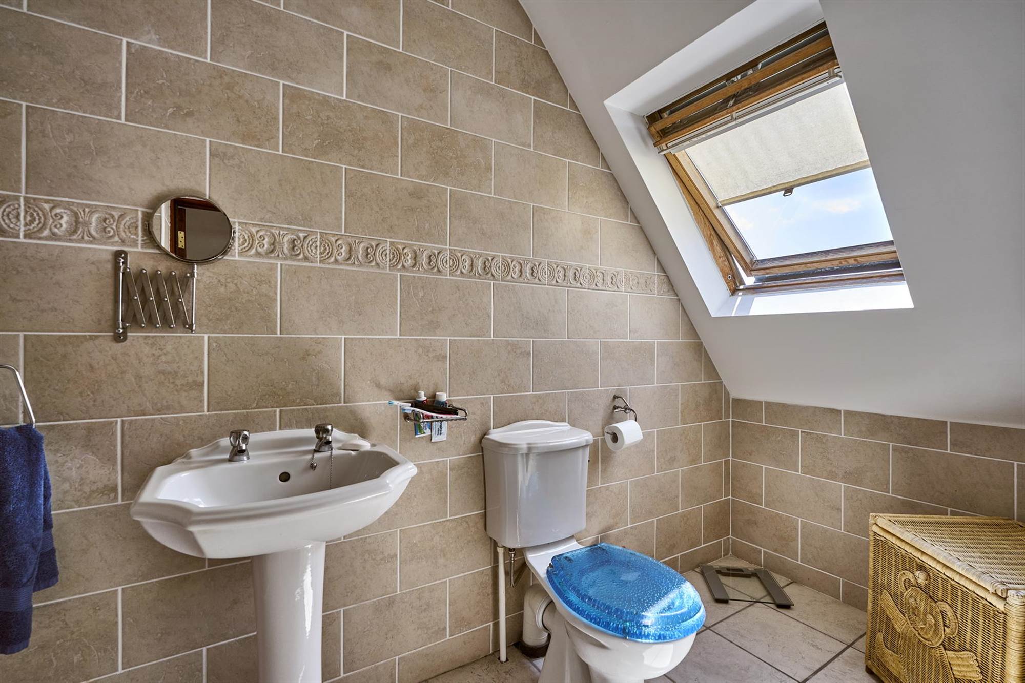 Fully tiled built-in shower cubicle with thermostatic controlled shower unit, pedestal wash hand basin, low flush wc, fully tiled walls, ceramic tiled floor, extractor fan, Velux window.