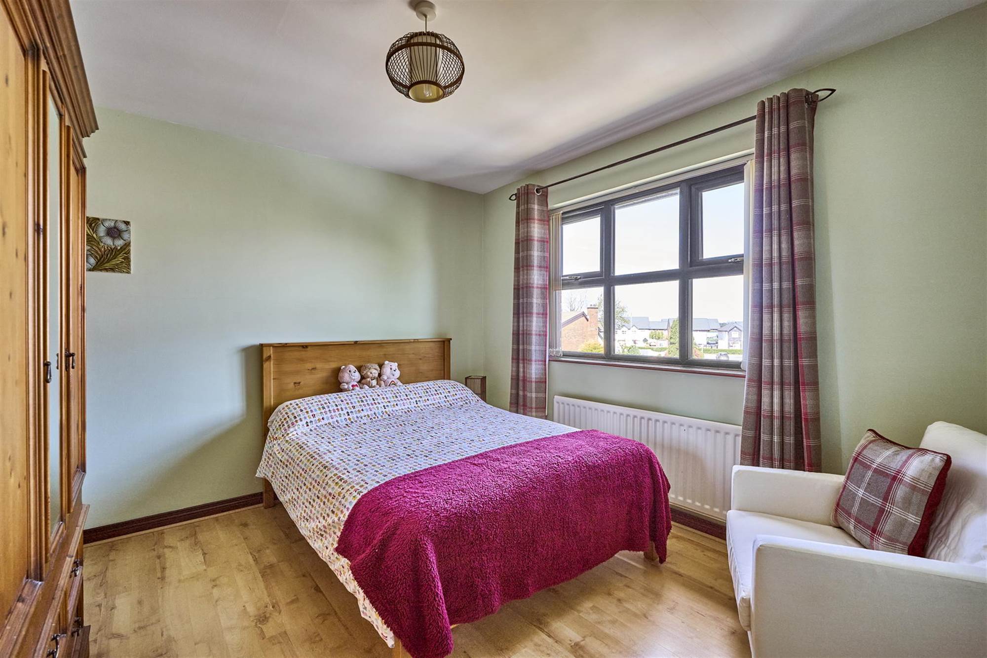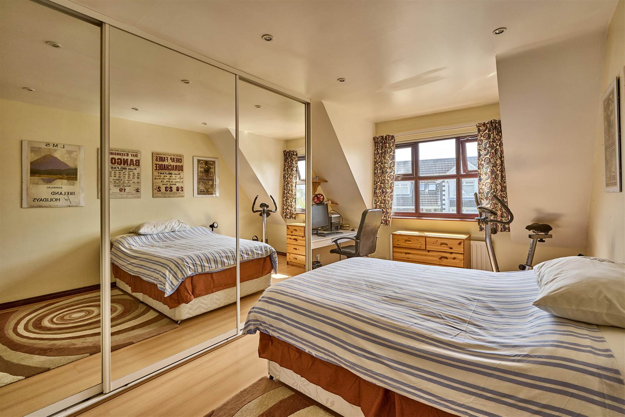 Wall-to-wall built-in robes with mirrored sliding doors. Oak effect laminate wooden floor.
