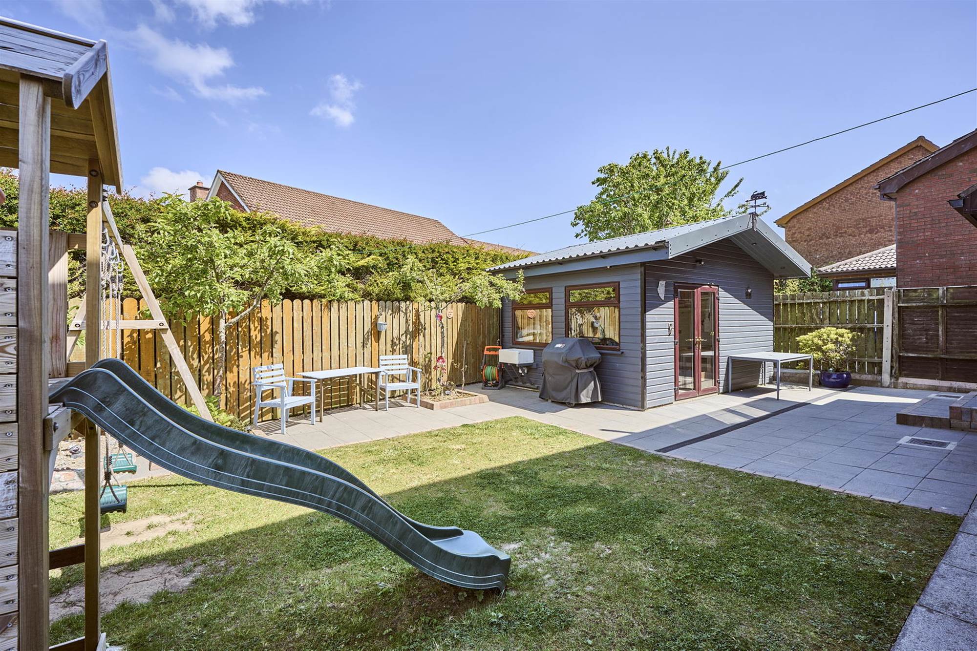 Enclosed rear garden in lawn with side patio