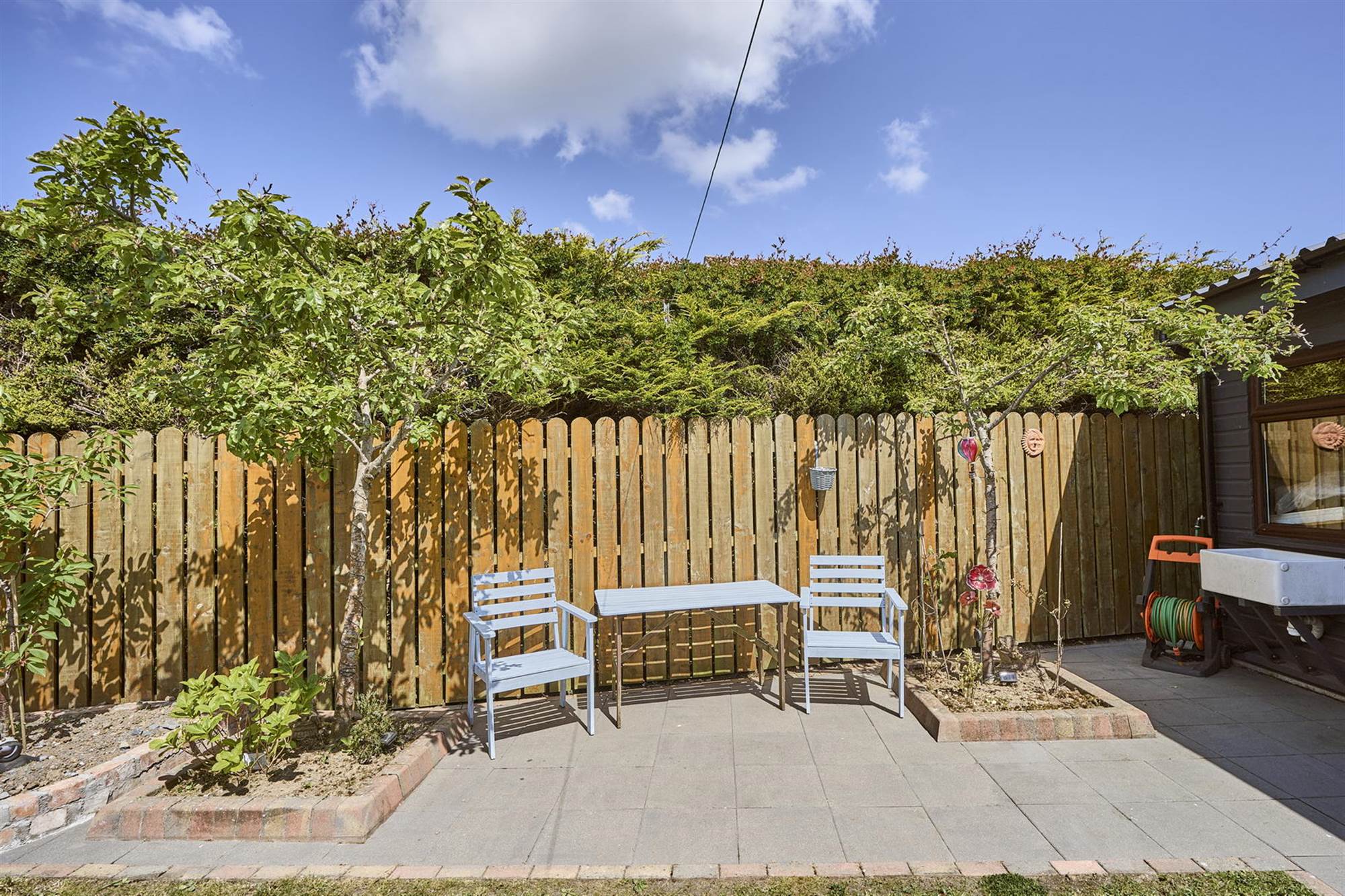 Enclosed rear garden bordered by fencing. Paved patio leading to lawn, variety of fruit trees. Paved area to side with timber shed. Outside tap, sink, light and power points.