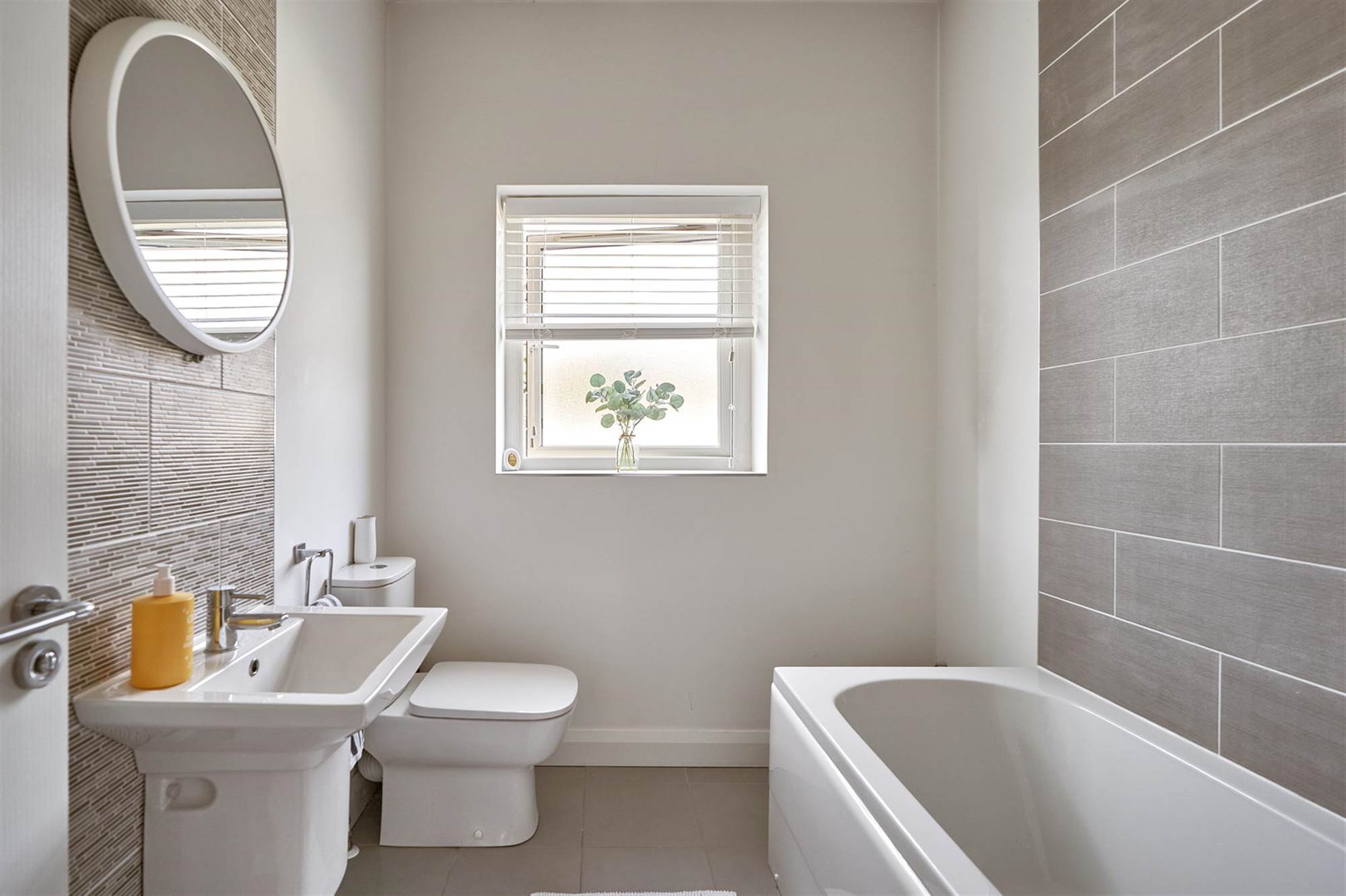 White bathroom suite comprising panelled bath with mixer tap and mains shower unit, wall mounted wash hand basin with mixer tap and tiled splashback, low flush WC, ceramic tiled floor, extractor fan.