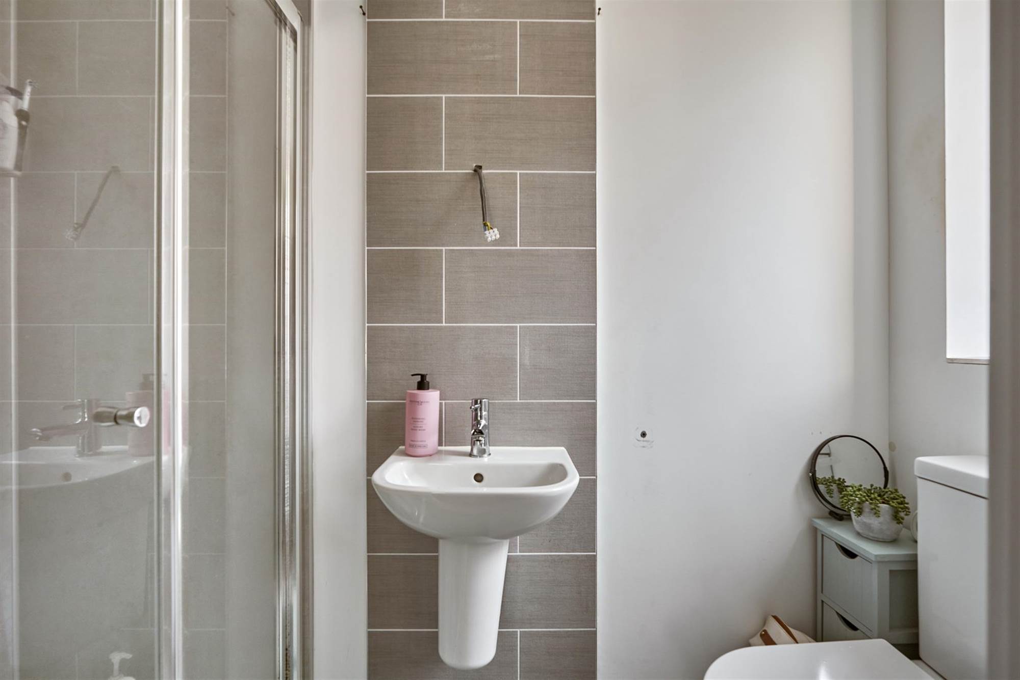 Panelled shower cubicle with mains shower unit, wash hand basin with mixer tap and tiled splashback, low flush WC, heated towel rail, ceramic tiled floor, extractor fan.