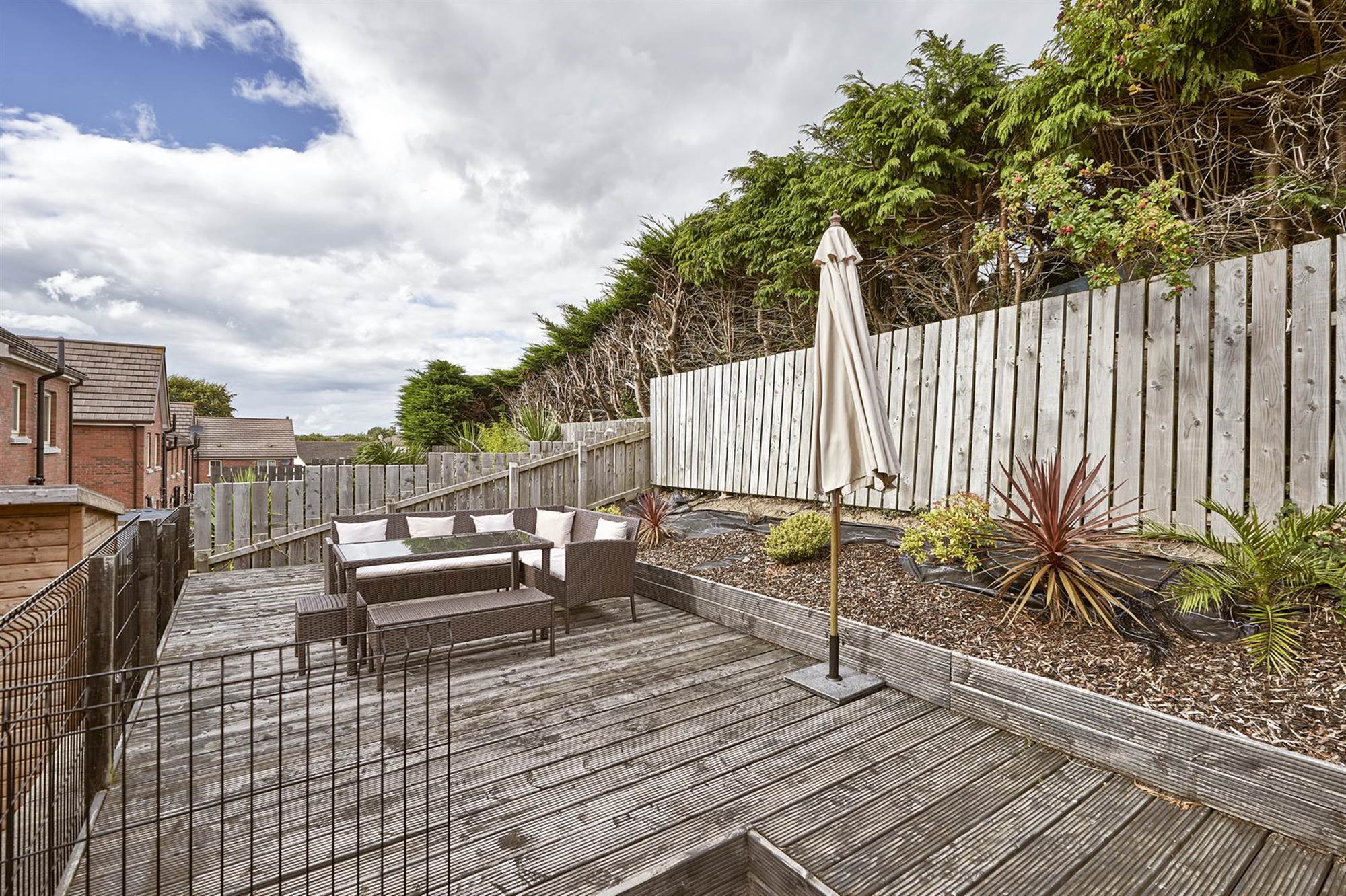 Enclosed, low maintenance rear garden. Paved area with timber shed. Steps to raised timber decked area with shrub border and fencing.