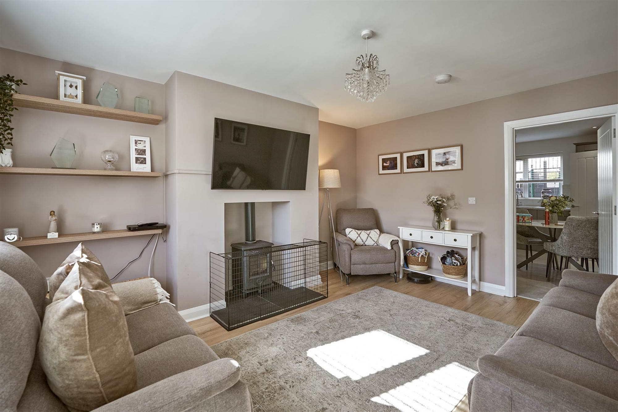 English oak effect laminate wood flooring, feature wood burning stove with slate hearth.