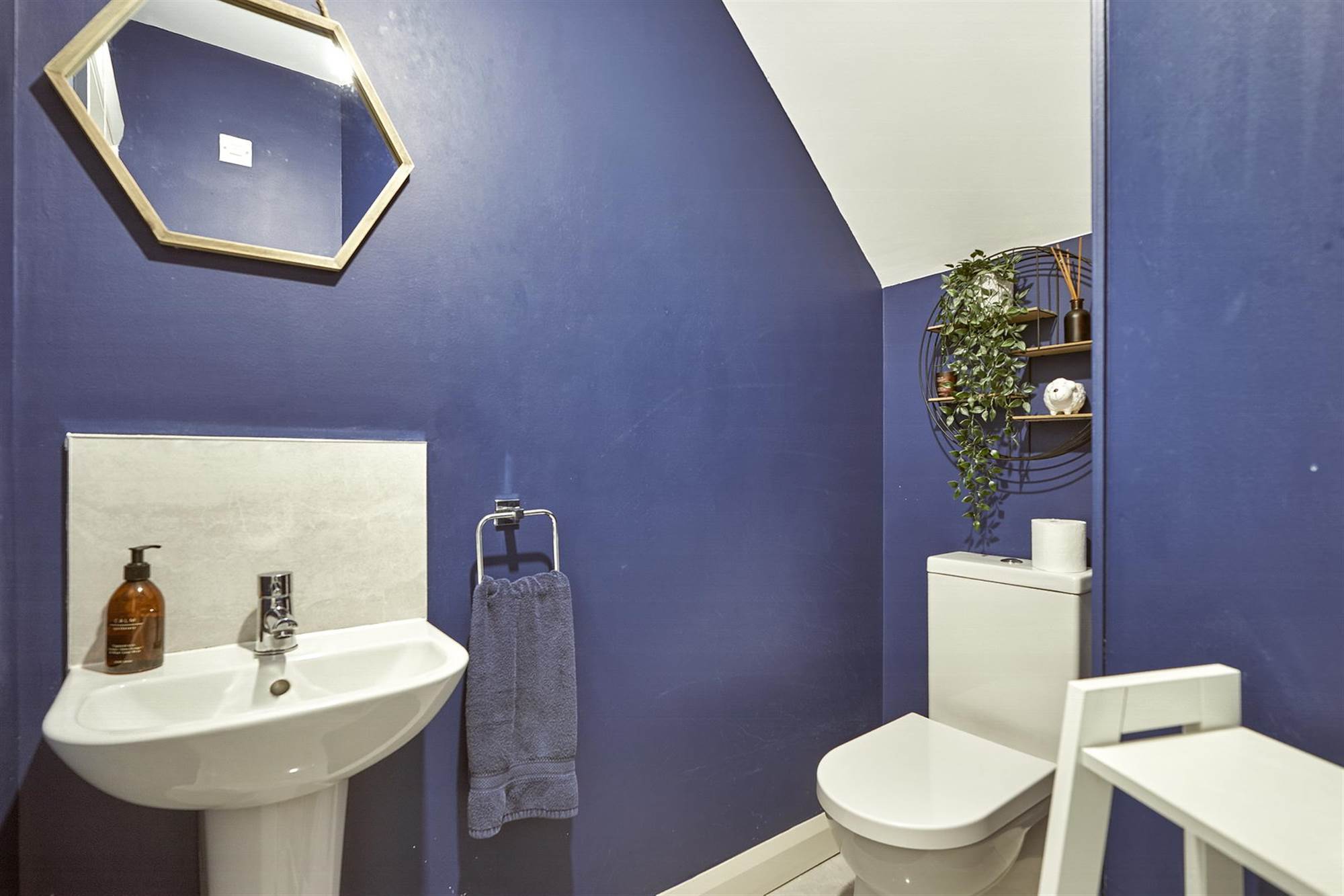 Low flush WC, wall mounted wash hand basin with mixer tap and tiled splashback, ceramic tiled floor, extractor fan.