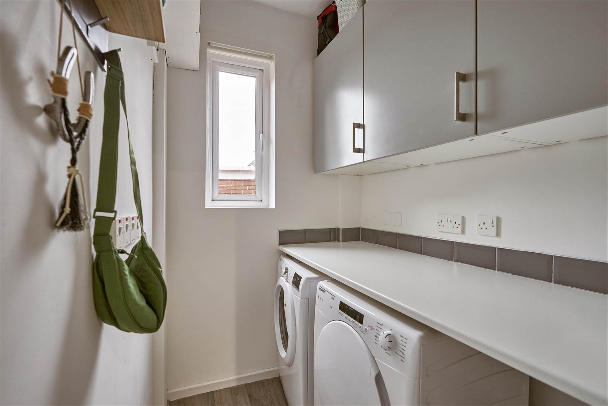 Plumbed for washing machine, space for tumble dryer, range of units, lamiante wood effect flooring.