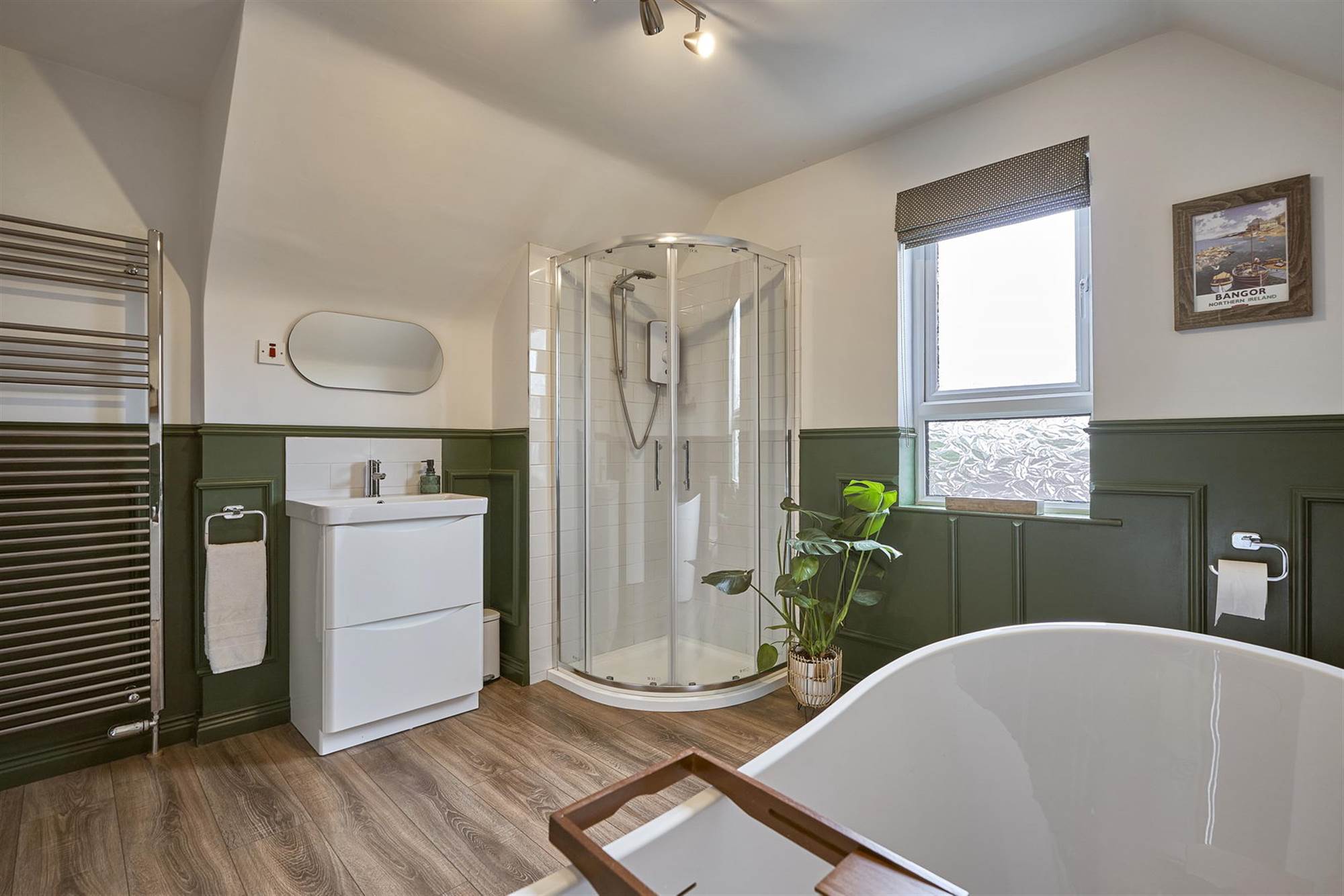 White bathroom suite comprising free-standing bath with mixer tap, telephone hand shower, low flush wc, separate fully tiled shower cubicle with Triton electric shower. Wash stand with drawers below. Heated towel rail, laminate wood effect floor, part wood panelled walls.