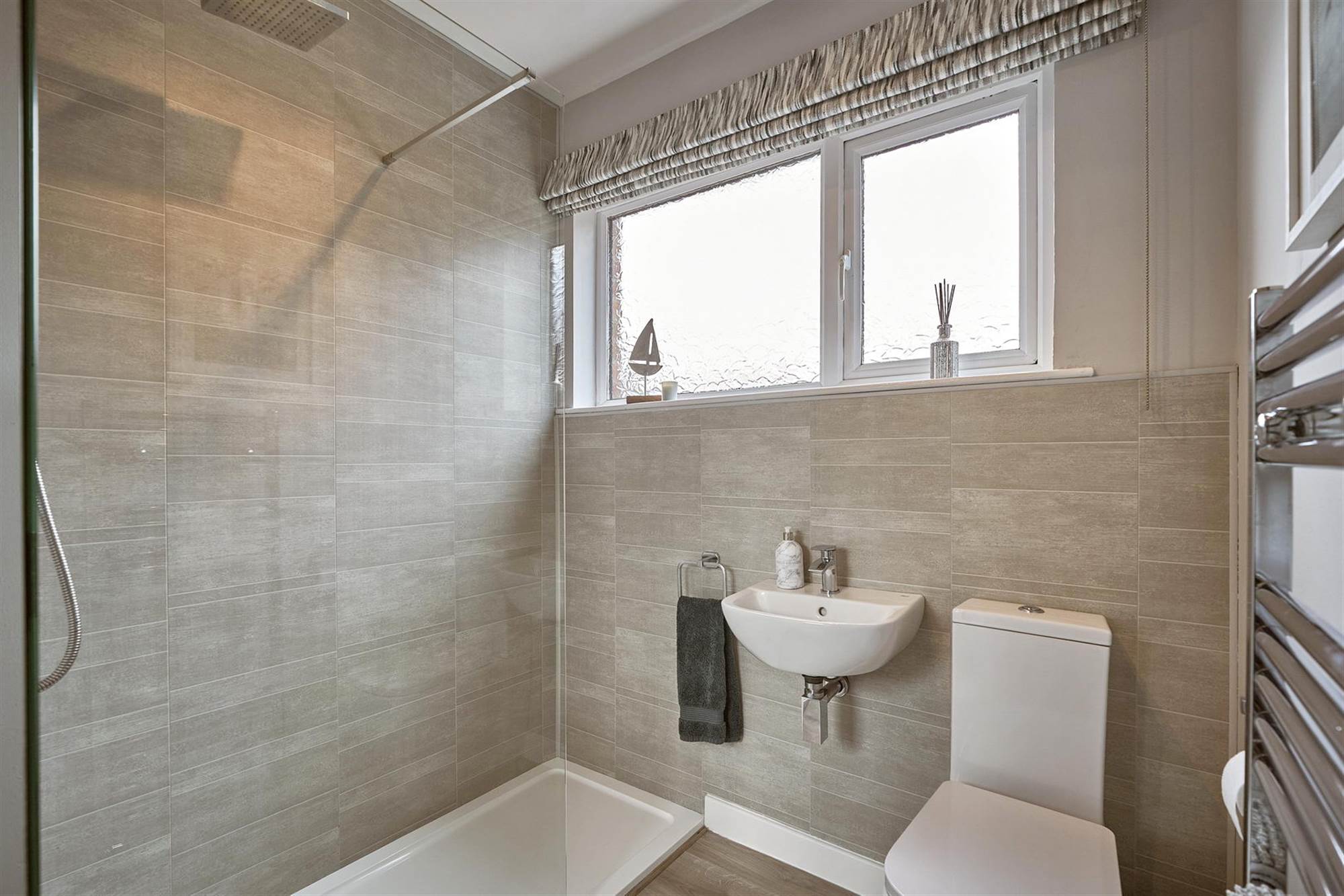 Walk-in shower cubicle with thermostatic shower unit and rain shower head, wash hand basin, low flush wc, laminate wood effect floor. Tiled effect panelled walls, heated towel rail, extractor fan.