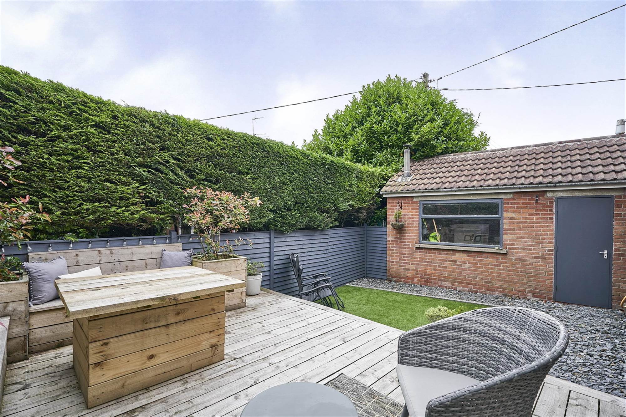 Brick pavior driveway with ample parking for several cars. Front garden and fully enclosed garden with decked terrace with bench seating and table. Outside tap, plastic oil tank. Artificial grass area.