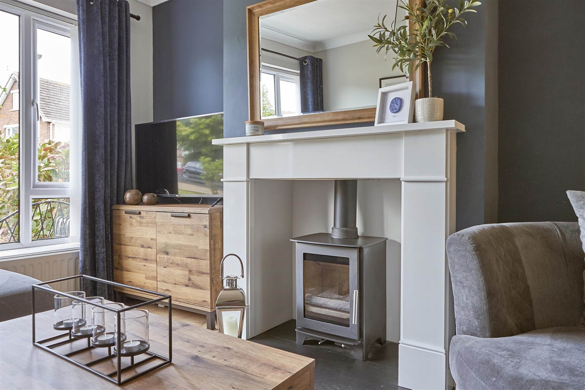 Living Room with "Heta" Cast Iron Stove & Open Plan to Dining Room