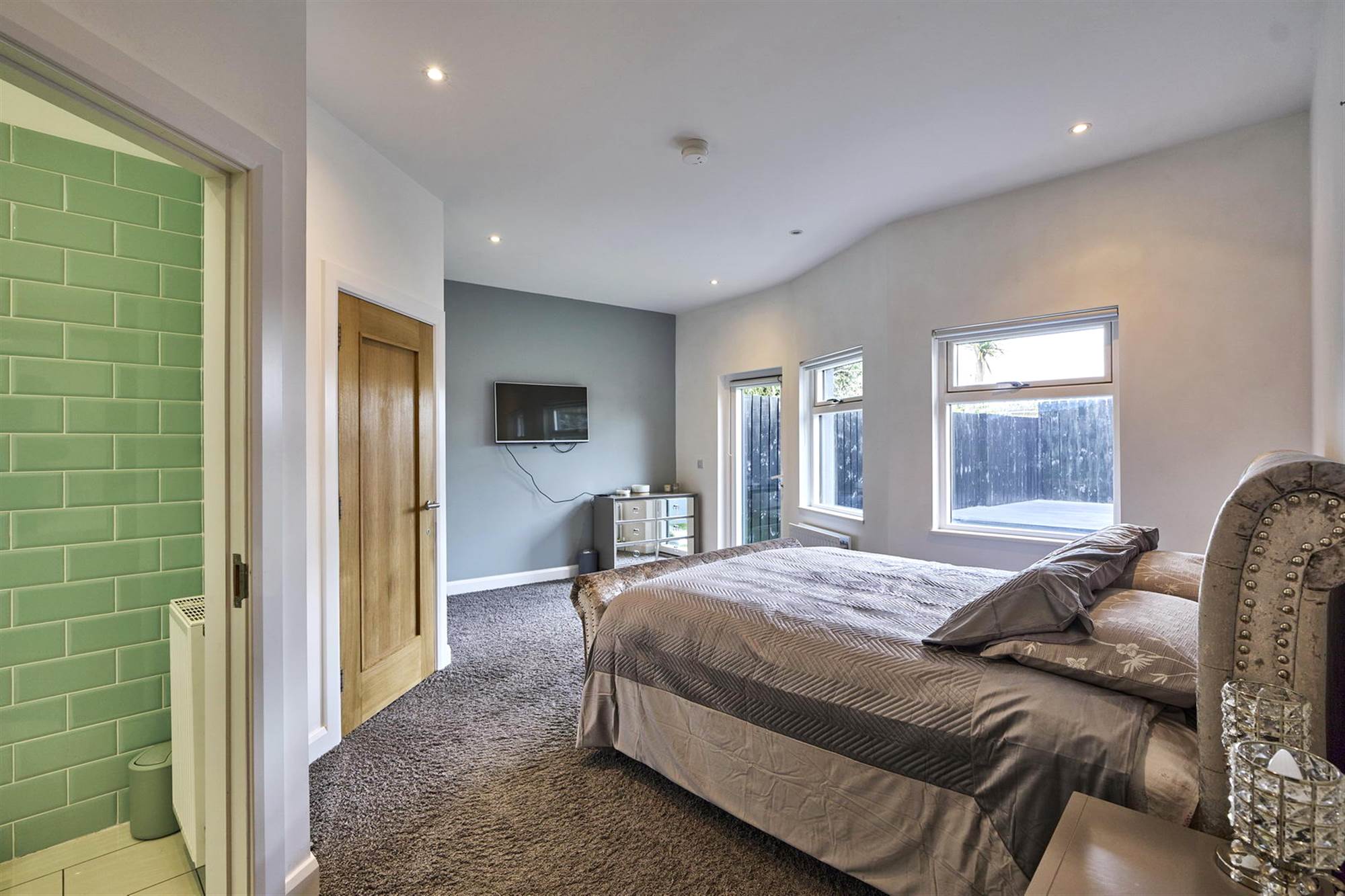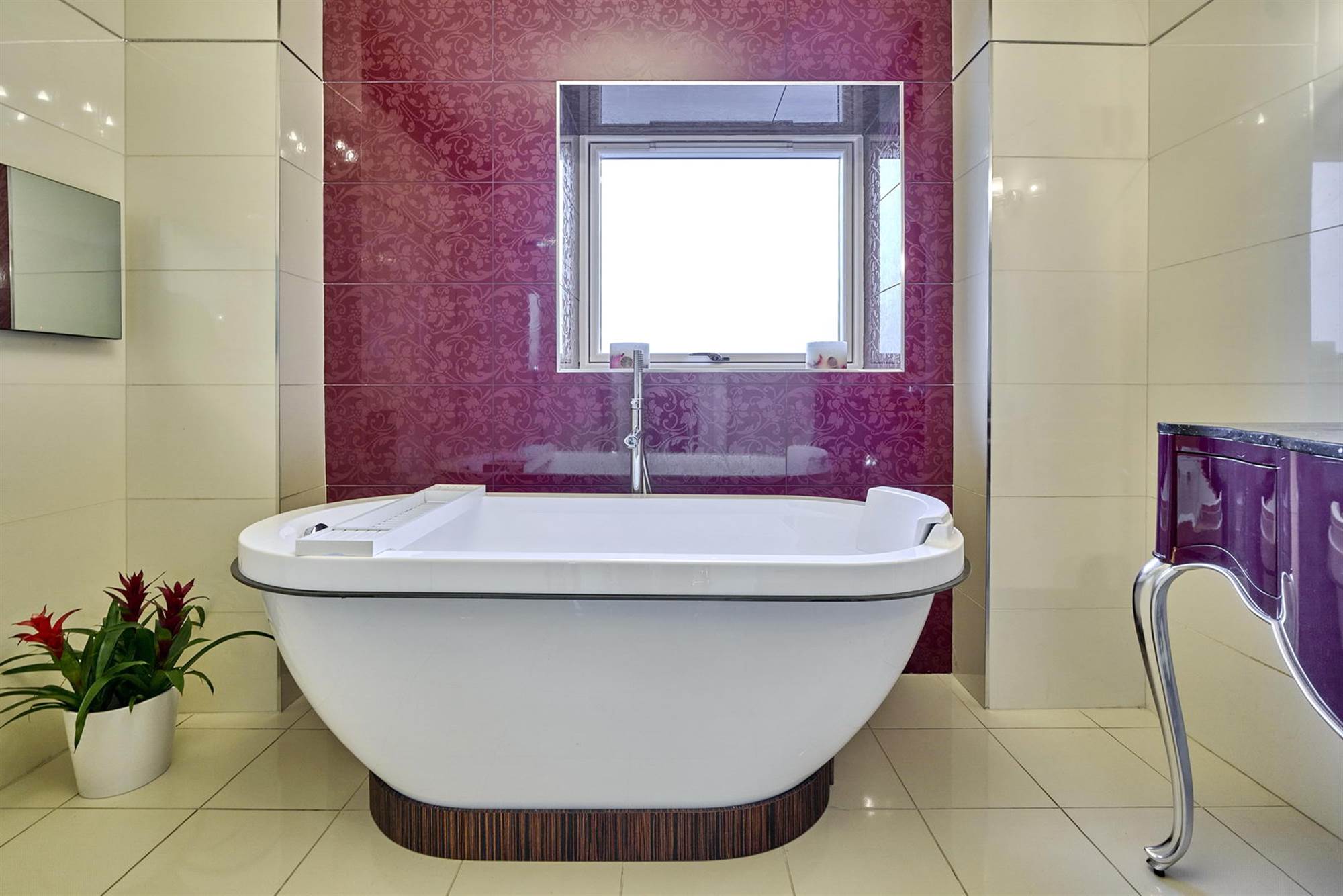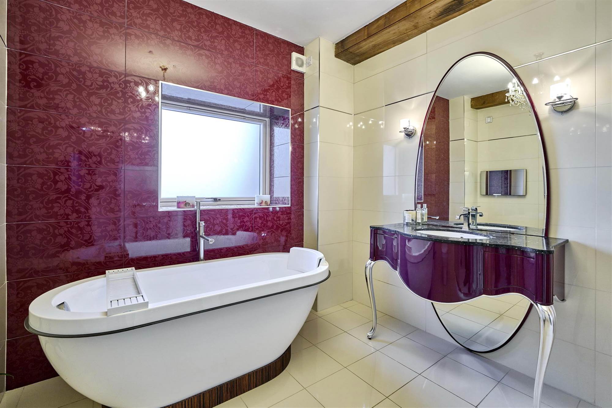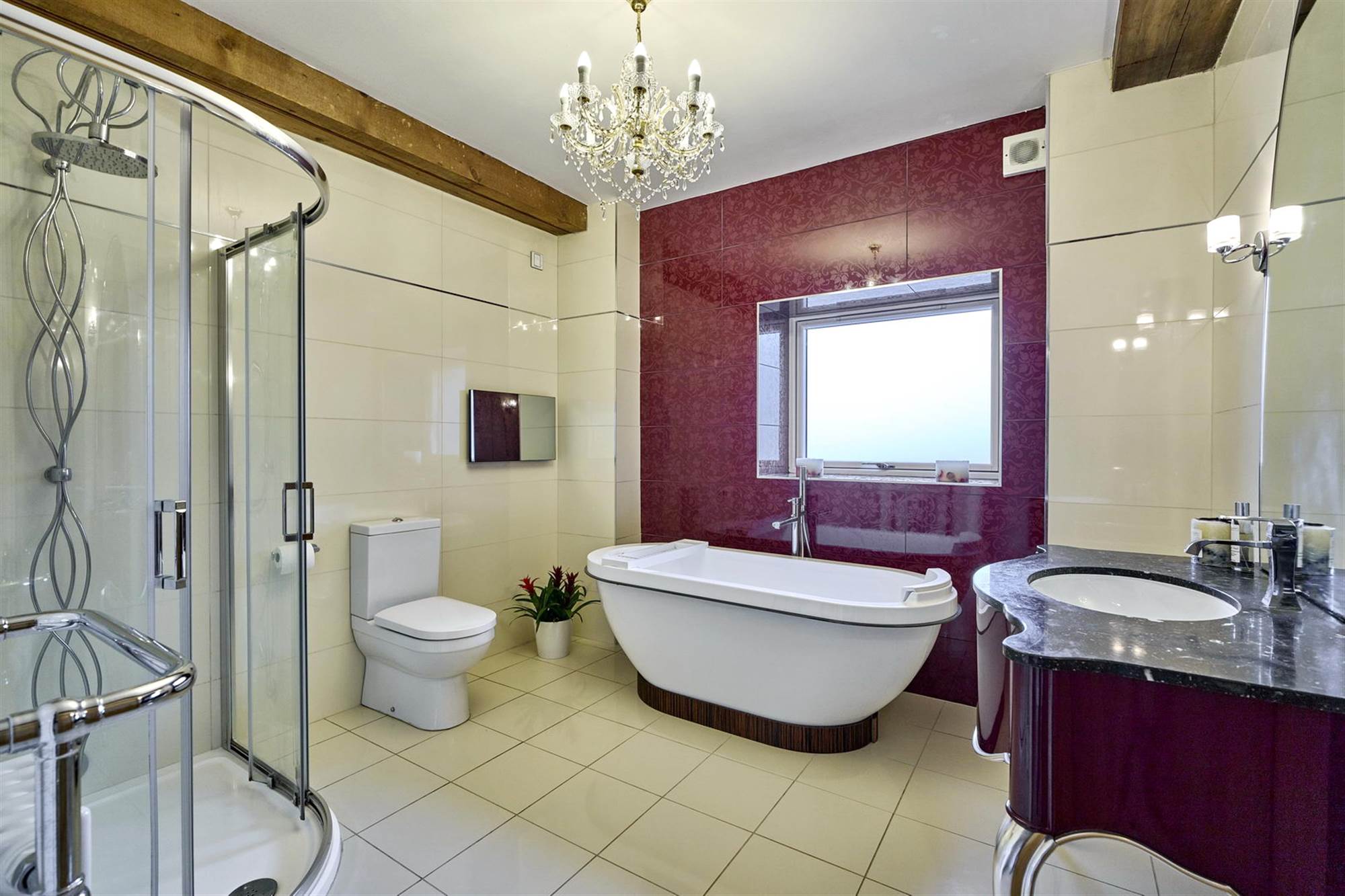 Contemporary suite comprising low flush wc, free standing bath with chrome mixer taps and handheld shower attachment, wall mounted TV, inset wash hand basin with ornate wash stand and granite top, fully tiled corner shower with chrome overhead rainfall shower, ceramic tiled floor, fully tiled walls, chrome heated towel rail, recessed lighting, wall light wiring, exposed beams.