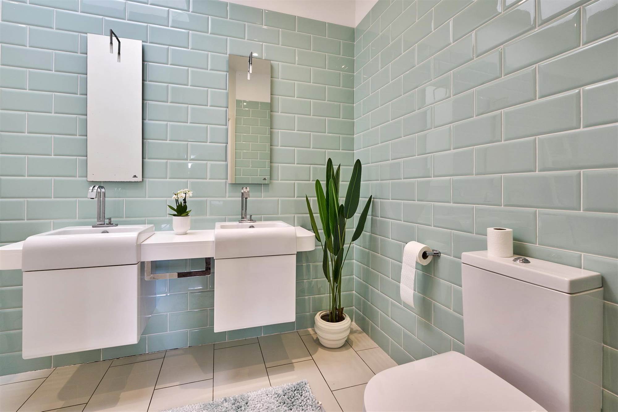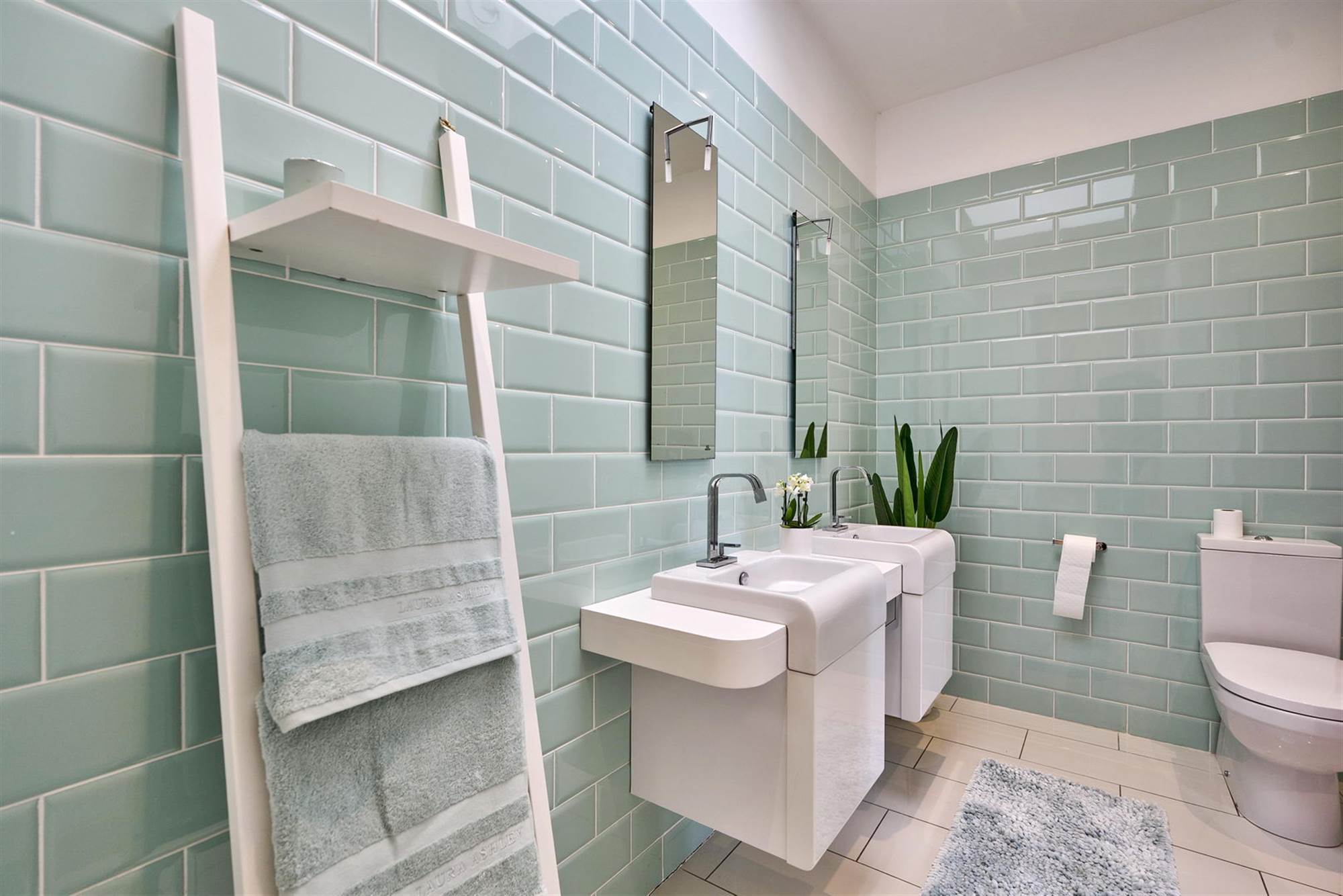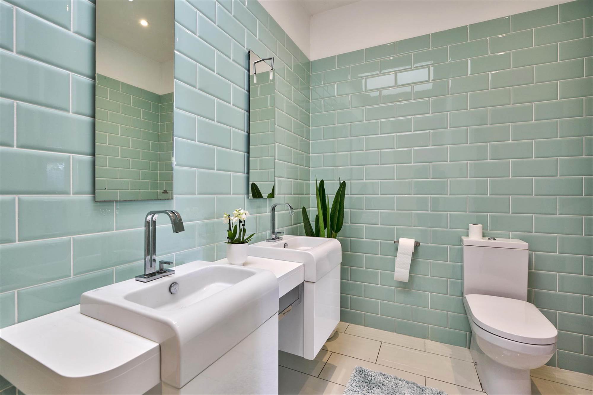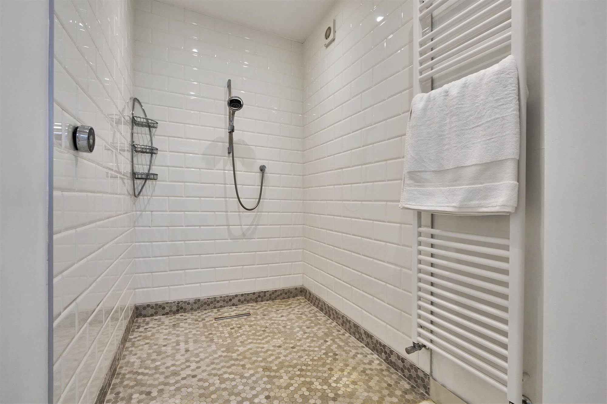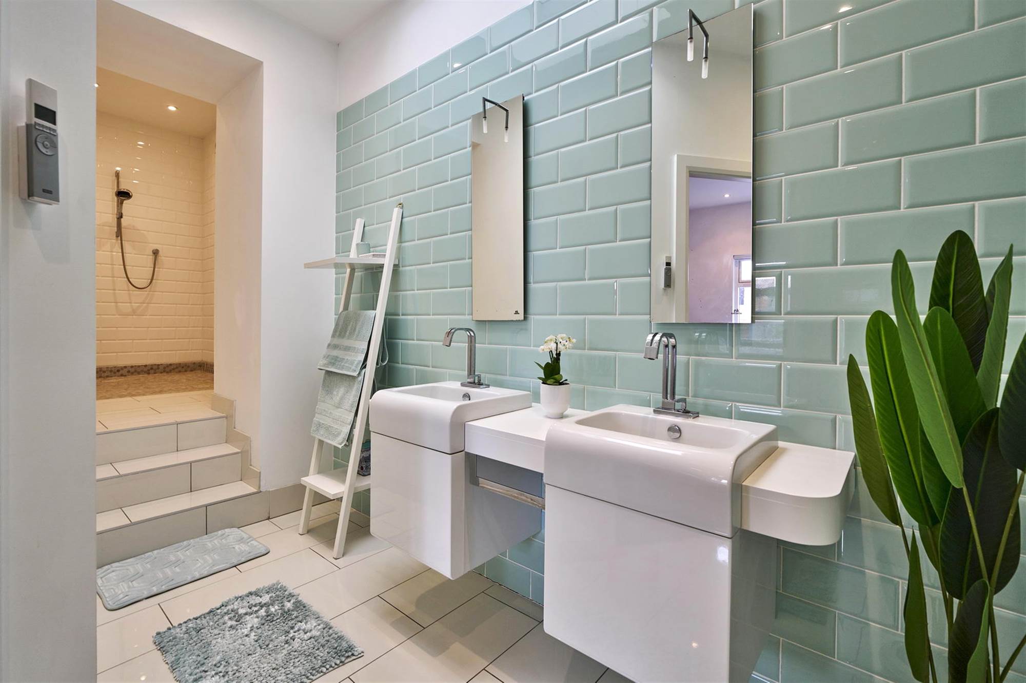Contemporary white suite comprising twin wash hand basin with drawers below and wall mounted mirrors above, low flush wc, steps to impressive fully tiled walk-in shower with chrome controls, ceramic tiled floor, partly tiled walls, heated towel rail, recessed lighting.