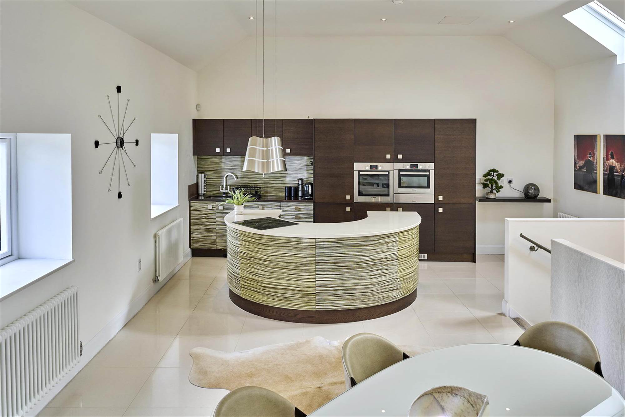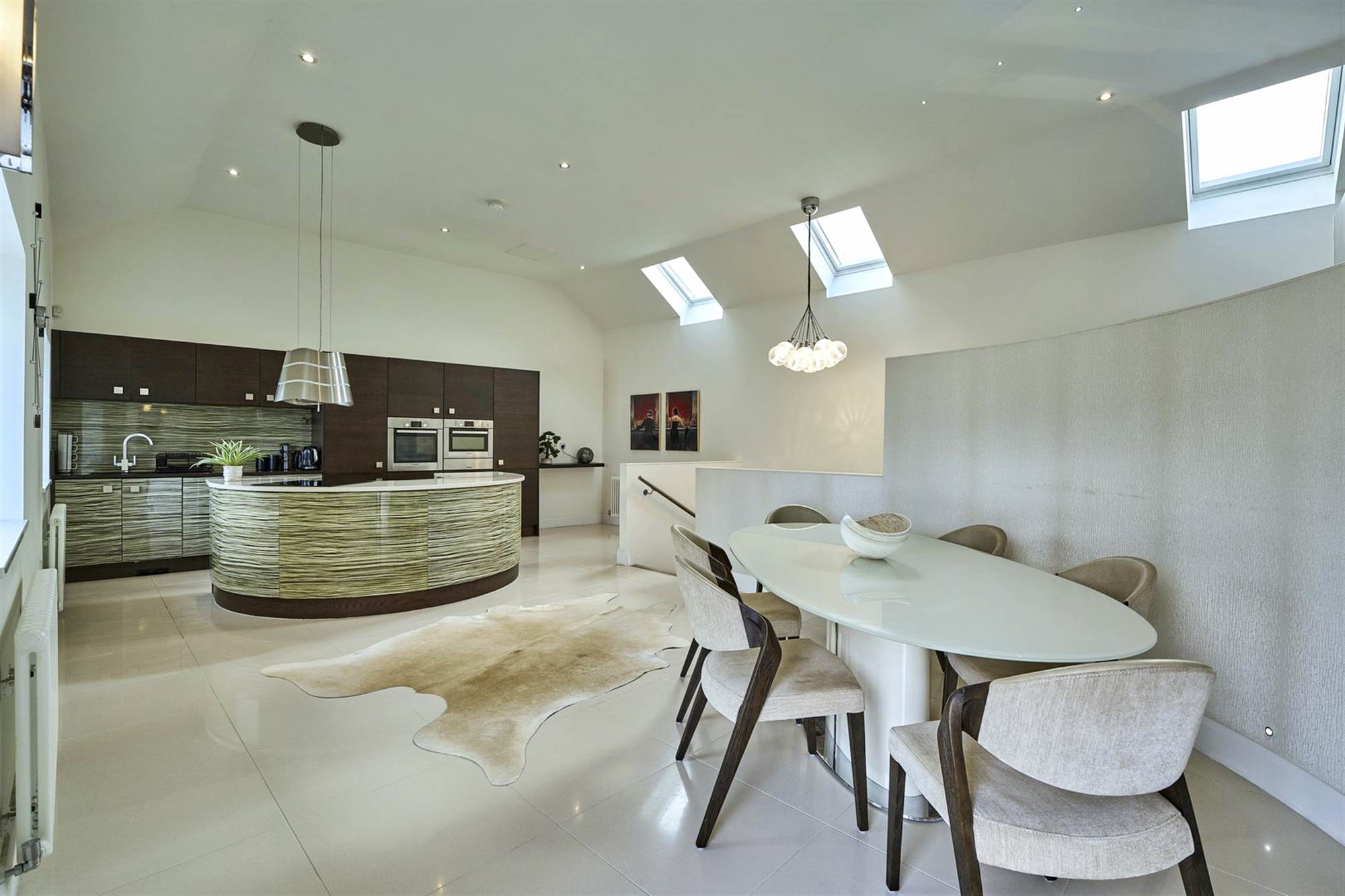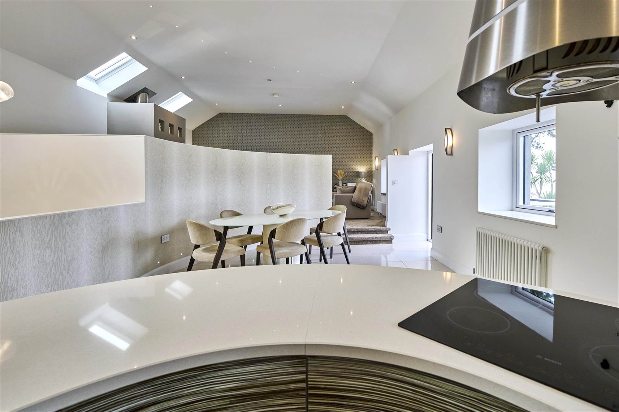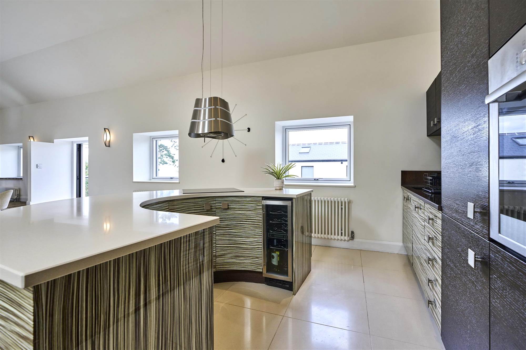 Excellent range of contemporary high and low level fitted units and crescent shaped island, Franke stainless steel sink unit with mixer taps, integrated Smeg dishwasher, integrated Bosch oven, integrated Bosch combination microwave oven and plate warmer, integrated fridge/freezer, integrated wine fridge, four ring Bosch induction hob with feature Elica extractor hood, ceramic tiled floor, recessed lighting, Velux windows, double height ceiling, dining area for 6-8, double opening glazed doors to balcony with views across Belfast Lough. Steps to: