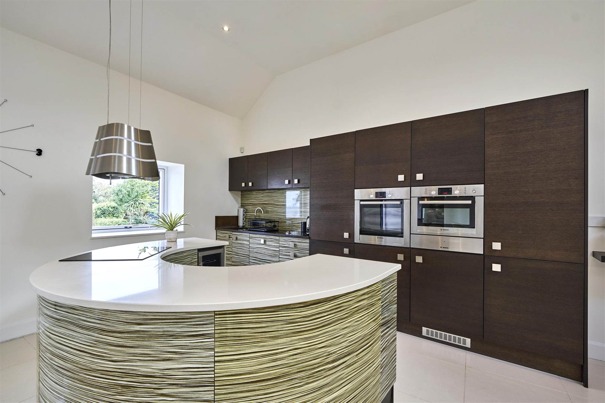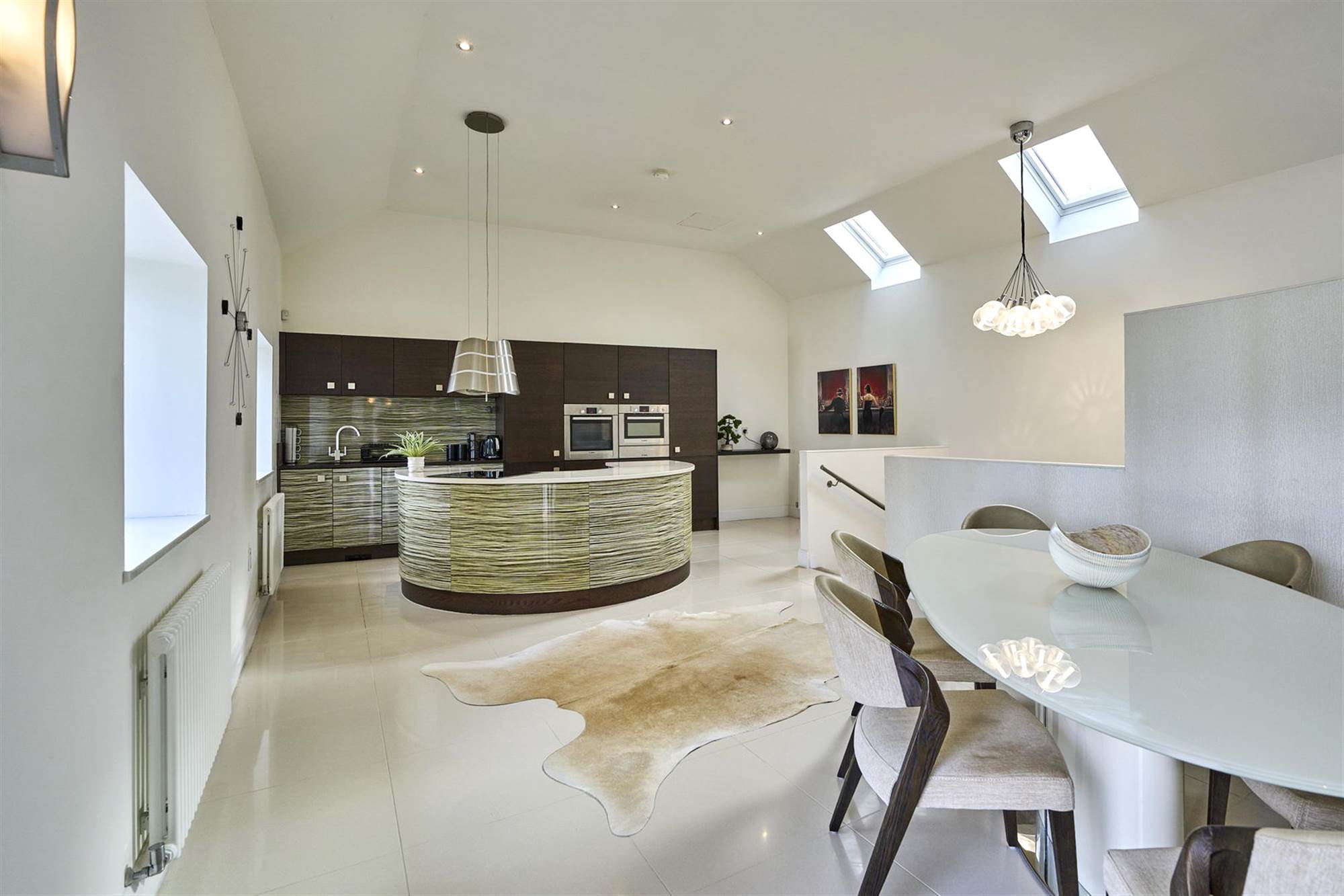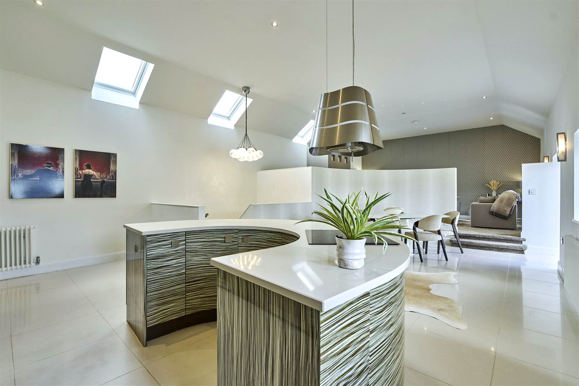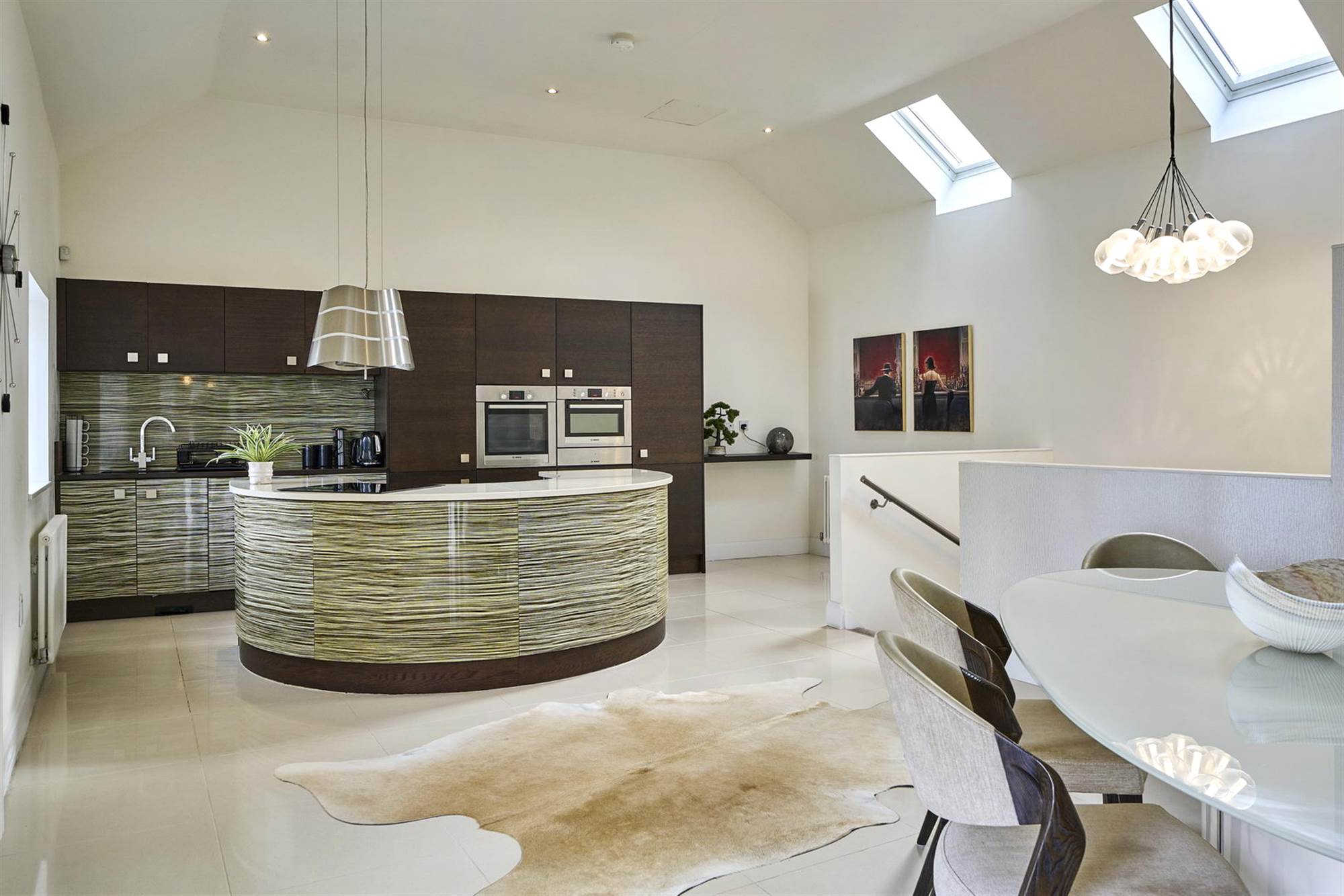 Excellent range of contemporary high and low level fitted units and crescent shaped island, Franke stainless steel sink unit with mixer taps, integrated Smeg dishwasher, integrated Bosch oven, integrated Bosch combination microwave oven and plate warmer, integrated fridge/freezer, integrated wine fridge, four ring Bosch induction hob with feature Elica extractor hood, ceramic tiled floor, recessed lighting, Velux windows, double height ceiling, dining area for 6-8, double opening glazed doors to balcony with views across Belfast Lough. Steps to: