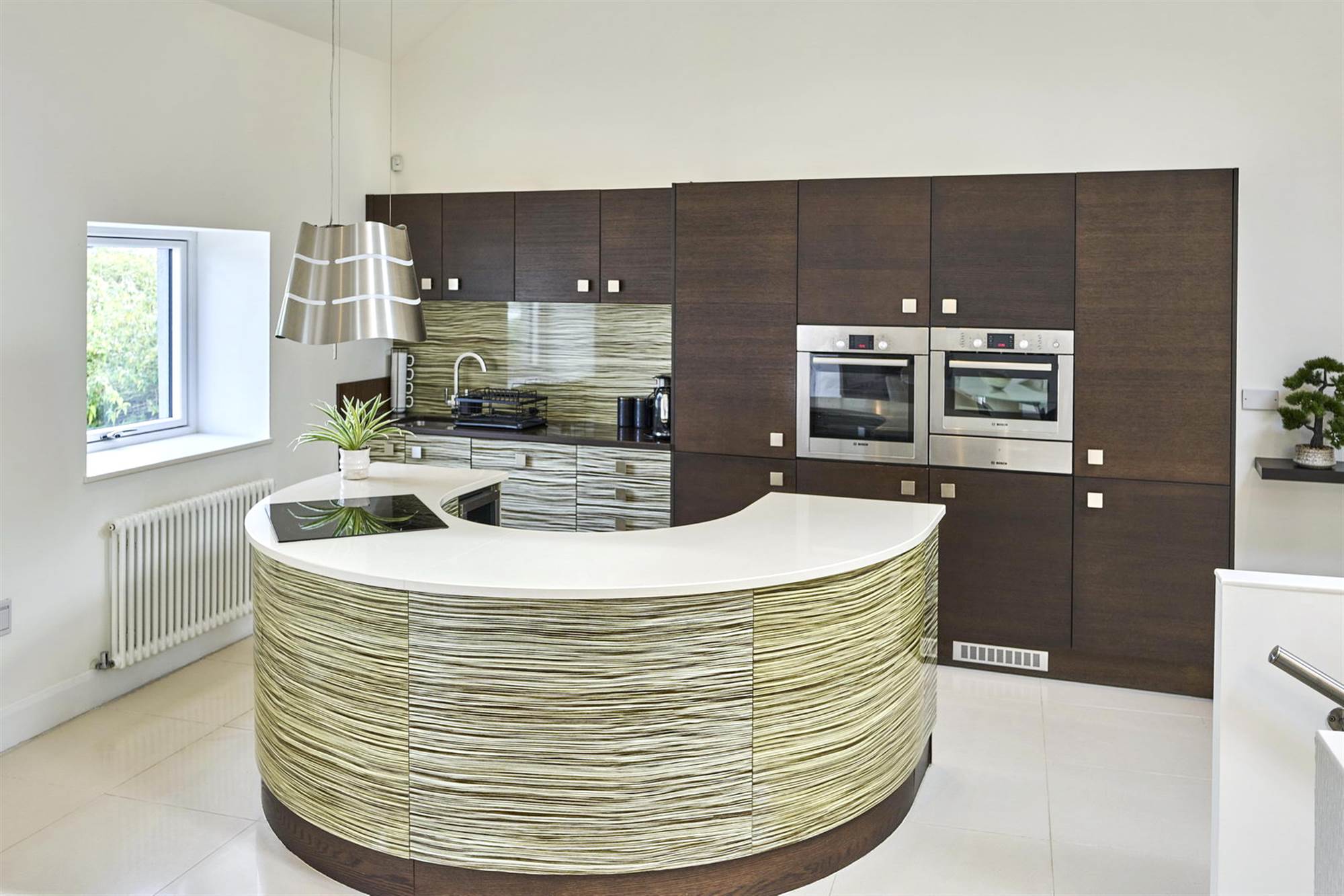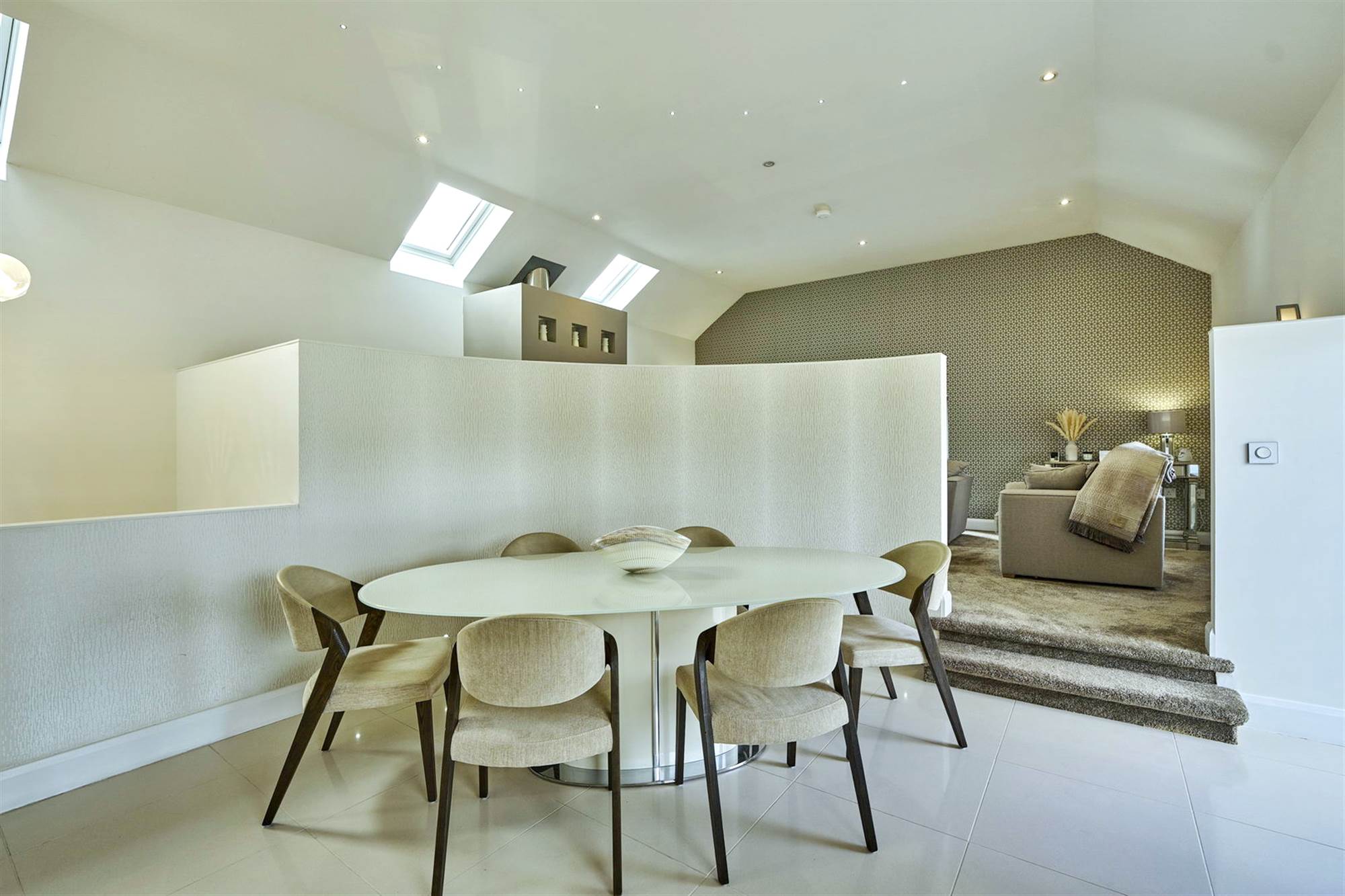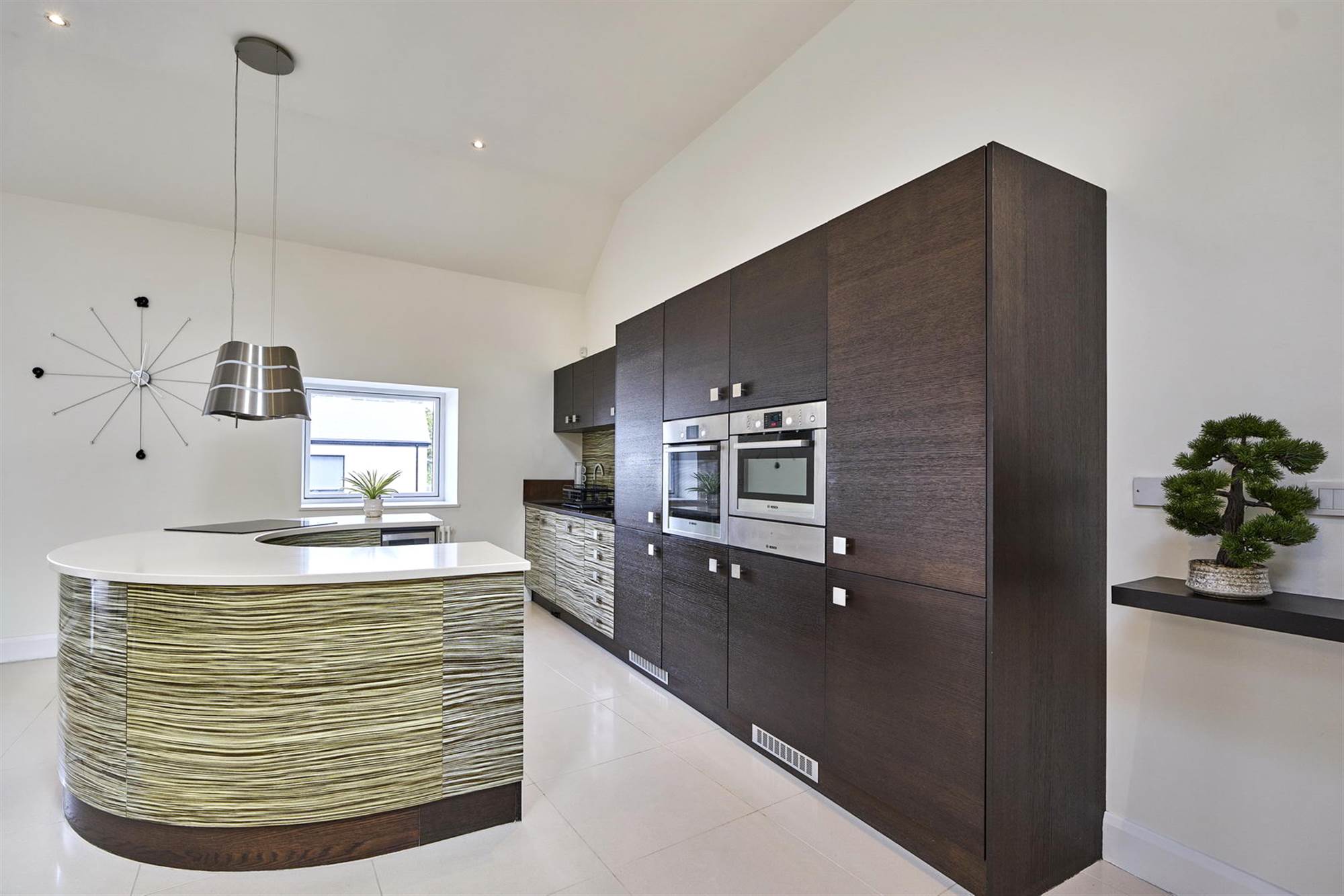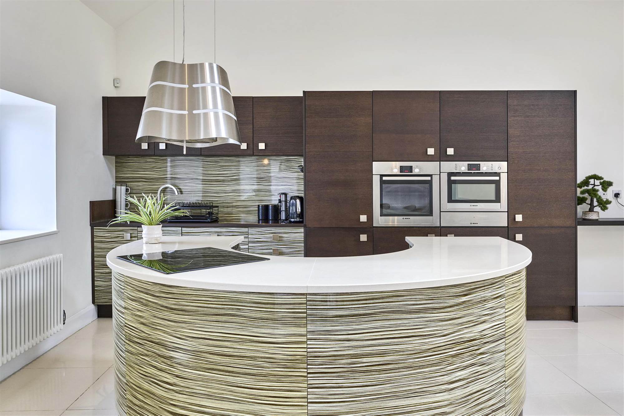 Excellent range of contemporary high and low level fitted units and crescent shaped island, Franke stainless steel sink unit with mixer taps, integrated Smeg dishwasher, integrated Bosch oven, integrated Bosch combination microwave oven and plate warmer, integrated fridge/freezer, integrated wine fridge, four ring Bosch induction hob with feature Elica extractor hood, ceramic tiled floor, recessed lighting, Velux windows, double height ceiling, dining area for 6-8, double opening glazed doors to balcony with views across Belfast Lough. Steps to:
