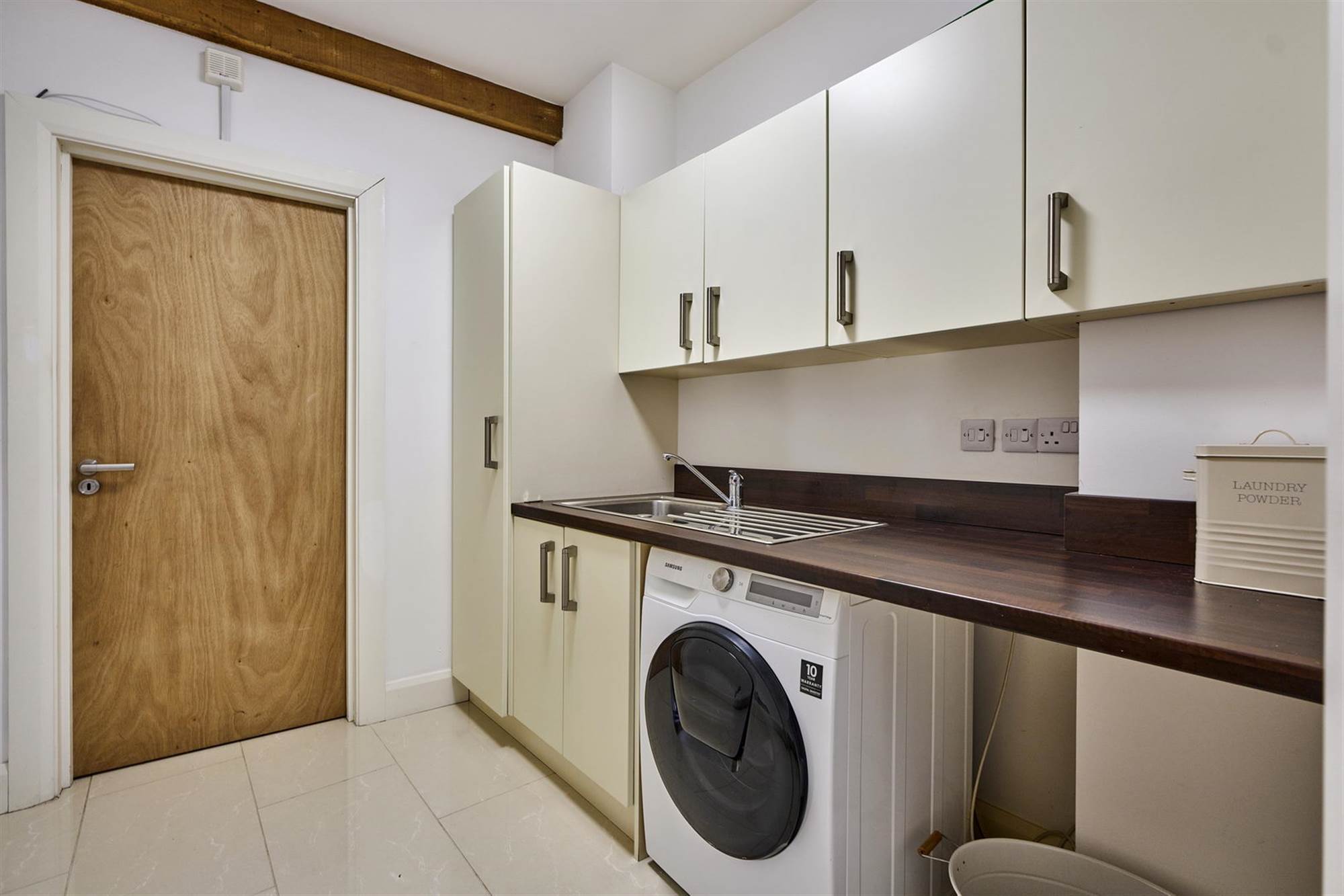 Good range of high and low level units, single drainer stainless steel sink unit with mixer taps, recess for tumble dryer, plumbed for washing machine, ceramic tiled floor, access to integral garage.