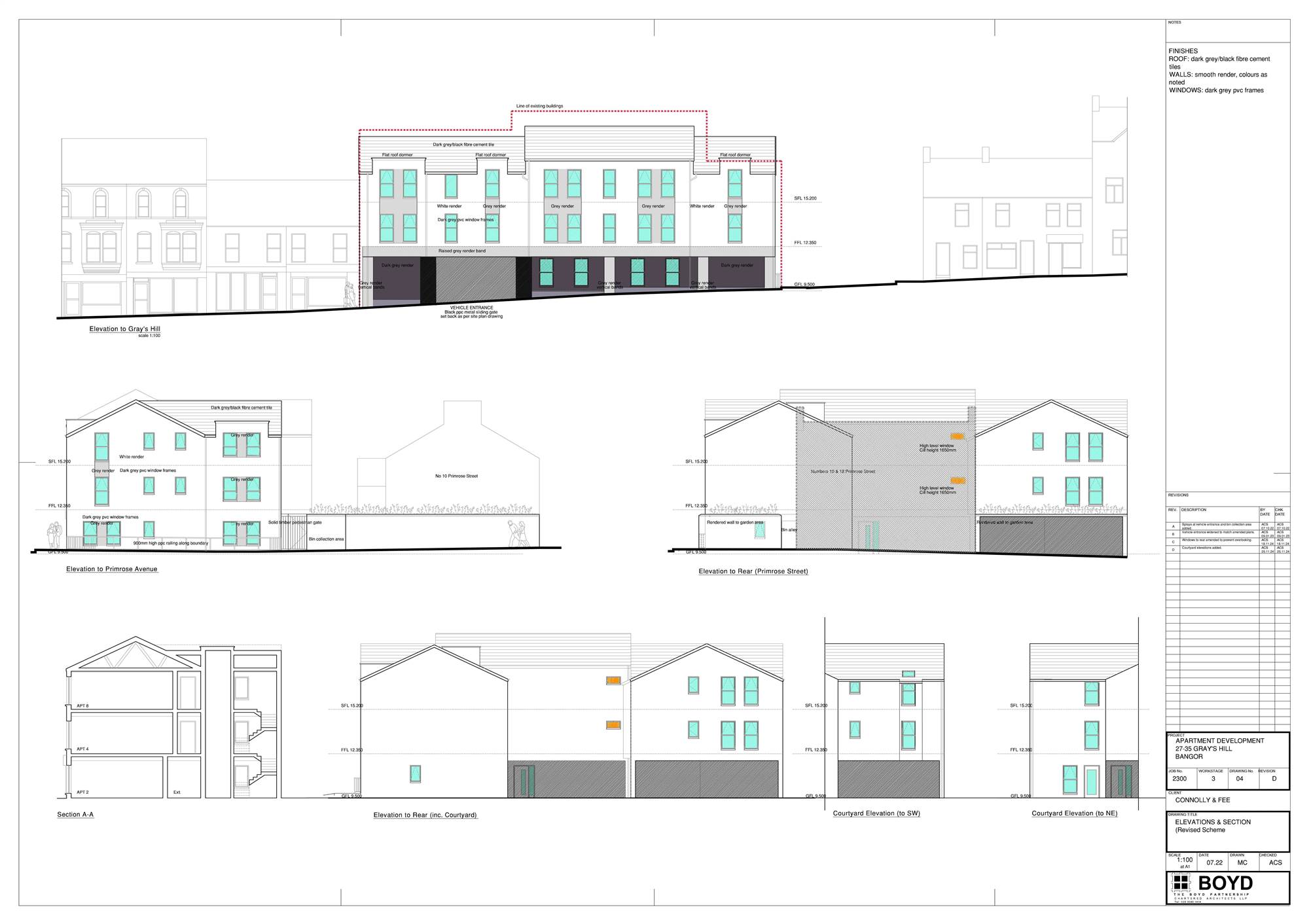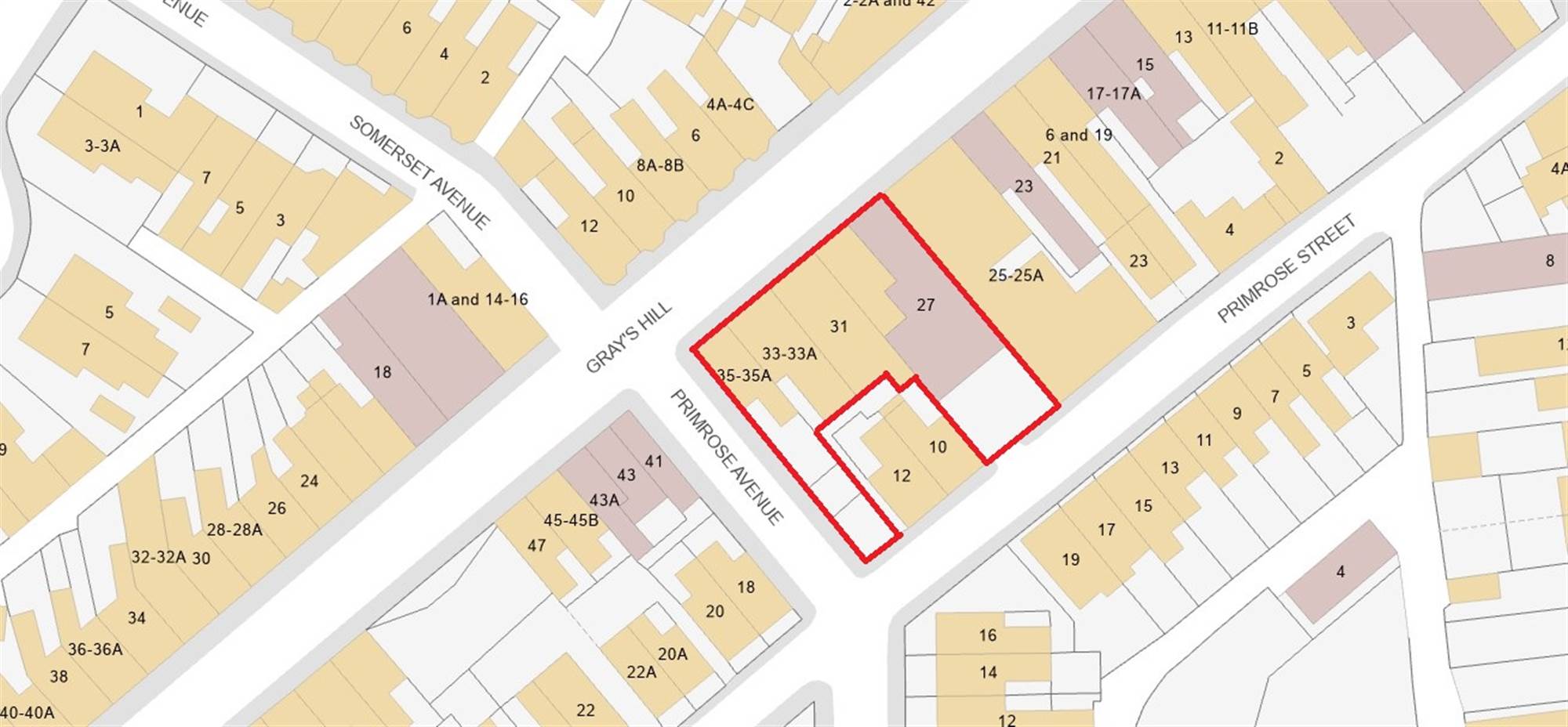 The approved plans allow for a three-storey building comprising 10 apartments, each extending to approximately 65 sq.m, with associated car parking to the rear. The site occupies a prominent corner position at the junction of Gray"s Hill and Primrose Avenue, and is bounded to the rear by Primrose Street.