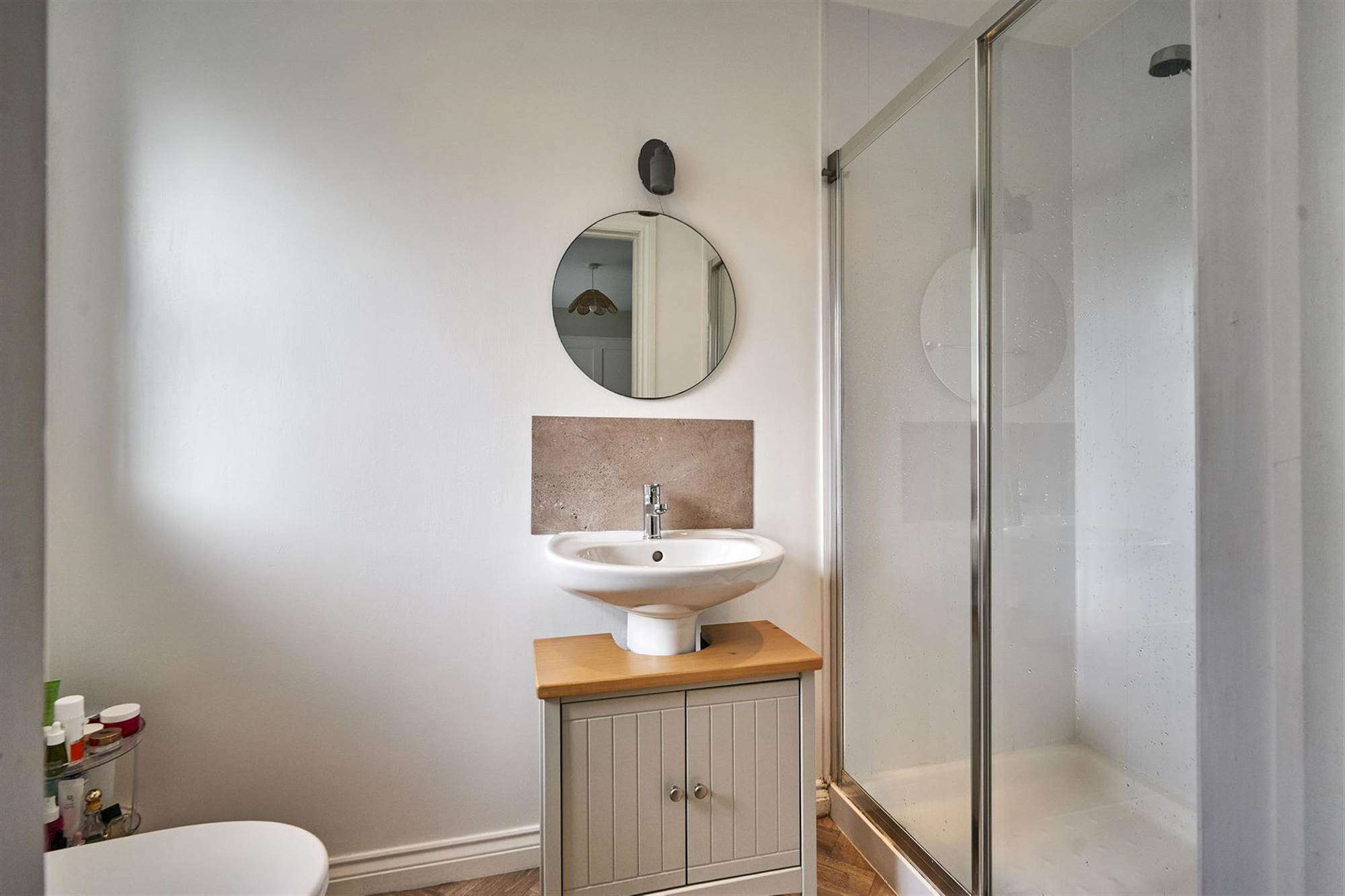 Enclosed shower cubicle with thermostatic shower unit, pedestal wash hand basin, low flush WC, low voltage spot lights, extractor fan.