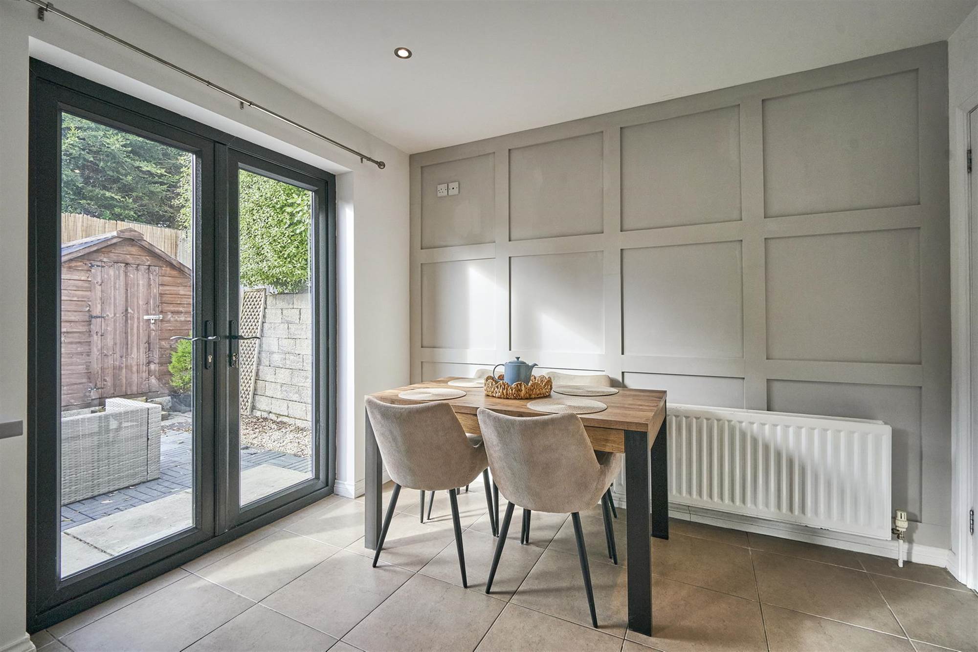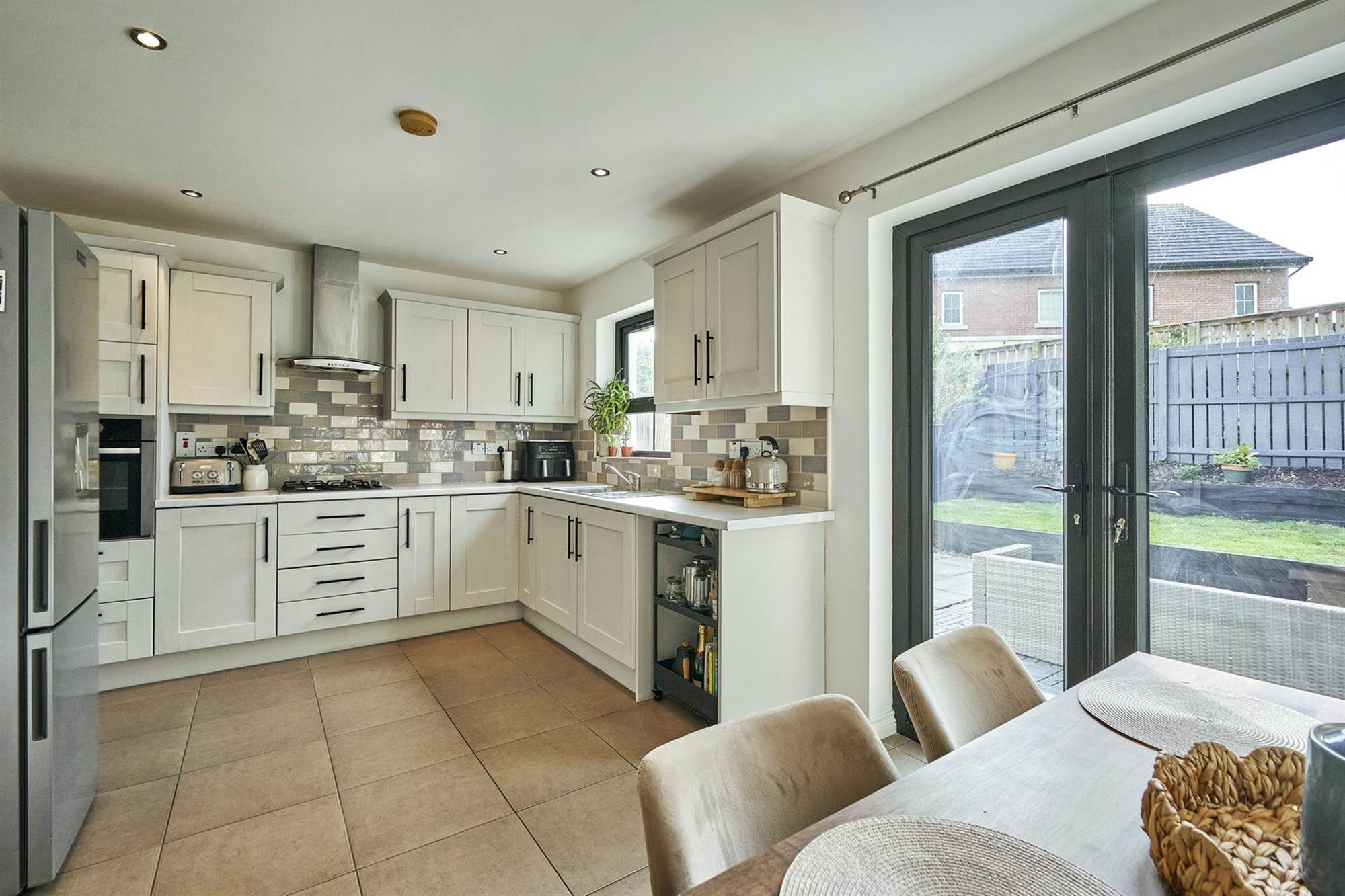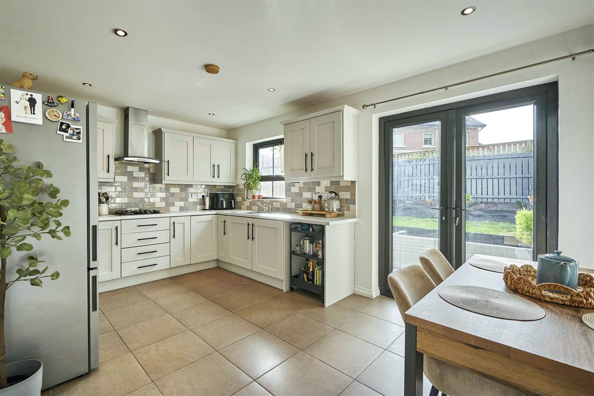 Painted grey kitchen with excellent range of high and low level units, laminate work surfaces, space for dishwasher, stainless steel sink unit with mixer tap, gas hob, oven, extractor fan, LED lighting, space for fridge freezer, ceramic tiled floor. Double door to patio / garden.
