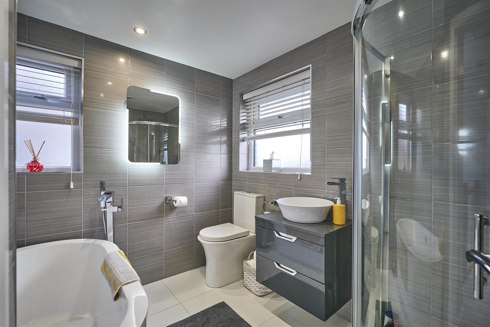 White suite comprising free standing bath with mixer tap and telephone hand shower, low flush wc, wash stand with drawers below, fully tiled shower cubicle with thermostatic shower unit and rain shower head, ceramic tiled floor, fully tiled walls, heated towel rail, LED lighting.