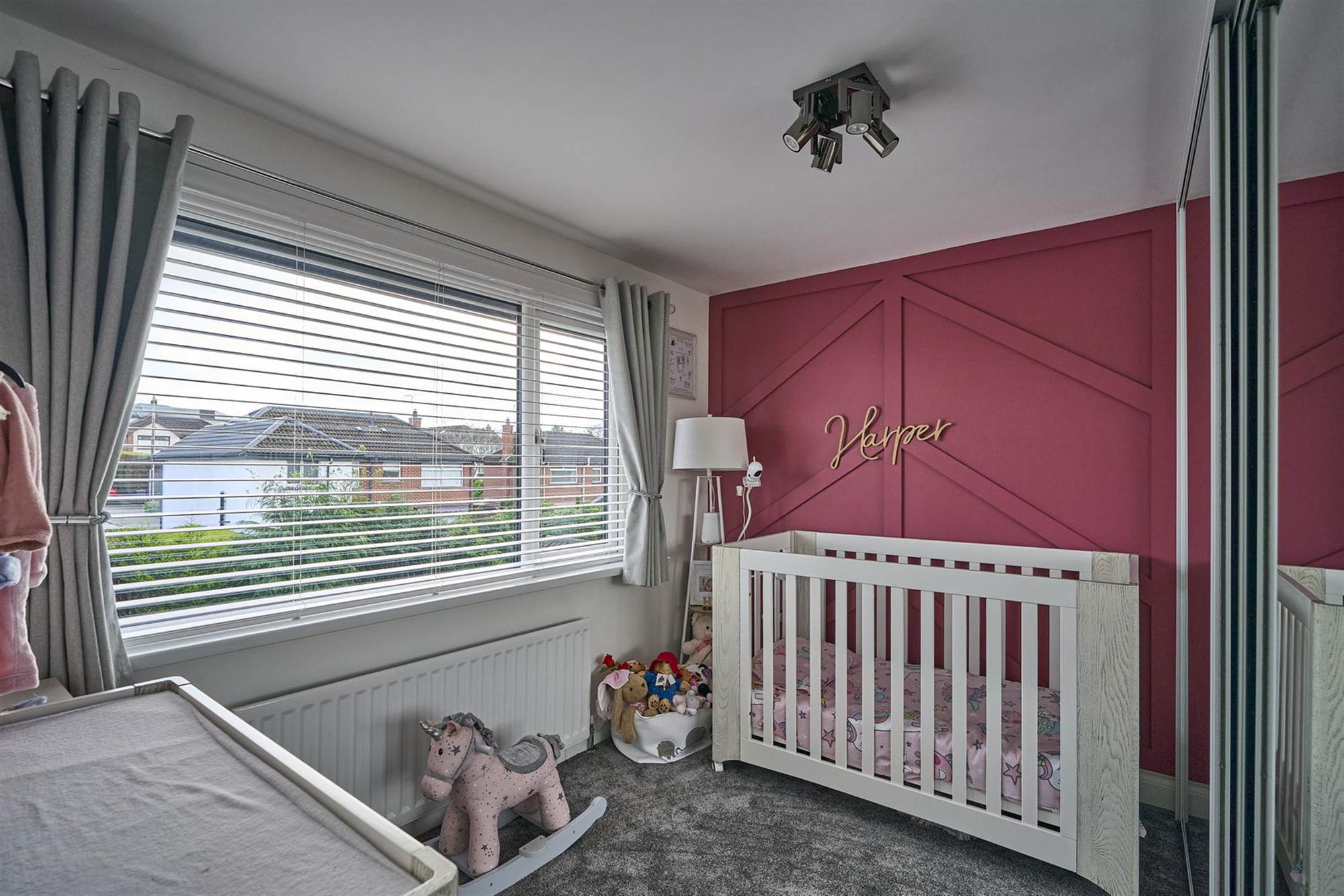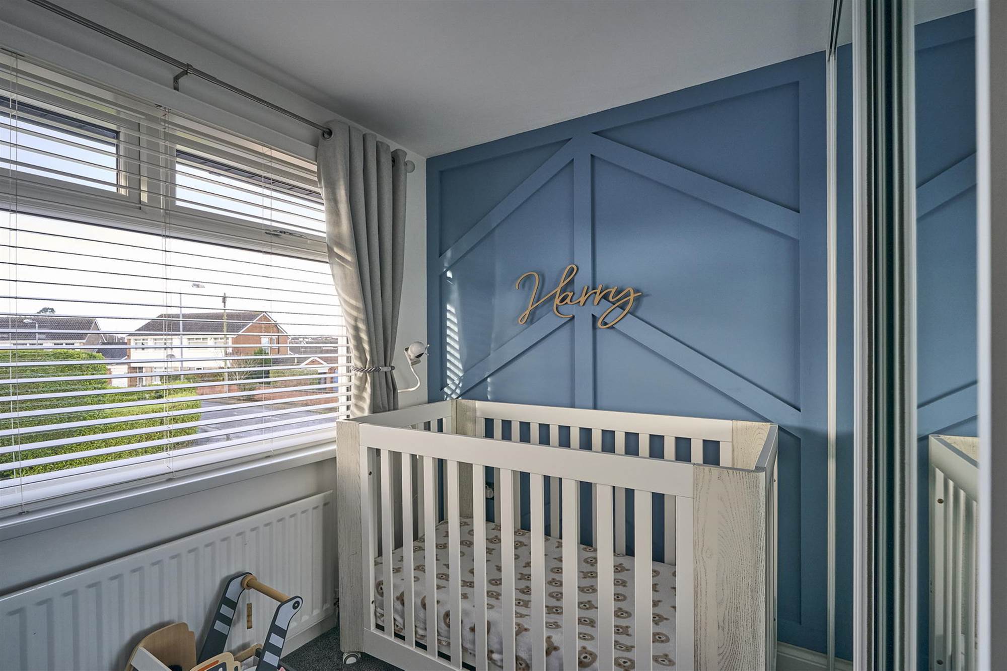Feature panelled wall, built-in wardrobe with mirrored sliding door.
