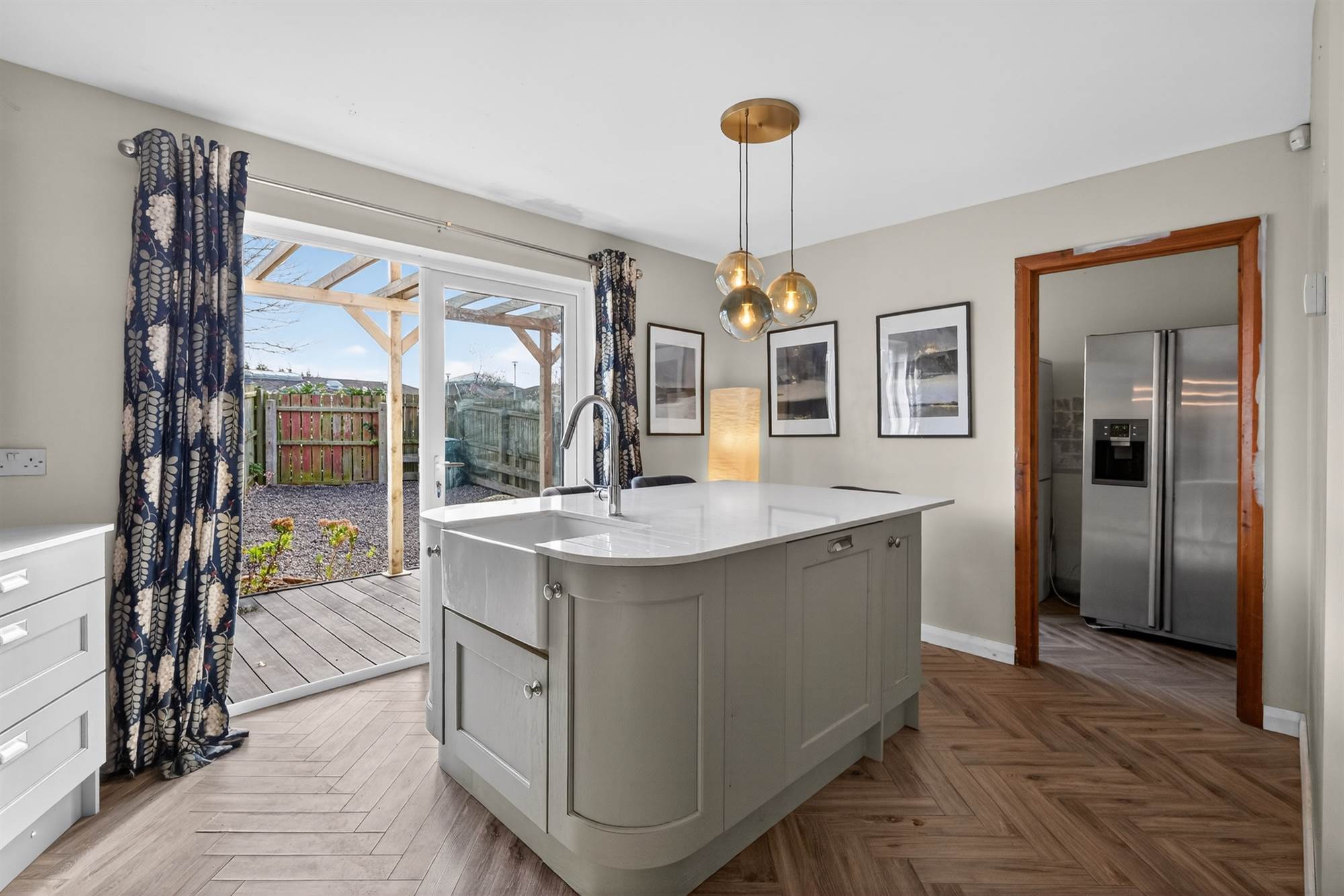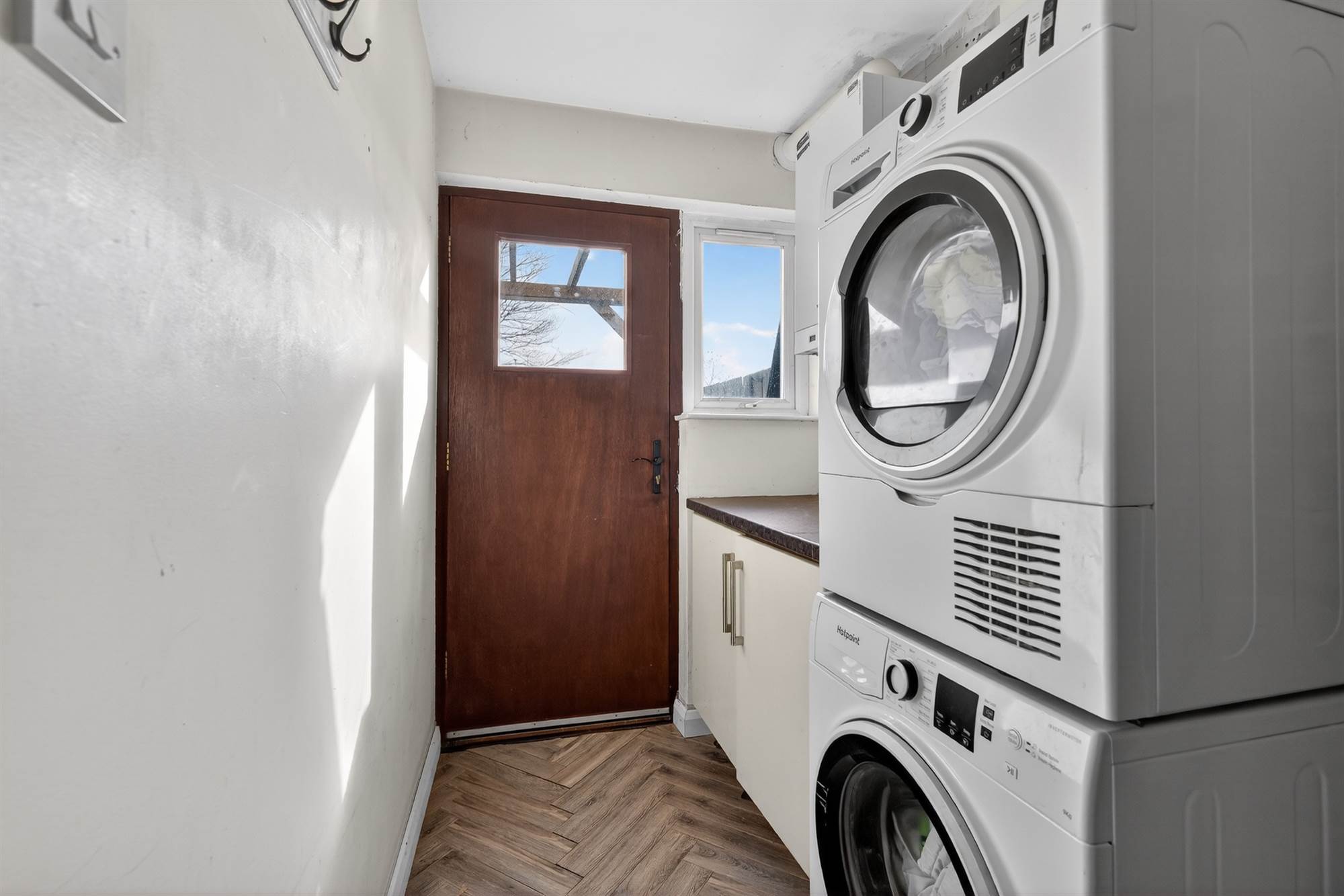 Built-in cupboards, plumbed for washing machine, space for dryer. Oak effect herringbone ceramic tiled floor. Hardwood door to exterior. Service door to garage.