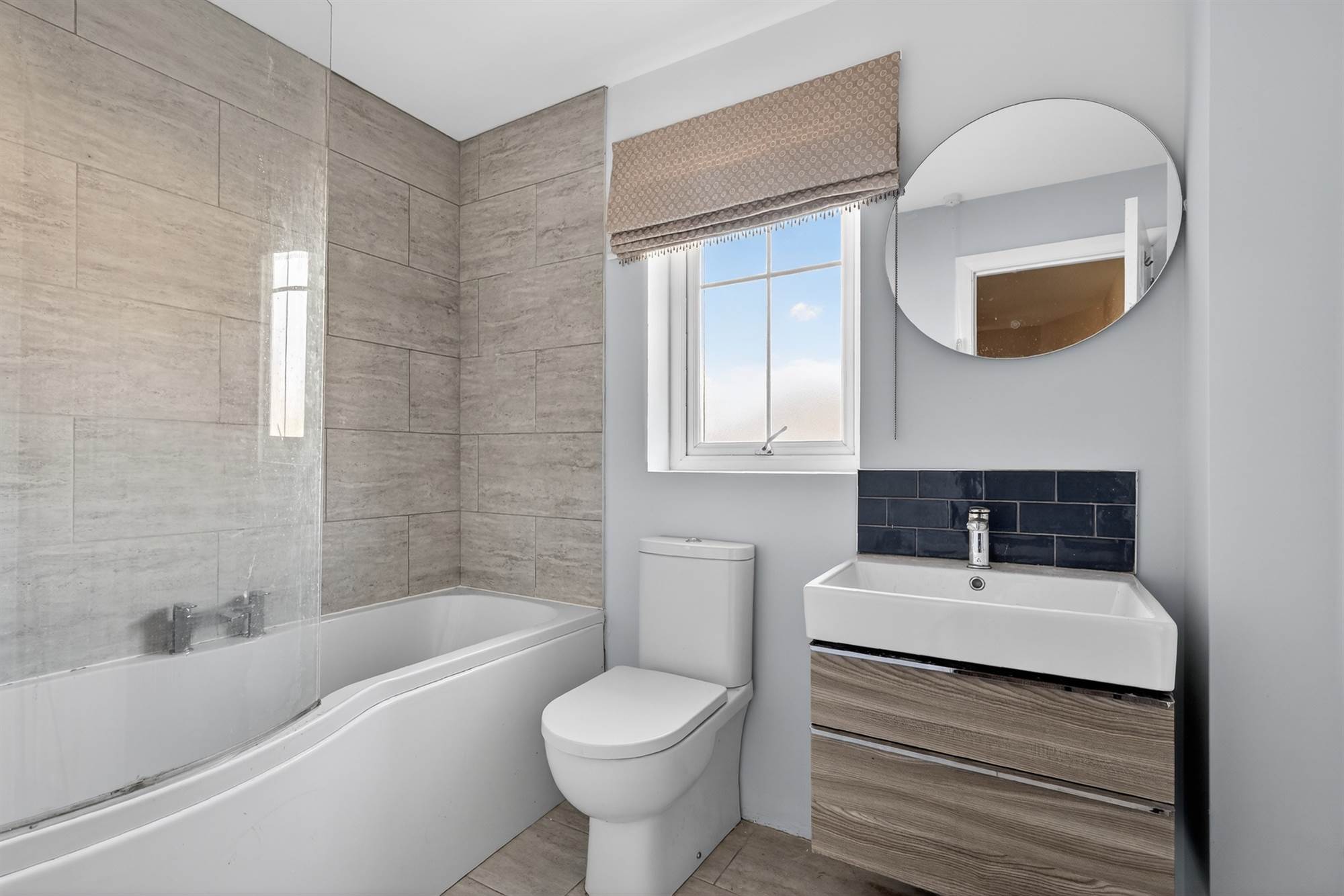 Modern white bathroom suite comprising panelled bath with mixer tap and shower, tiled surround, wash hand basin with mixer tap, low level drawers, tiled splashback, low flush wc, ceramic tiled floor, window.