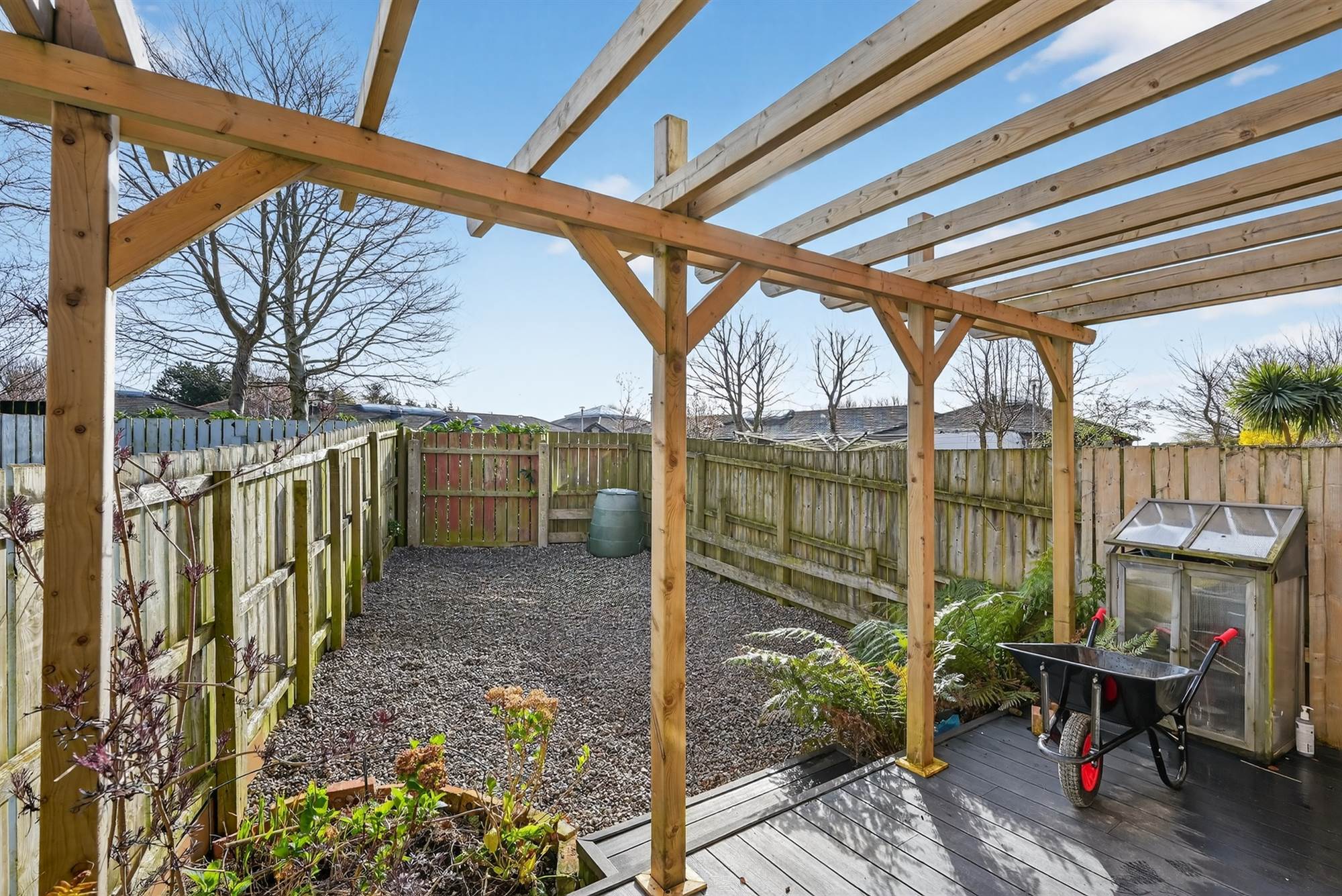 Enclosed, notably private rear garden. Timber decked area with pergola leading to pebbled garden bordered by fencing. Outside tap and light.