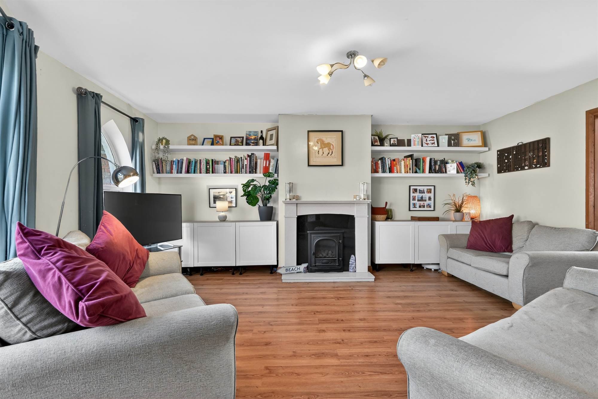 Attractive fireplace with feature wood burning stove, alcove shelving, feature gothic style window.