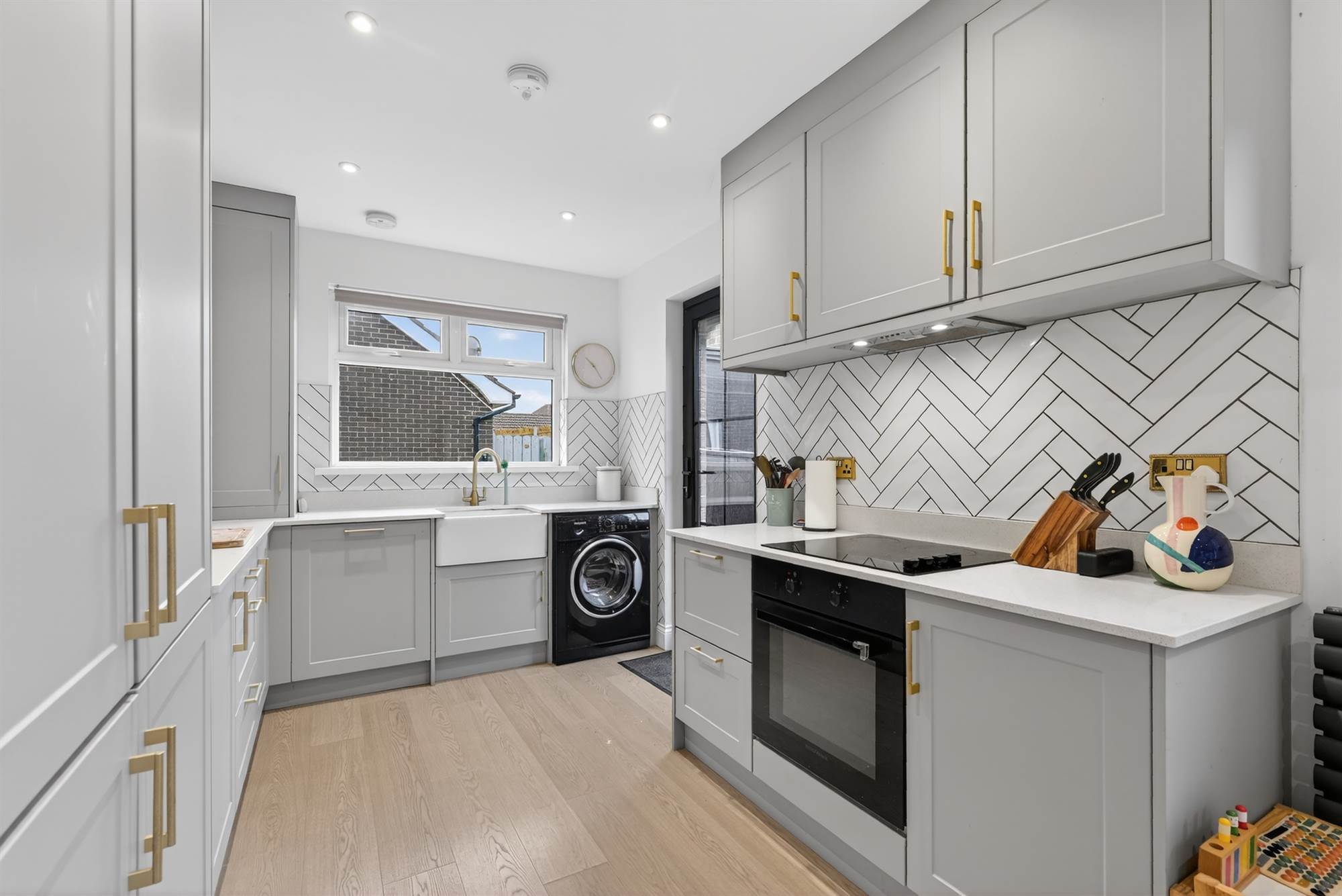 Shaker sytle kitchen with excellent range of high and low level units, ceramic sink with swan neck mixer tap, quartz worktops and upstands, part tiled walls, built-in electric oven with four ring ceramic hob and concealed extractor fan, built-in fridge/freezer, plumbed for washing machine. Light oak effect engineered laminate wooden floor. uPVC double glazed sliding doors to exterior. Boiler cupboard with gas fired boiler. Open plan to: