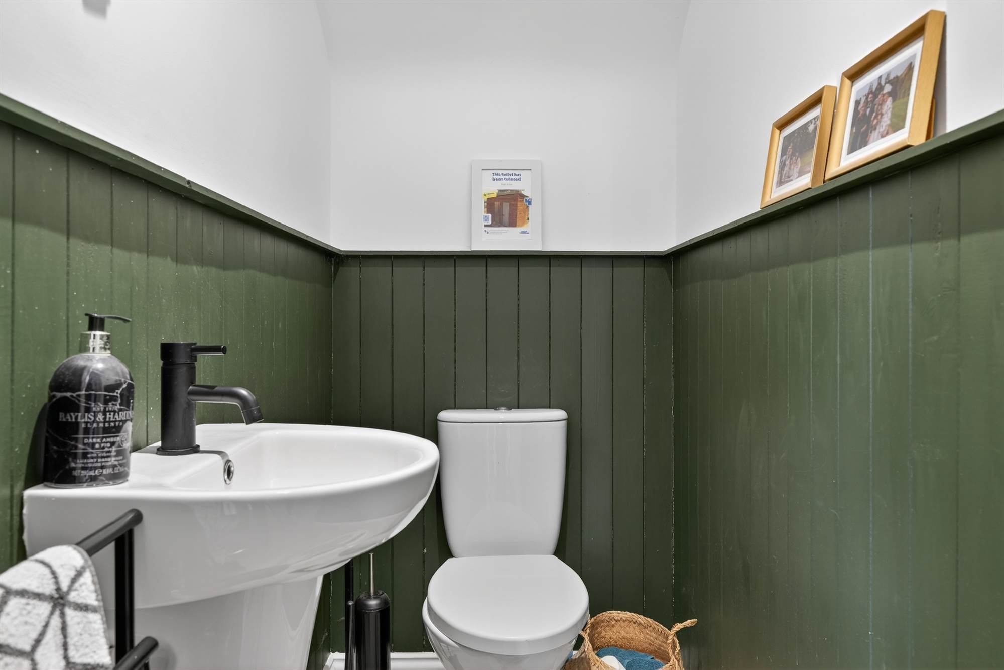 Low flush wc, pedestal wash hand basin with mixer tap, half panelled walls.