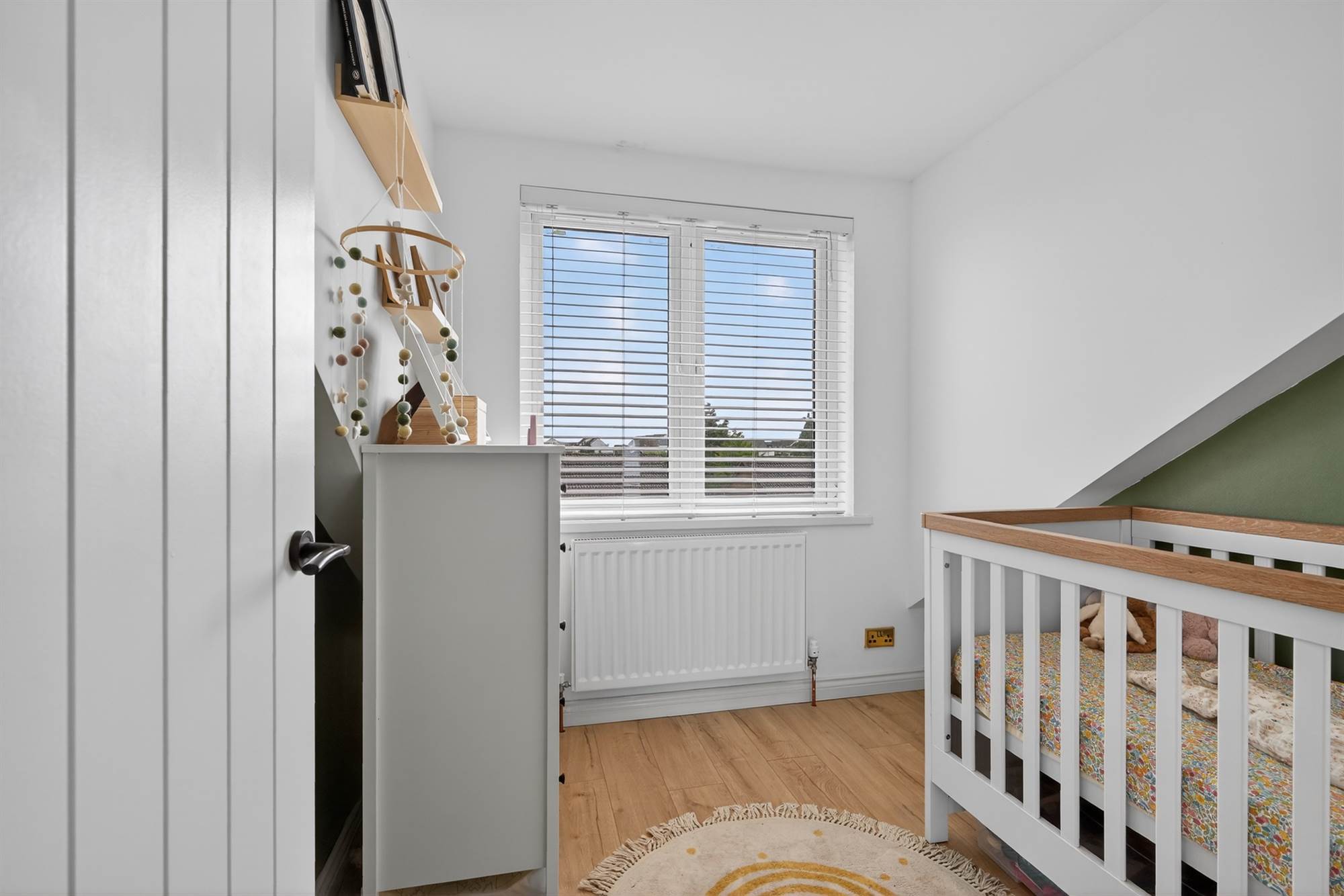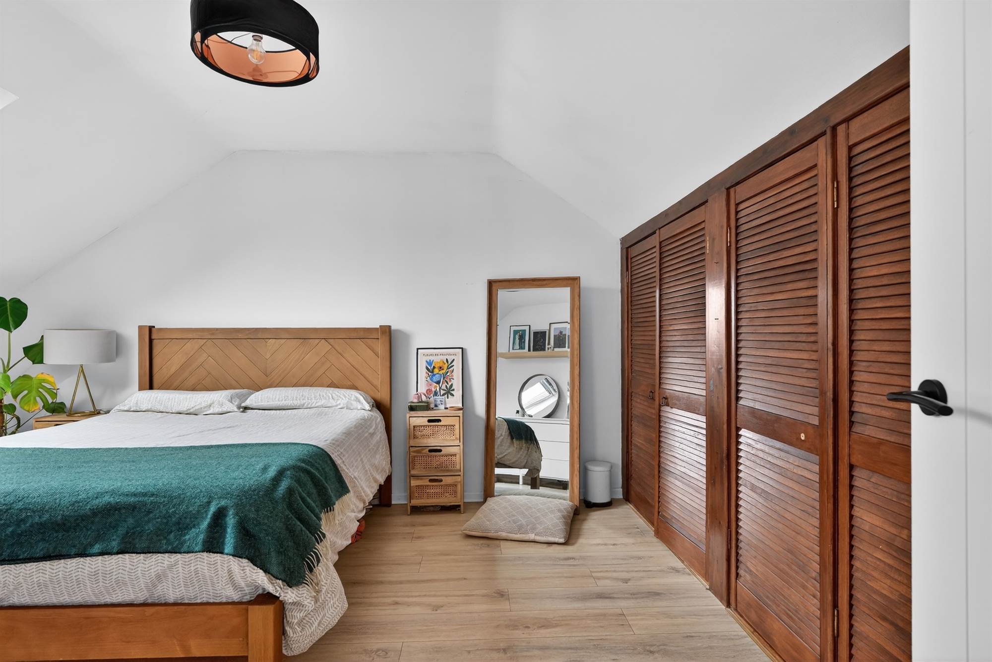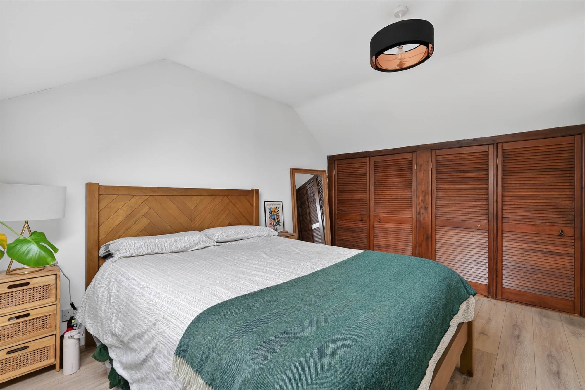 Oak effect lamiante wooden floor, wall-to-wall range of built-in robes with louvered doors.
