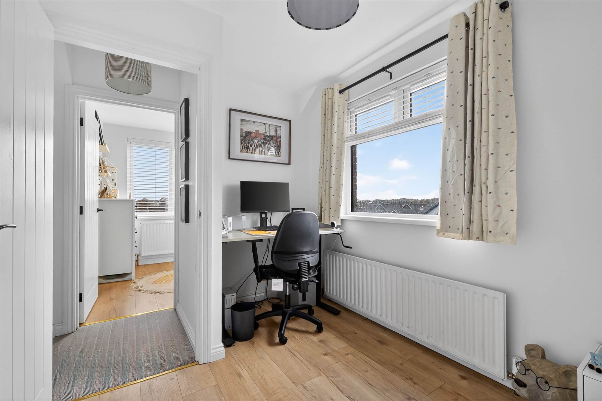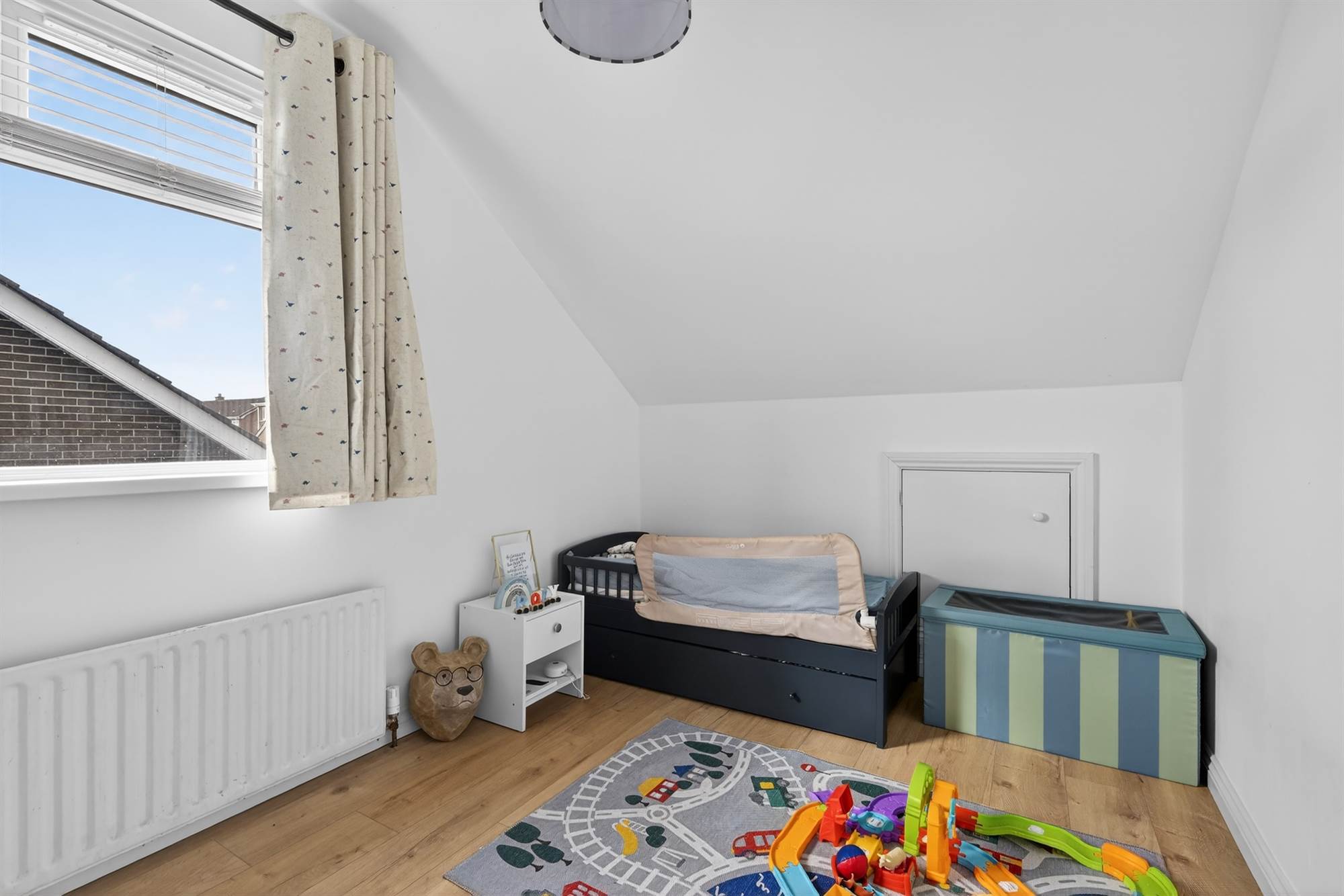 Oak effect laminate wooden floor. Access to eaves storage.