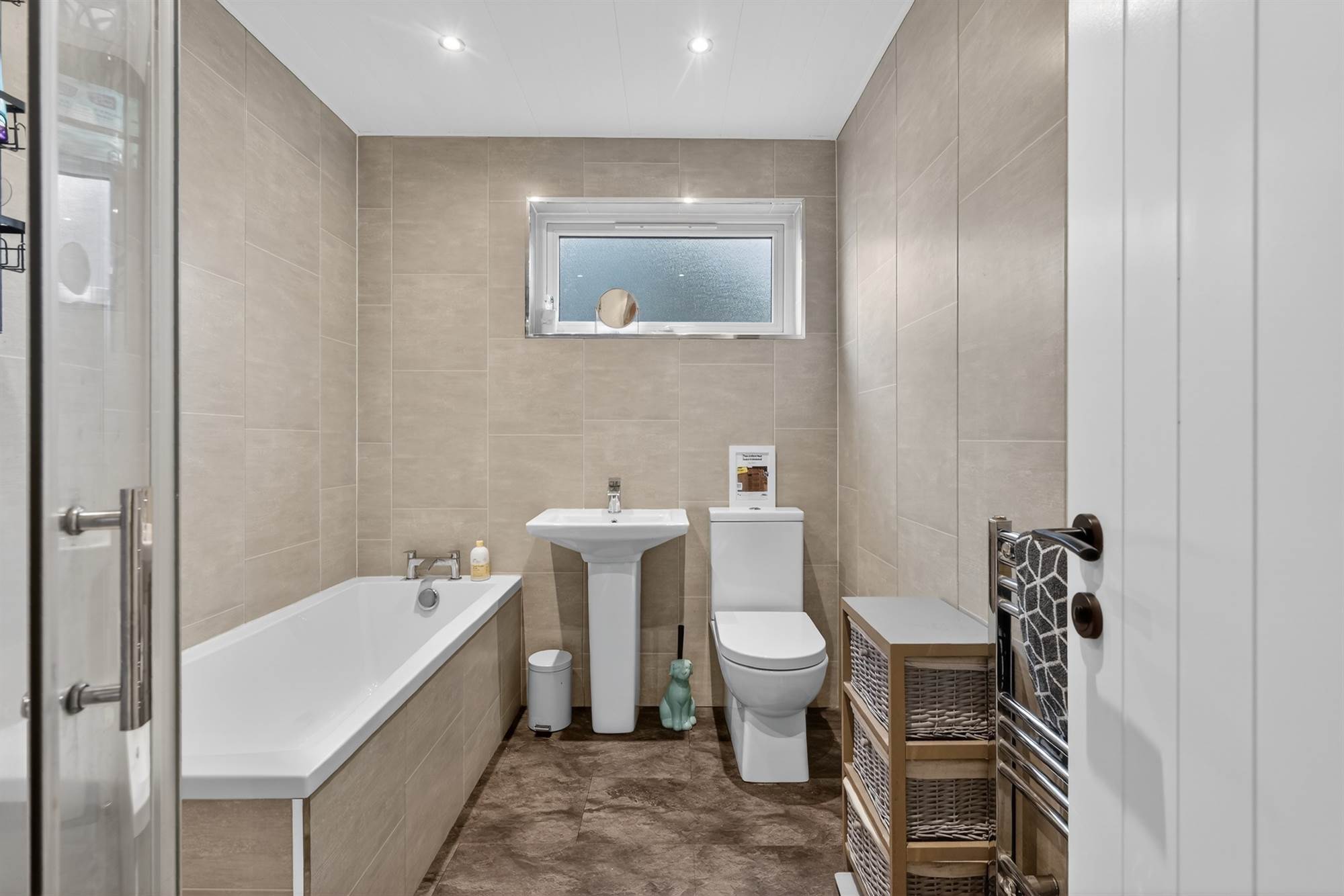 Modern white bathroom suite comprising tiled panelled bath with mixer tap, pedestal wash hand basin with mixer tap, low flush wc, tiled uPVC panelled walls, low voltage spotlights, heated towel rail, extractor fan, window.