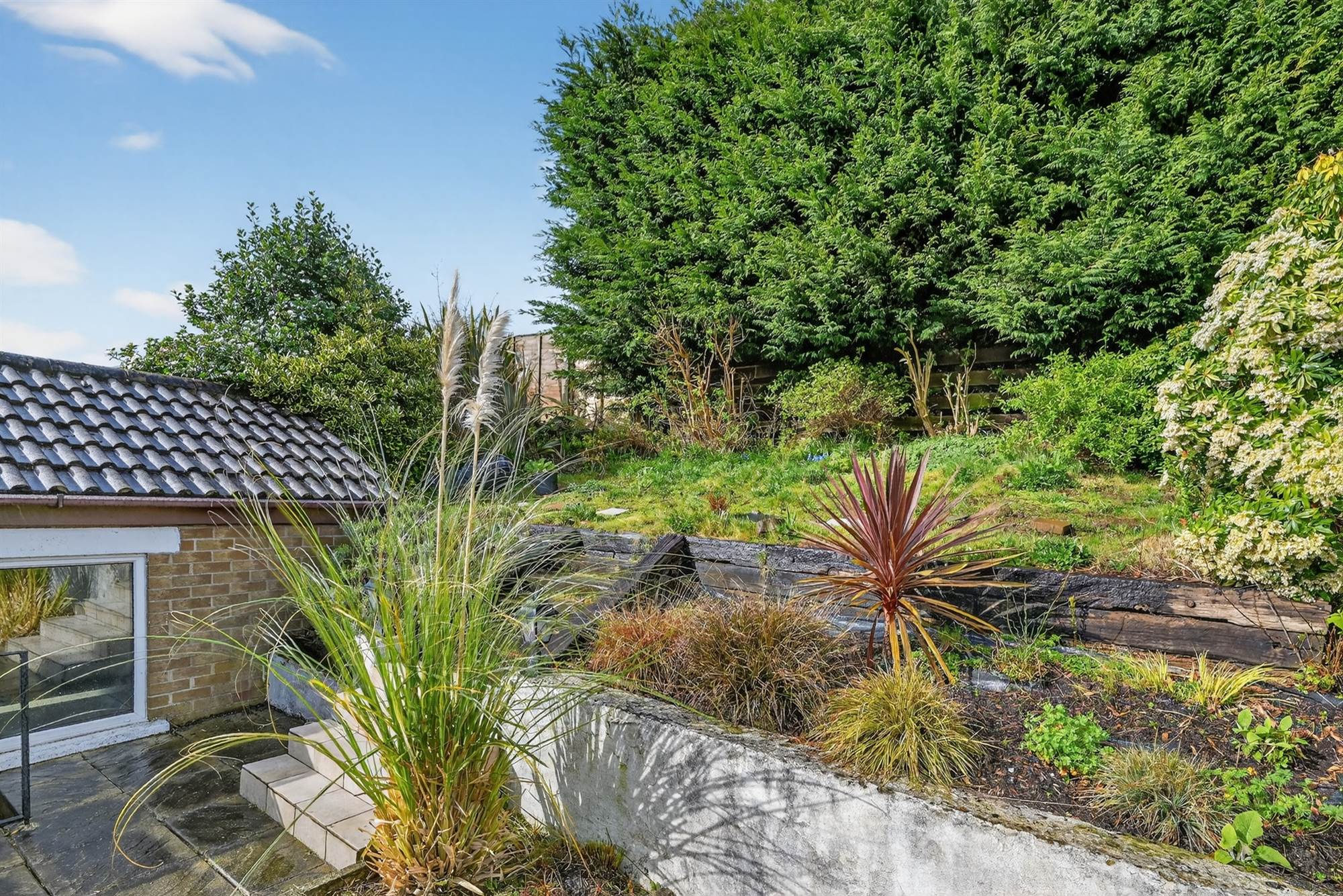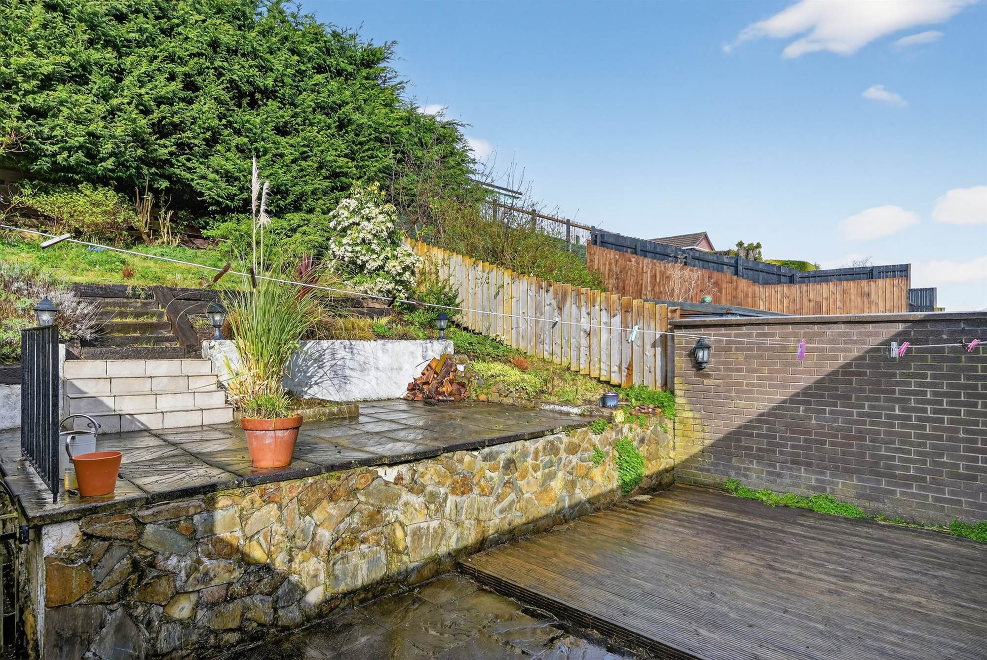 Enclosed, private rear garden, paved patio and timber decked area. Tiered garden with array of trees and shrubbery. Outside tap and light.