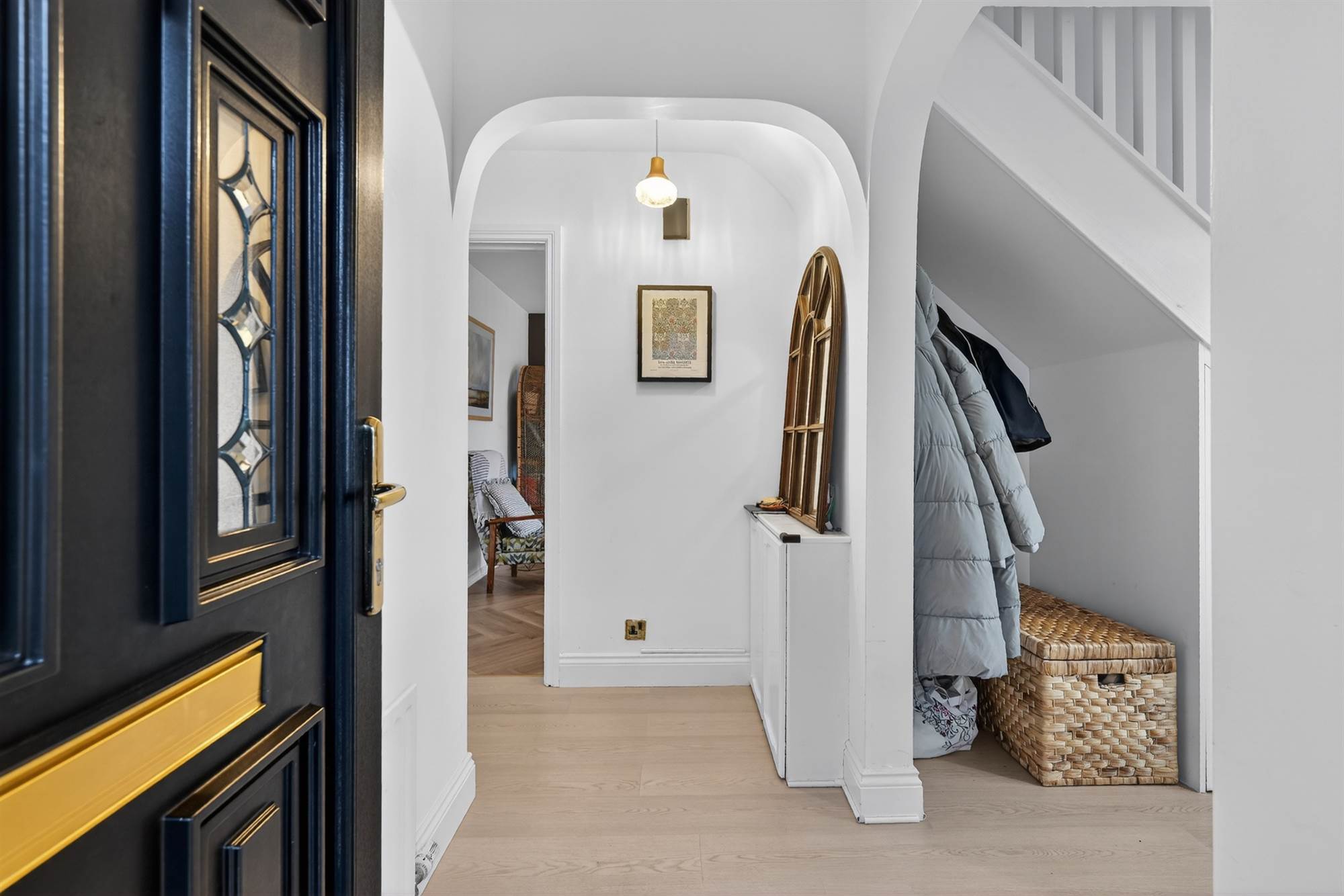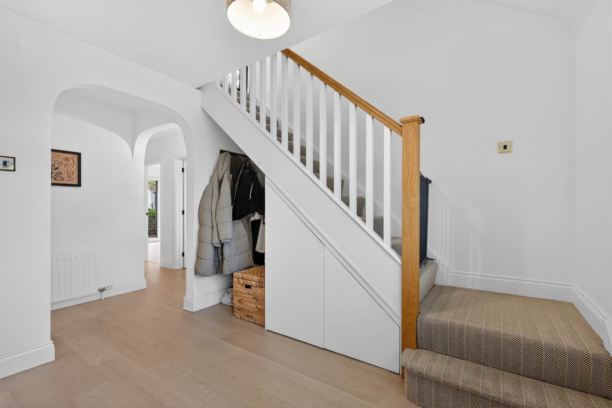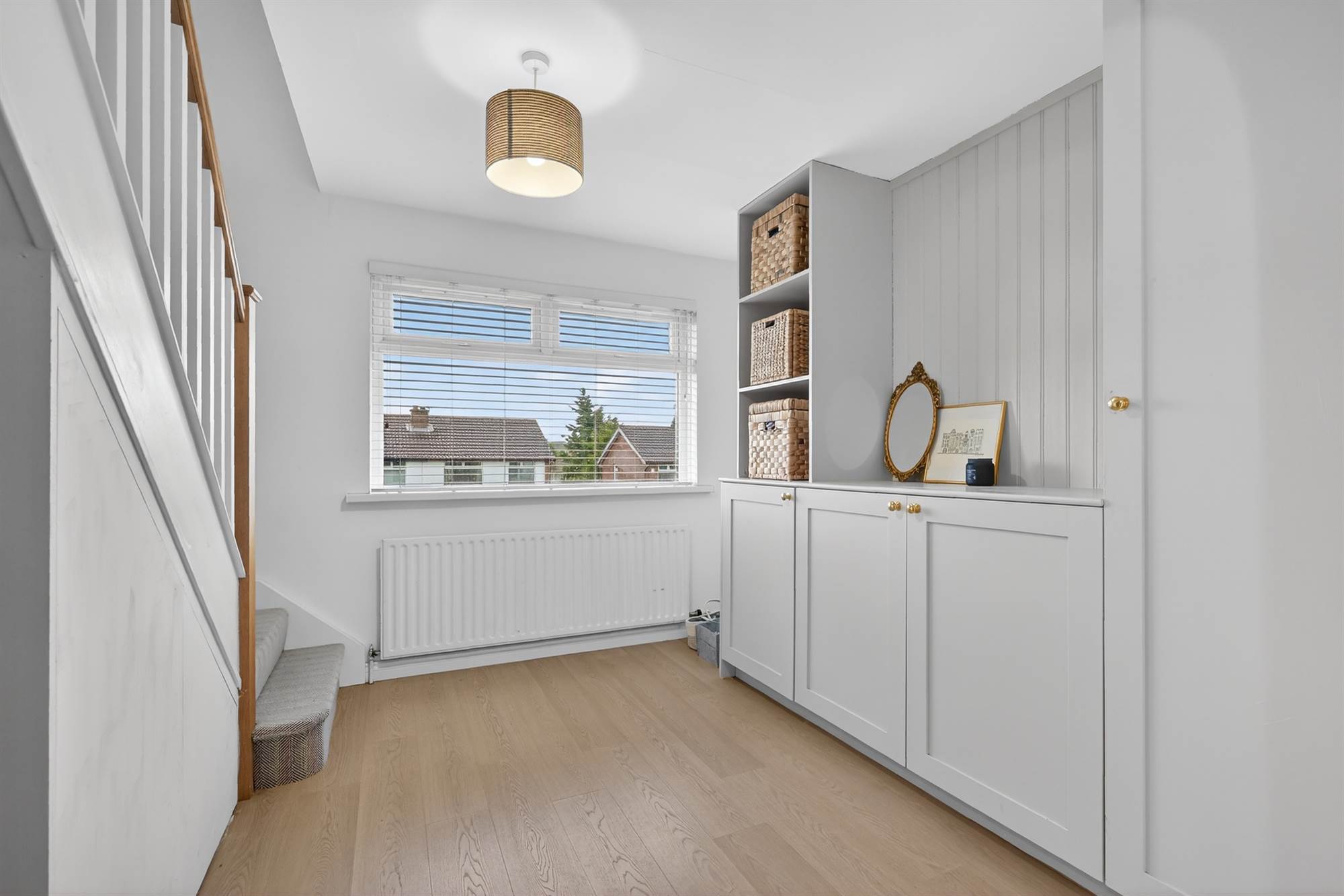 Oak effect laminate wooden floor. Storage alcove and drawers under stairs.