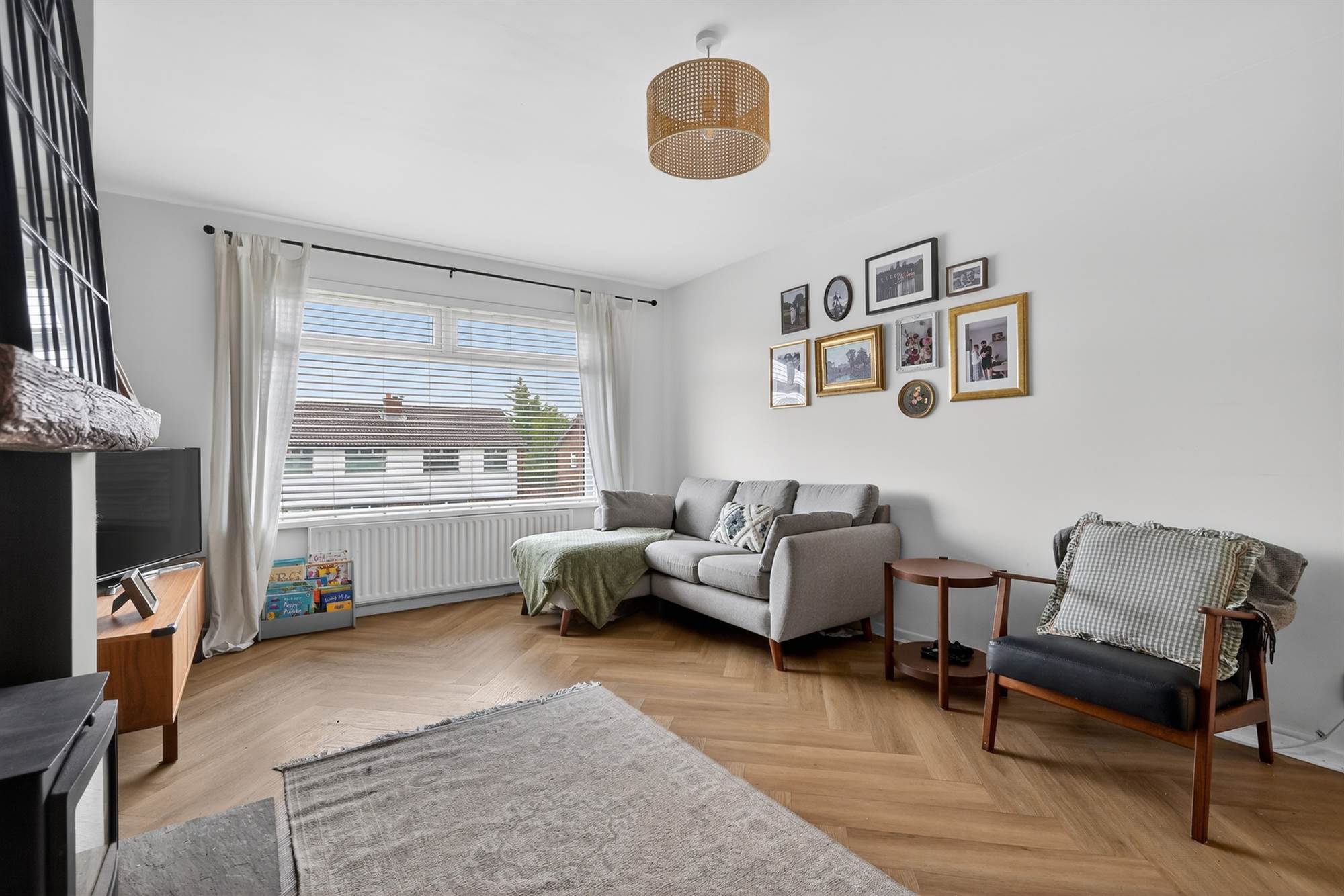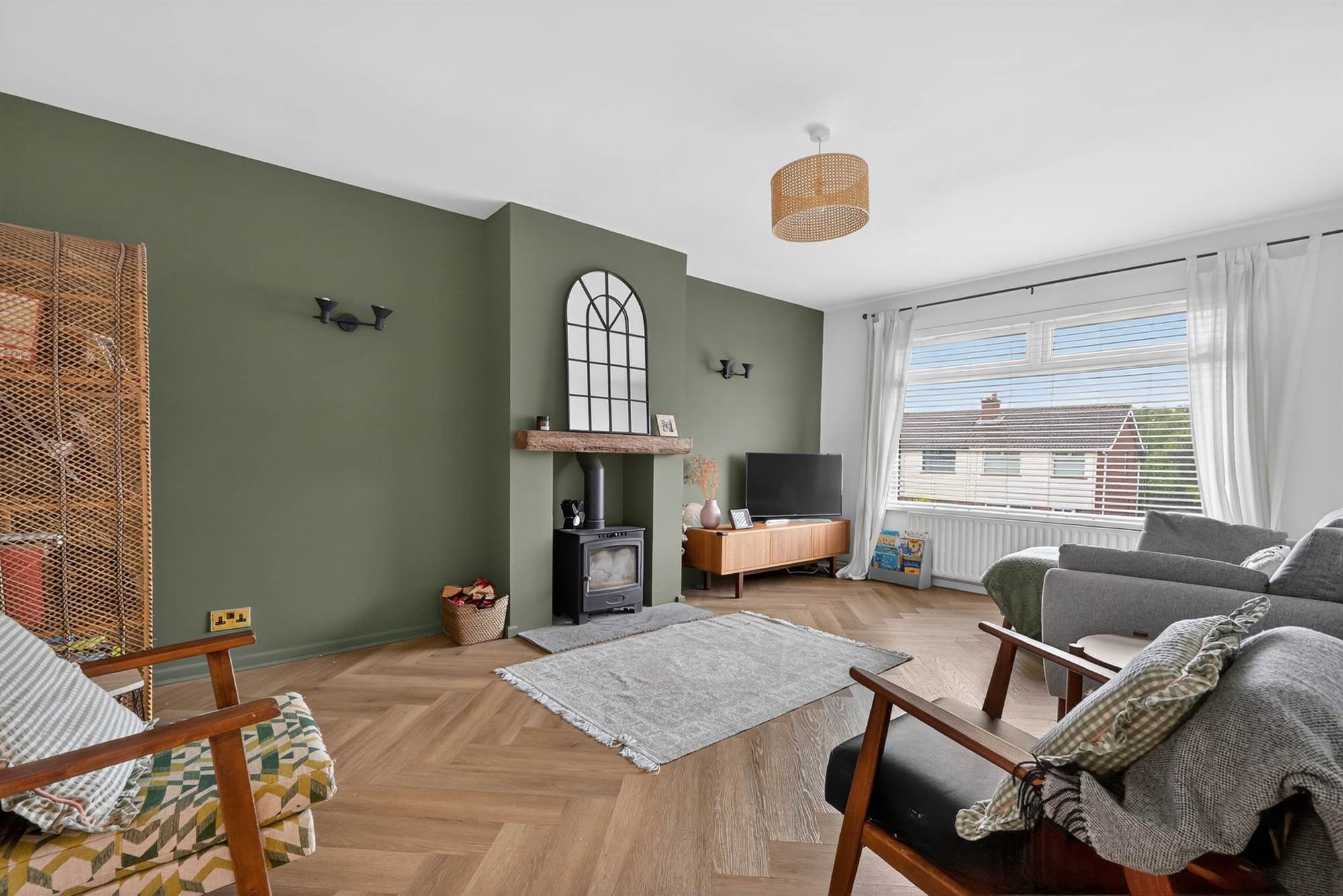 Feature wood burning stove with sleeper mantle and stone hearth, engineered oak herringbone wooden floor.