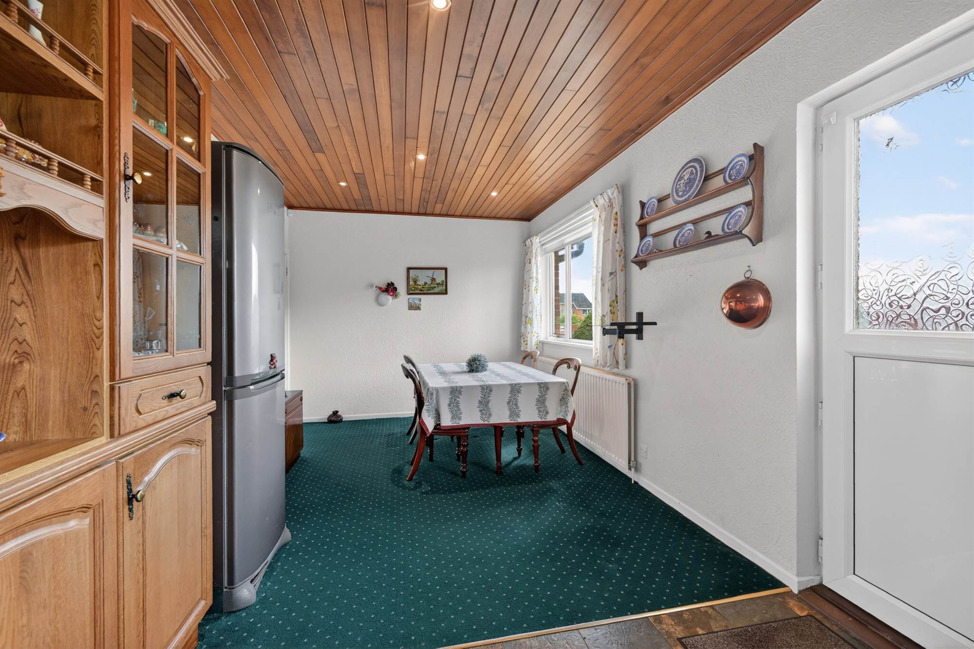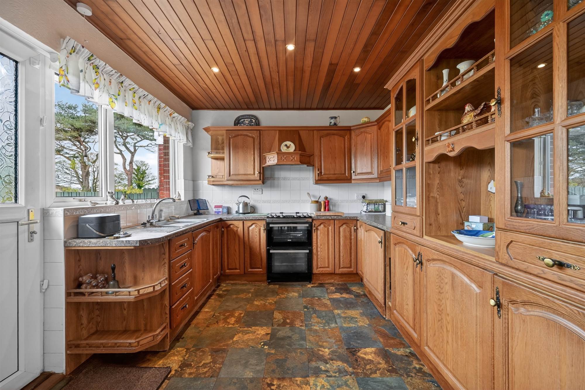 Oak kitchen with excellent range of high and low level units, laminate work surfaces, one and a half bowl stainless steel sink unit with mixer tap. Zanussi cooker, French dresser, Zanussi fridge/freezer, part tiled walls, tongue and groove ceiling, low voltage spotlights. Vinyl flooring, uPVC door to patio/garden.
