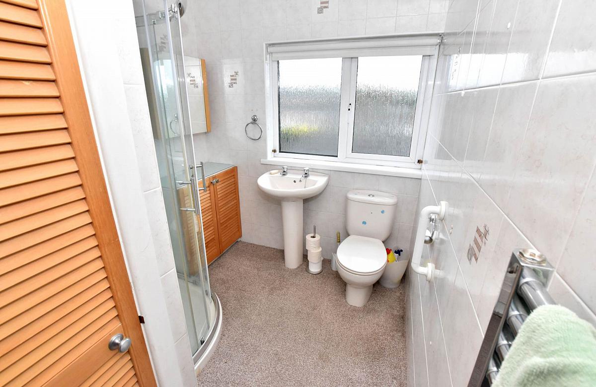Shower cubicle with electric shower. Pedestal wash hand basin. Low flush w.c. Full wall tiling. Airing cupboard.